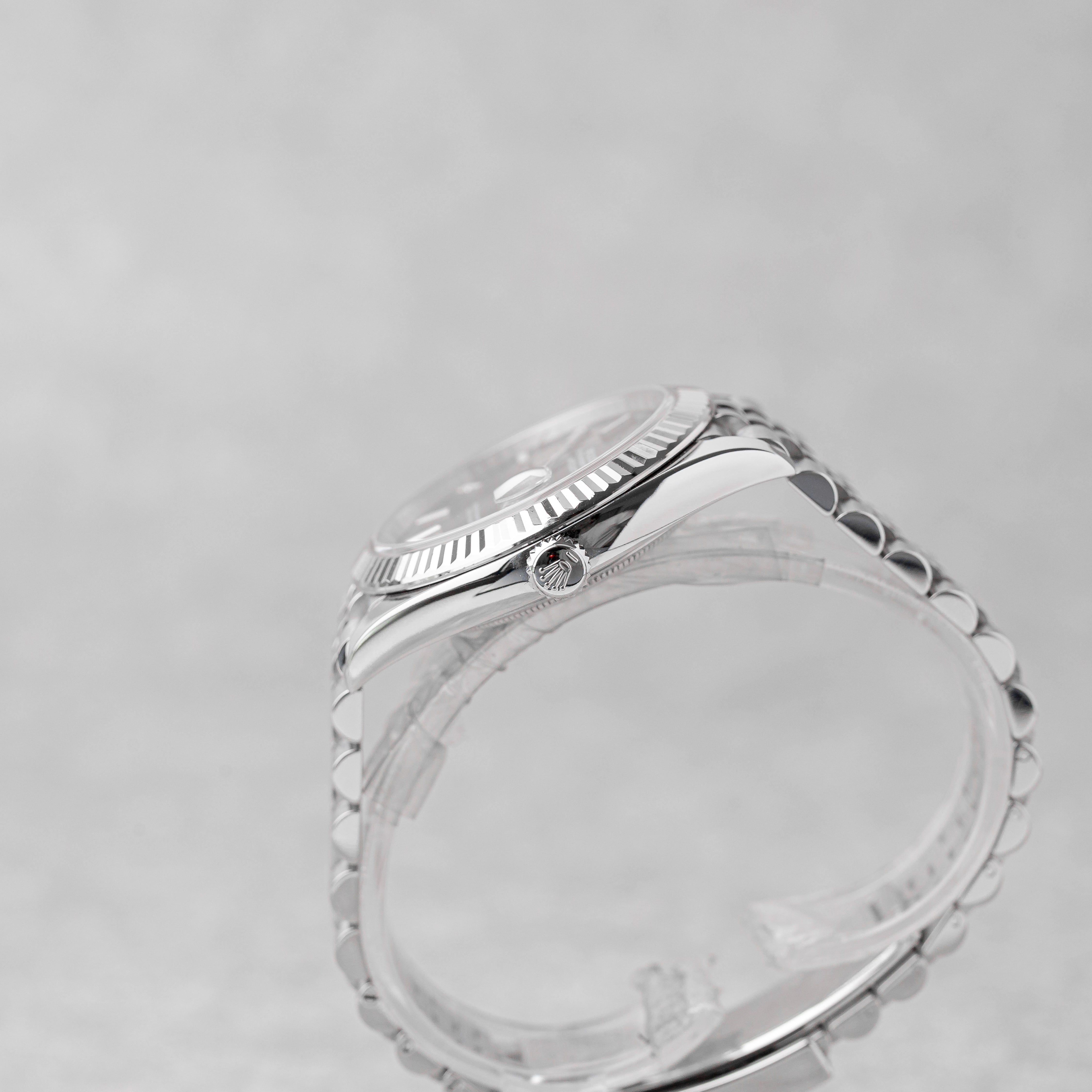 A refined and highly versatile configuration, this Rolex Datejust 41 features the elegant rhodium sunburst dial, offering subtle tones and depth depending on the light, paired with a white gold fluted bezel and the iconic Jubilee bracelet. This one-owner example comes as a Full Set, with full links, and is presented in very good condition. The movement has undergone a complete service by our watchmaker and is running perfectly. Offered with 12 months of guarantee from us, this is a perfect blend of modern Rolex sophistication and everyday wearability.
