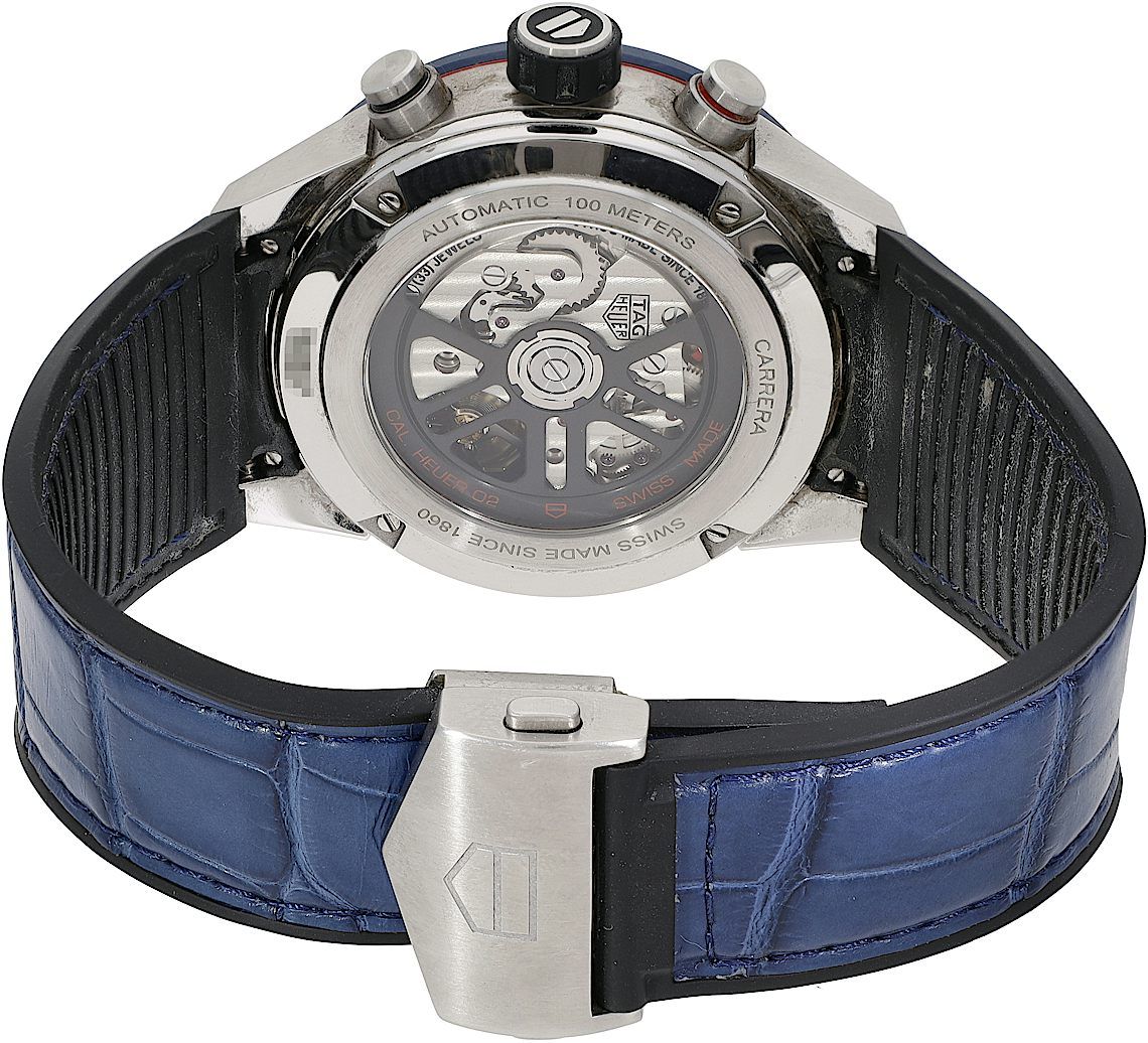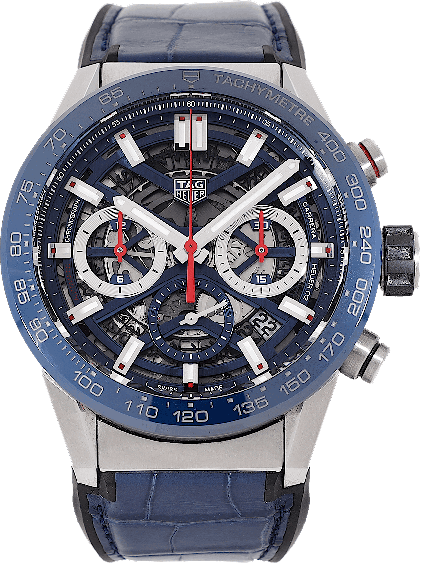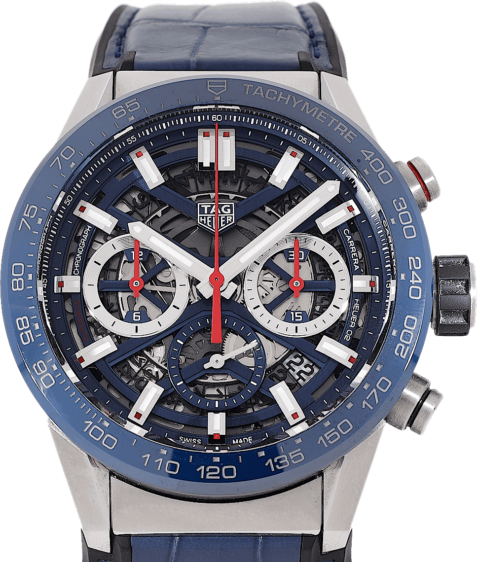 TAG Heuer Carrera, Reference: CBG2011.FC6430, Gender: Male, Size: 44mm, Dial color: Blue, Strap material: Rubber Alligator Leather, Movement: Automatic, Year: 2022, Condition: Previously worn, minor to no signs of usage. The movement is flawless and the case has been cleaned. watch tested ensure full functionality. An inspection by our certified watchmakers guarantees its authenticity., Documents: Original papers, CHRONEXT Certificate