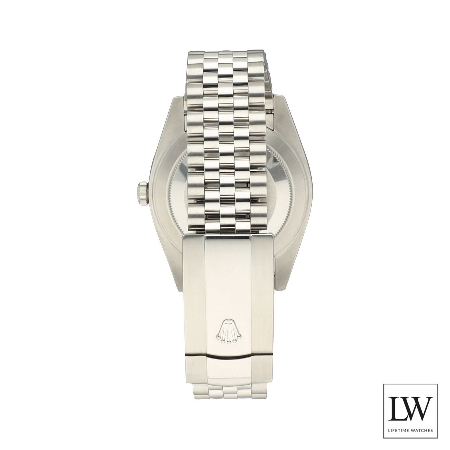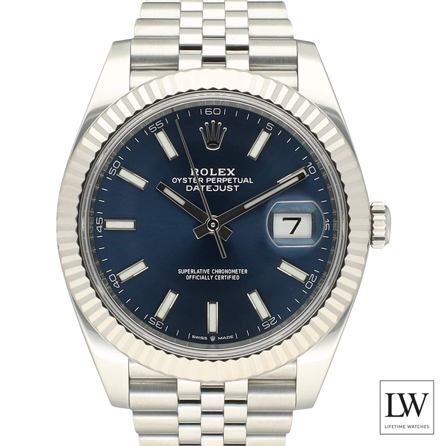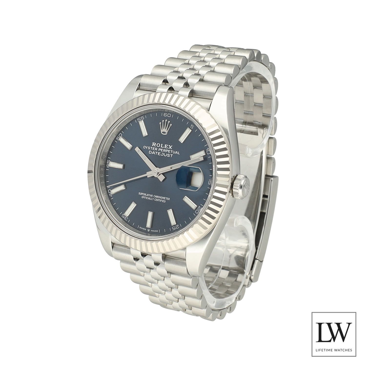 The 41 mm Oystersteel case is complemented by an 18-carat white gold fluted bezel and fitted with the iconic Jubilee bracelet, delivering exceptional comfort and classic Datejust elegance. Powered by the automatic Rolex caliber 3235, it offers outstanding precision, a quickset date function, and an impressive 70-hour power reserve.