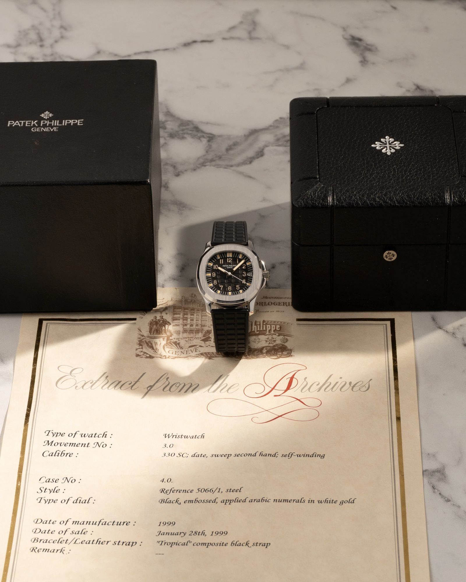 This exceptional and complete Patek Philippe Aquanaut 5066A in 36mm stainless steel is a fantastic example of the early Aquanaut series. Featuring beautifully aged tritium plots and tritium hands, a rare and increasingly sought-after detail among collectors.The watch is accompanied by its original inner and outer box, as well as the Extract from the Archives, confirming its original sale on January 28, 1999.