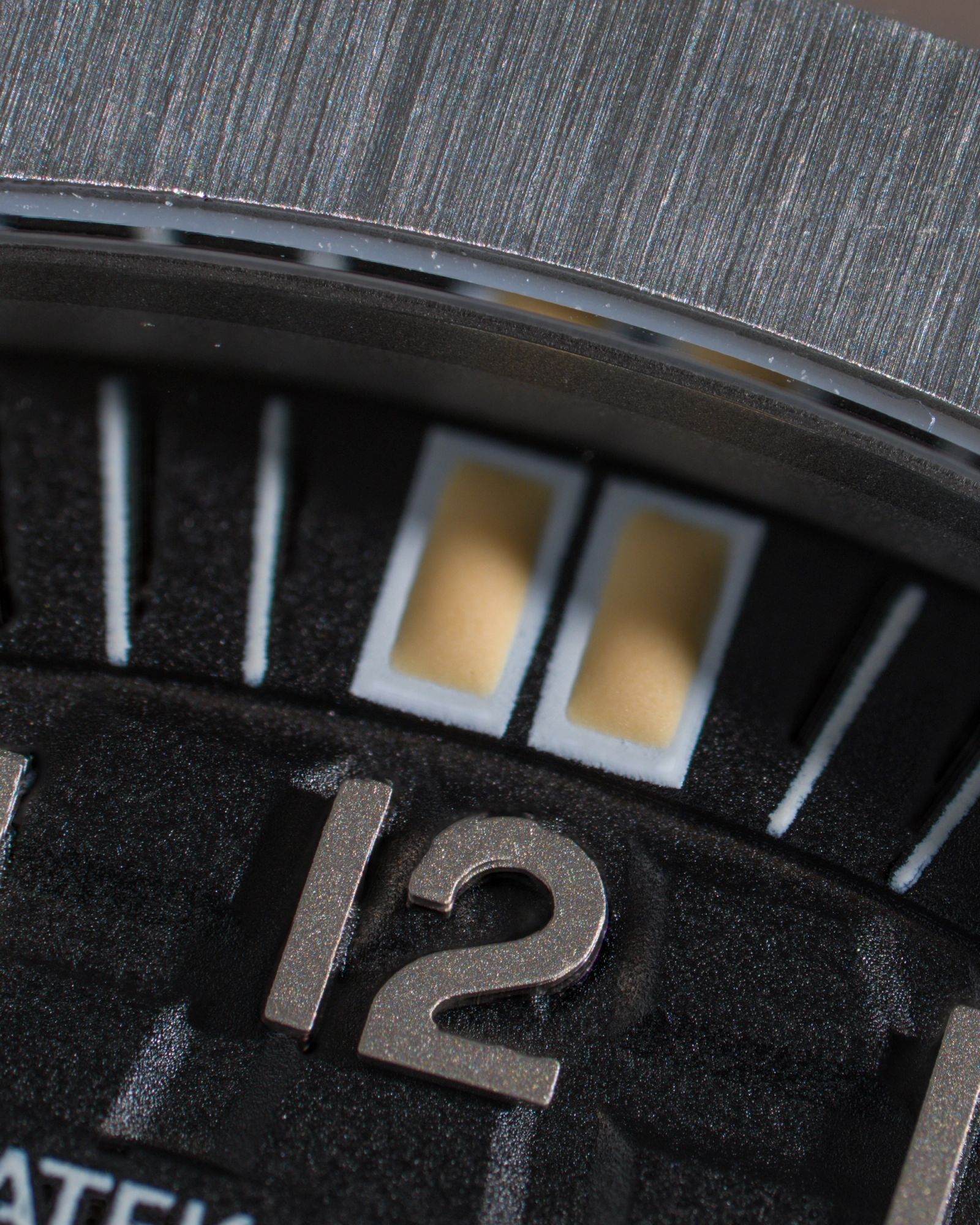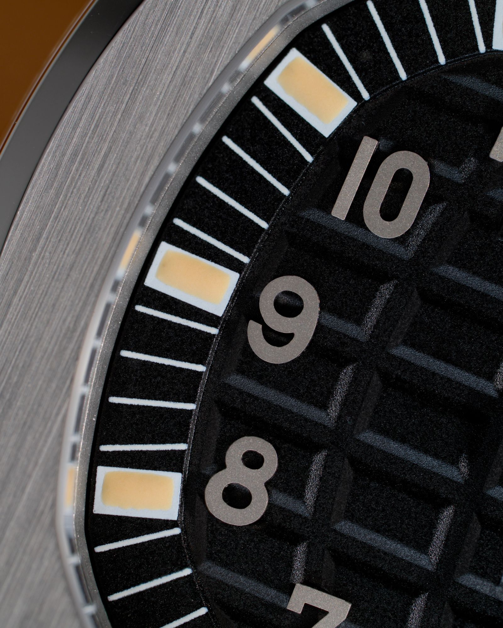O mostrador preto fosco apresenta o icônico padrão em relevo do Aquanaut, realçado por números arábicos aplicados em ouro branco preenchidos com trítio envelhecido naturalmente.
