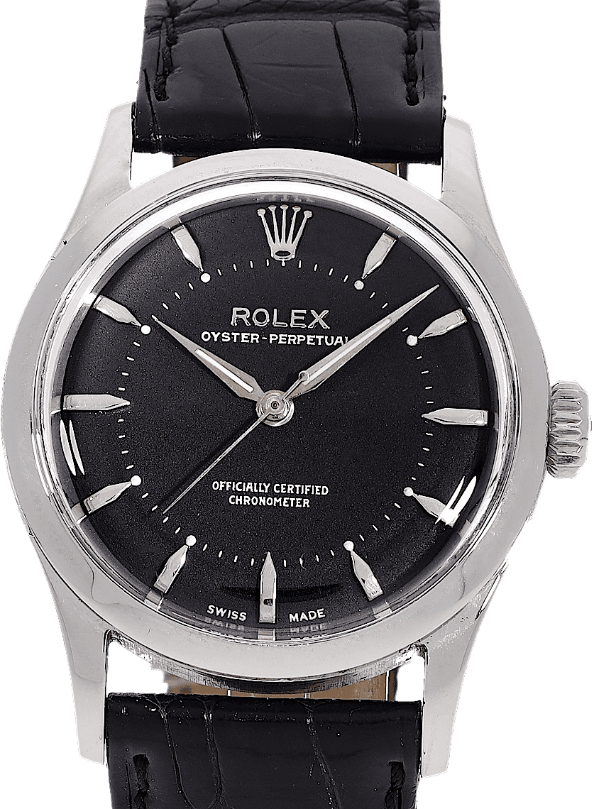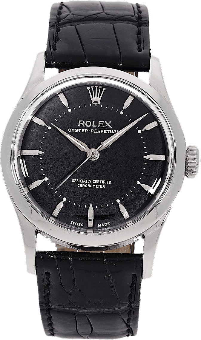 Rolex Oyster Perpetual, Reference: 6332, Gender: Female, Size: 33mm, Dial color: Black, Strap material: Alligator Leather, Movement: Automatic, Condition: Pre-owned watch in original condition. Has been inspected, regulated and authenticated by certified CHRONEXT watchmakers., Documents: Chronext Certificate
