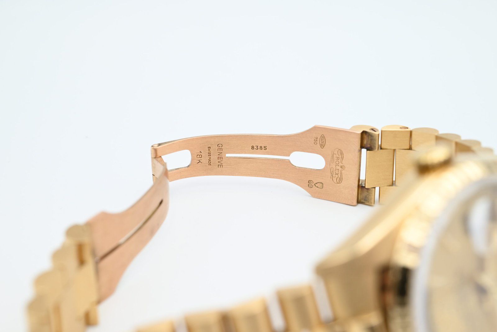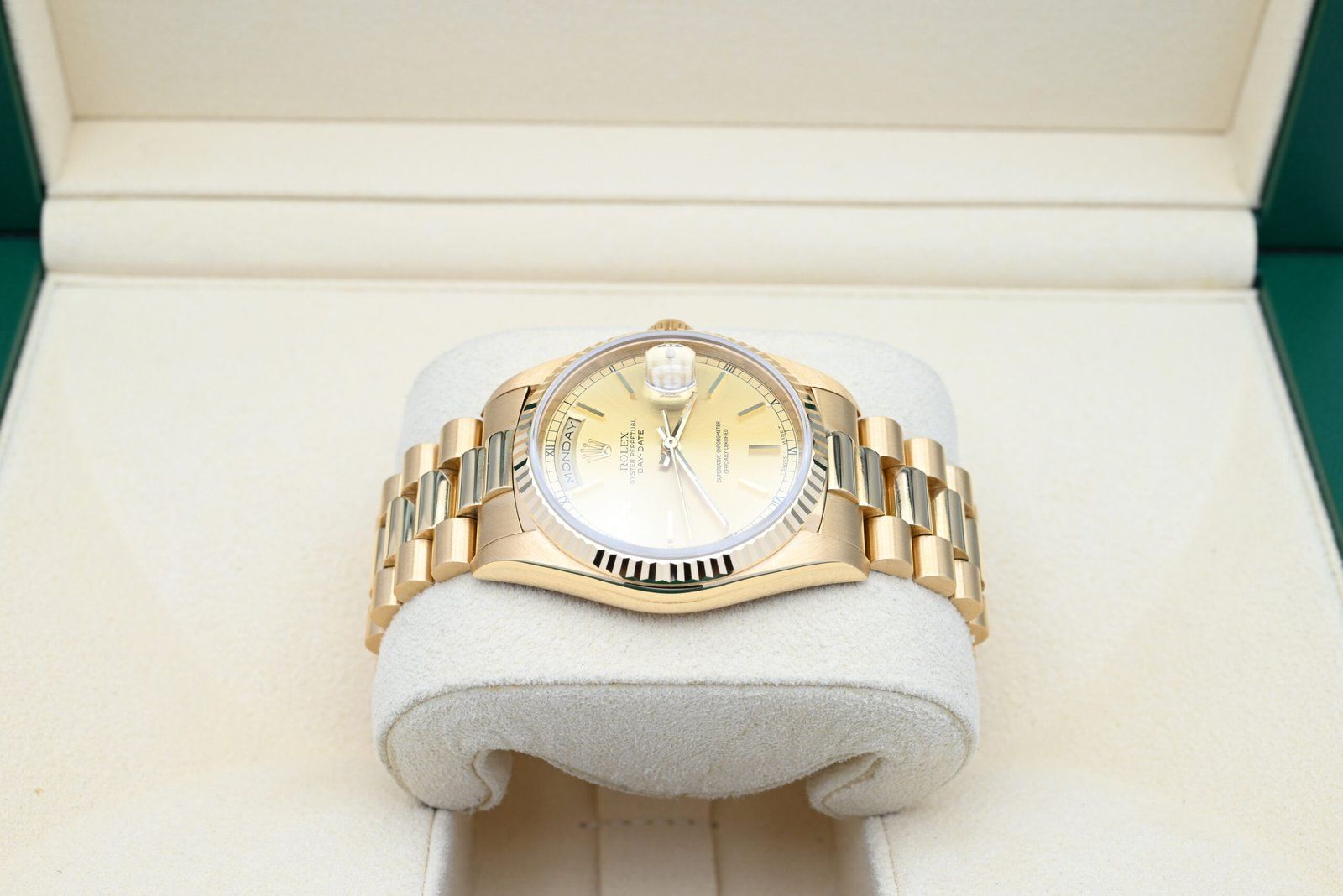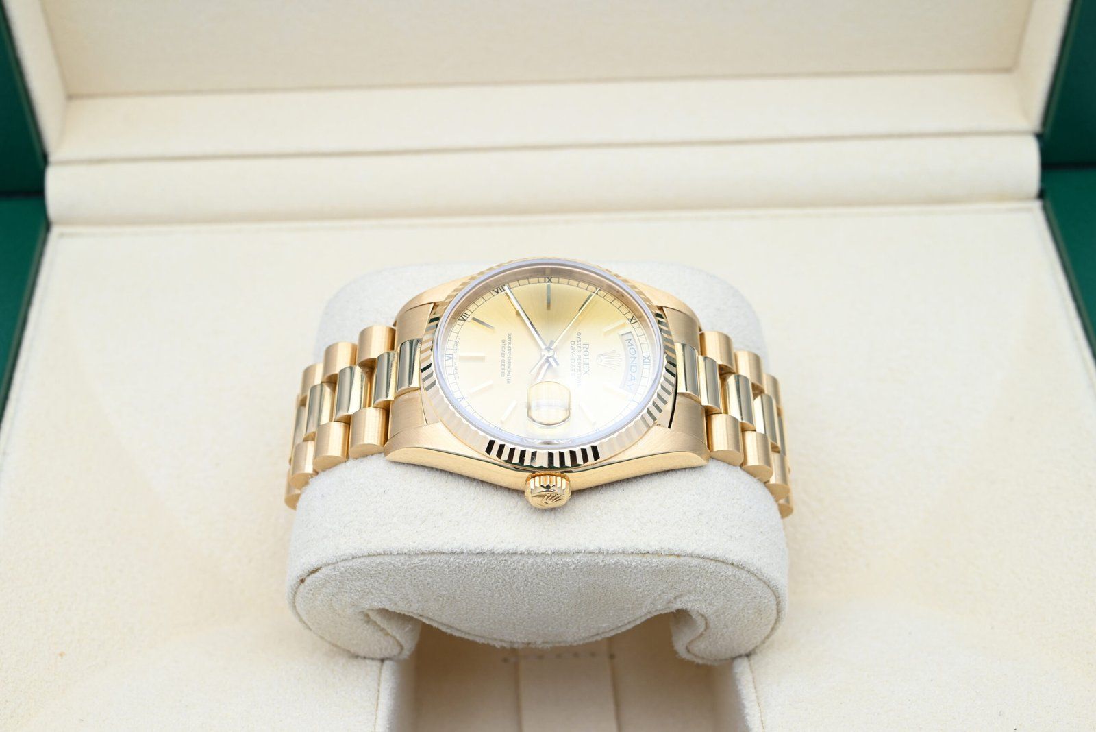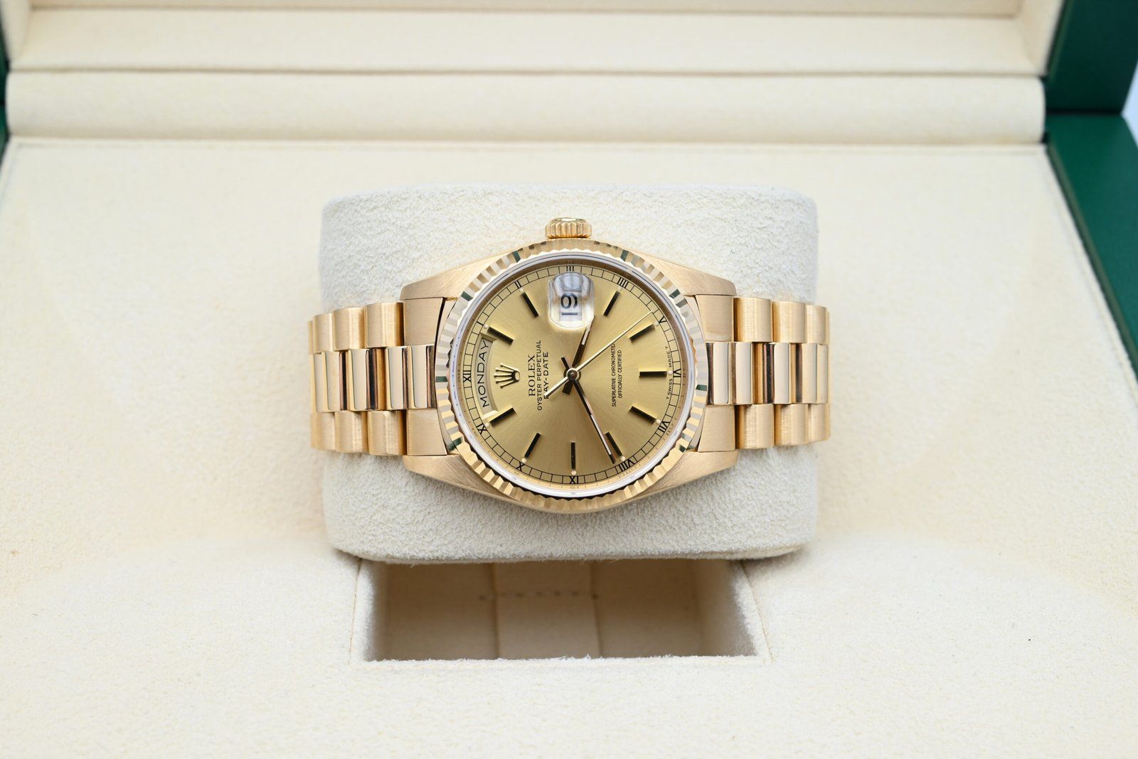 Rolex Day-Date 18238 de 1991 com o mostrador dourado em excelente estado, incluindo a caixa e os documentos originais. Todos os nossos relógios foram minuciosamente verificados pelo nosso próprio relojoeiro e revisados quando necessário.