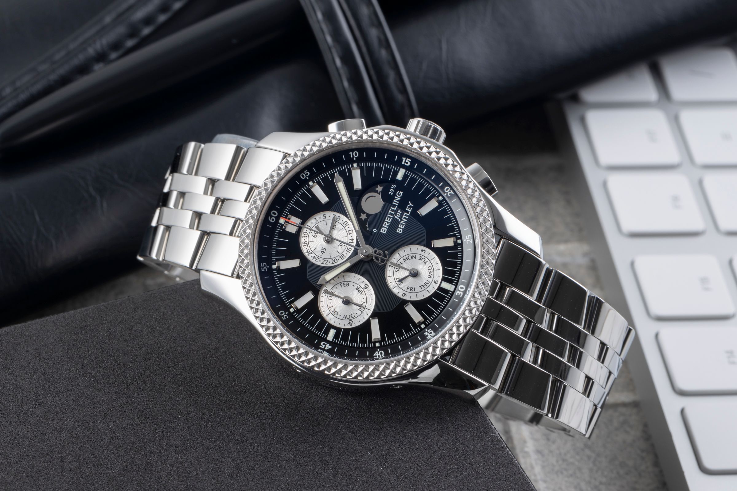 Brand: Breitling Model: Bentley Mark VI Type: men's watch construction: ~ 2008 Functions: Chronograph, Date, Month display, Moon phase, Weekday display Weight: 189.00 g Movement type: automatic Caliber: B19 Movement number: 2381xxx Case number: 2381xxx Reference number: P1936212/B977 Case material: steel / platinium Crystal: sapphire glass Dial color: black Accessories: New box as pictured, Original papers as pictured, Booklets as pictured Condition - Dial: very good condition - Crystal: very good condition - Case: very good condition - Bezel: very good condition - Case back: very good condition with minimal traces of use - Bracelet: very good condition with minimal traces of use - Movement: fully operational / checked for performance, authenticity and functionality Case Dimensions - Diameter: 42.00 mm - Height: 16.10 mm Bracelet - Material: steel - Max. wrist circumference: 200.00 mm - Clasp: supplied directly from the manufacturer We guarantee that the pictured item is an original Breitling watch. Alternative title: Breitling Bentley Mark VI Chronograph Stahl / Platin Ref P1936212/B977 Papiere [2506179]