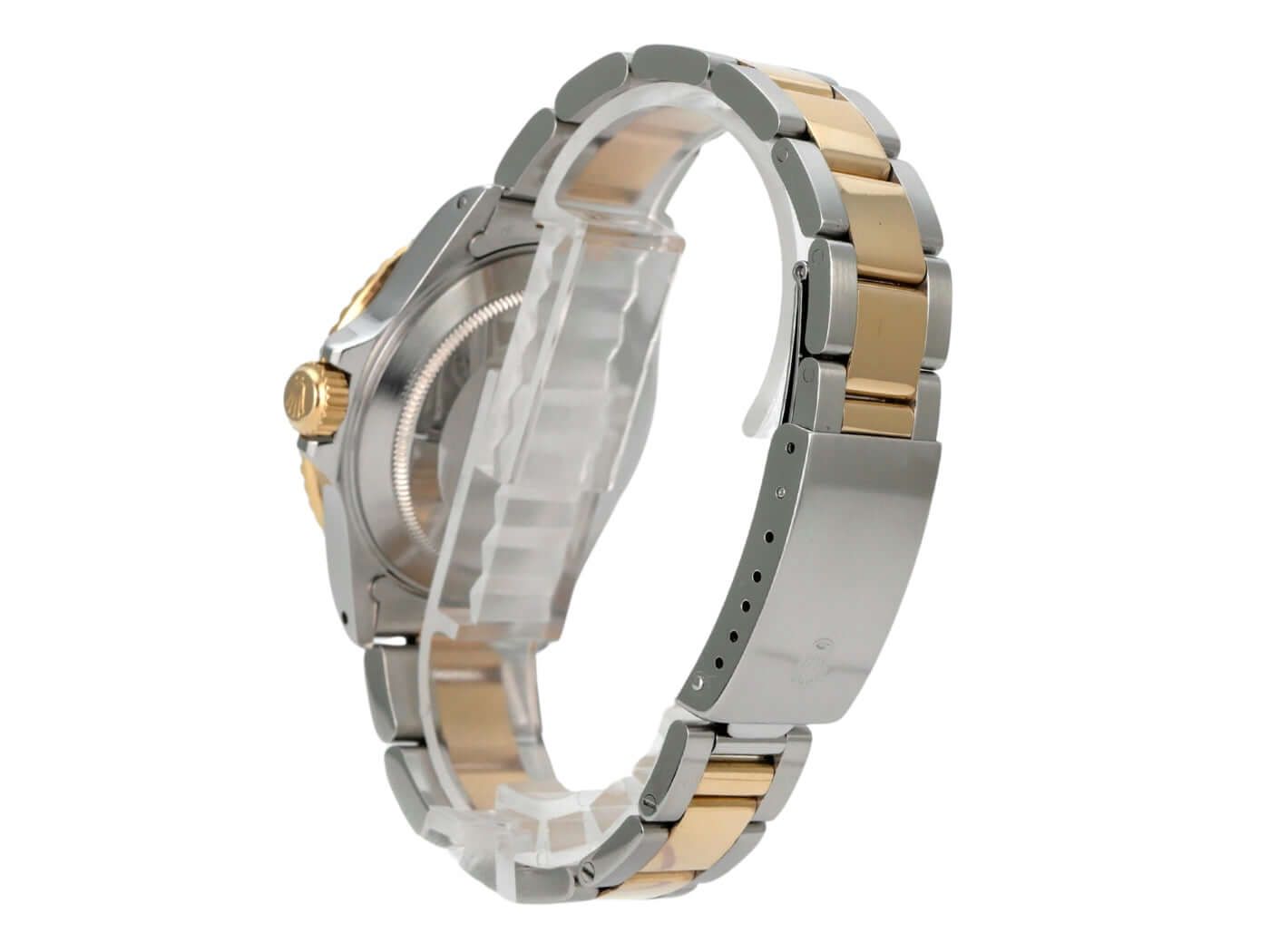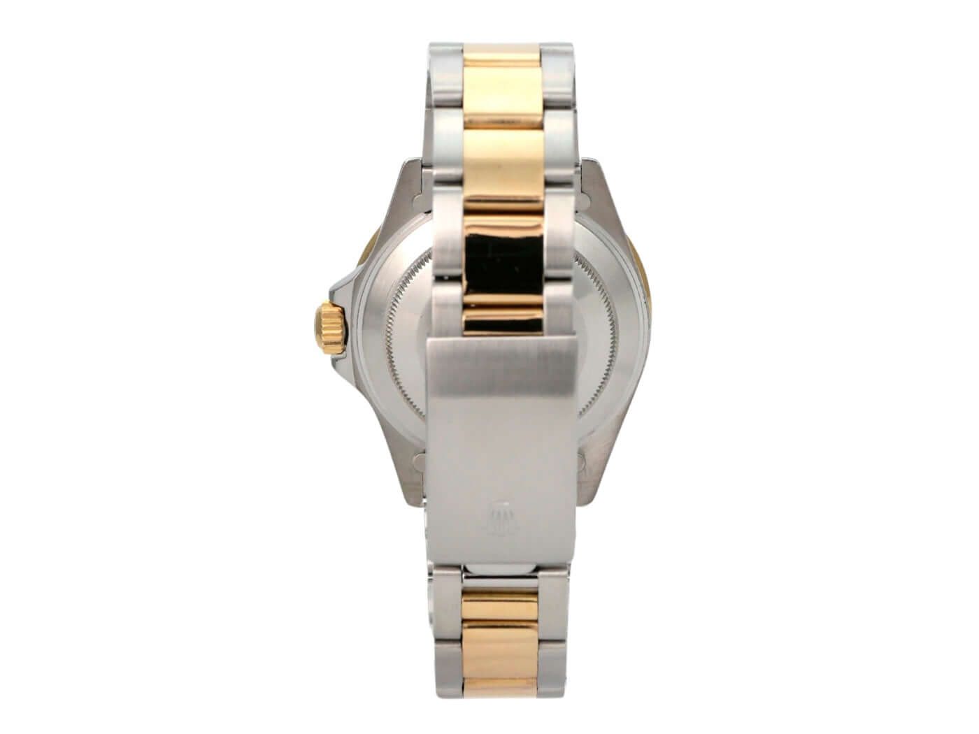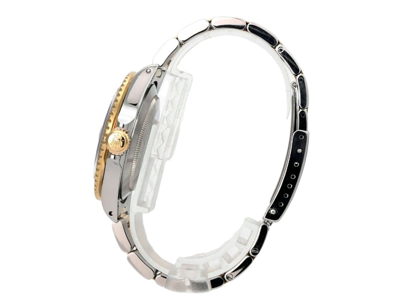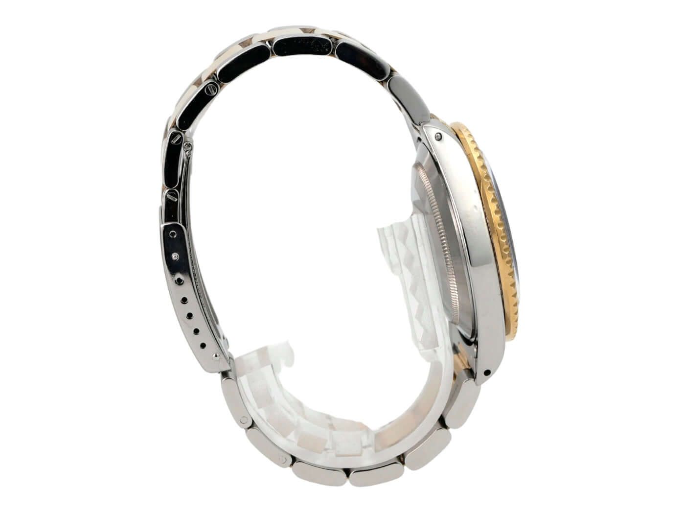 Caixa em aço inoxidável polido e acetinado, diâmetro da caixa de 40 mm, luneta em ouro amarelo giratória e estriada com inserto azul, escala de 60 minutos e ponto luminoso, pulseira Oyster em aço inoxidável/ouro amarelo com fecho dobrável, mostrador azul com índices luminosos aplicados e pontos luminosos, movimento automático, Rolex 3035, frequência de 28.800 A/h, reserva de marcha de aproximadamente 48 horas, data com lente de aumento às 3 horas, cronômetro, vidro de safira, coroa rosqueada com proteção lateral, fundo rosqueado em aço inoxidável, resistente à água até 20 bar. Relógio usado, em bom estado, completo com caixa e documentos, entrega de 1986.