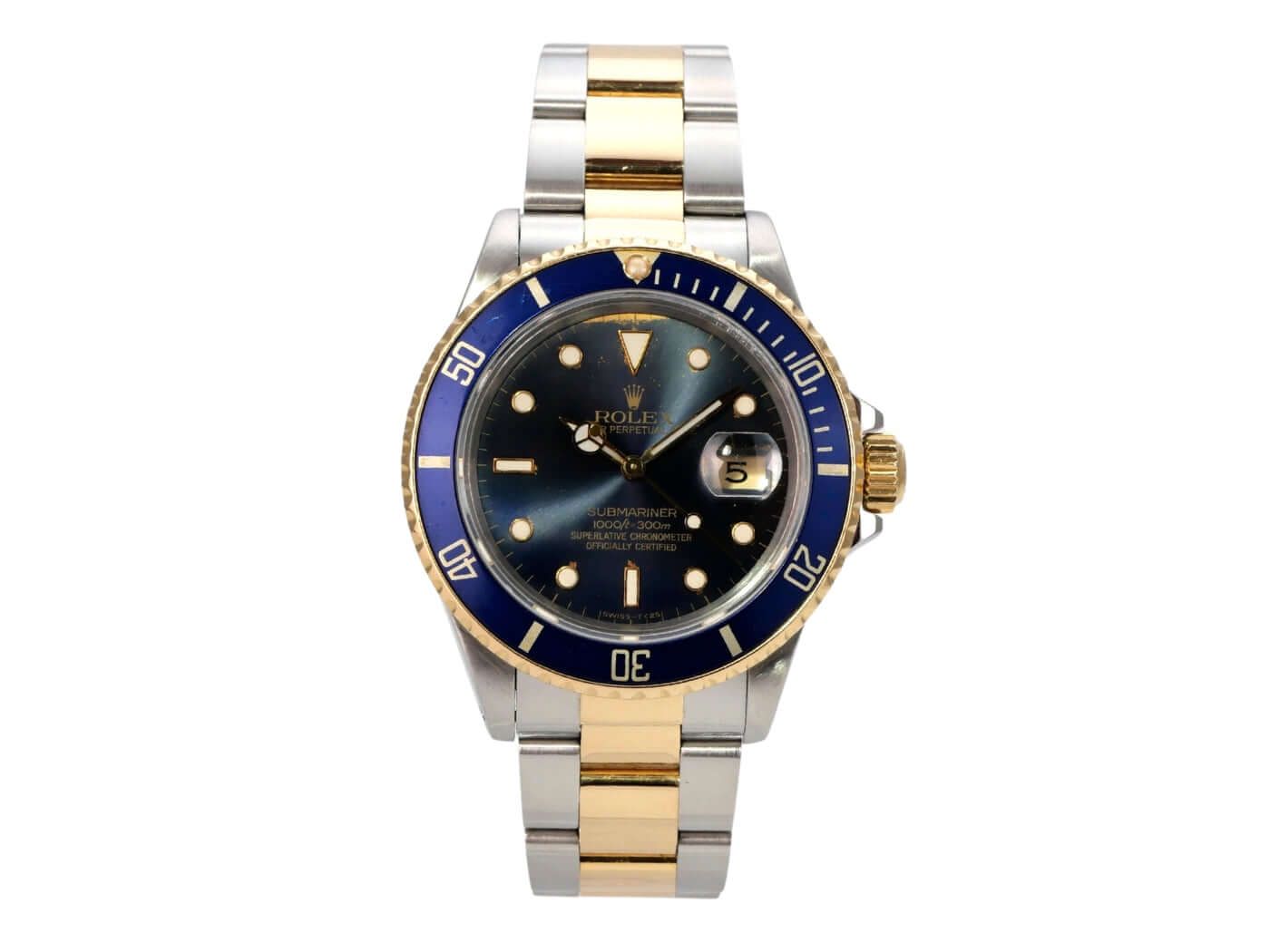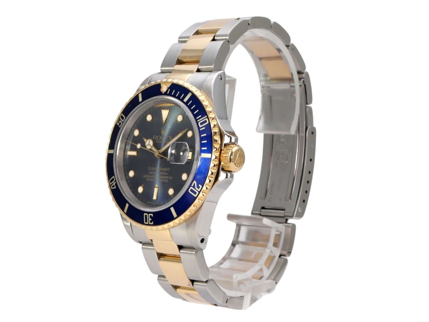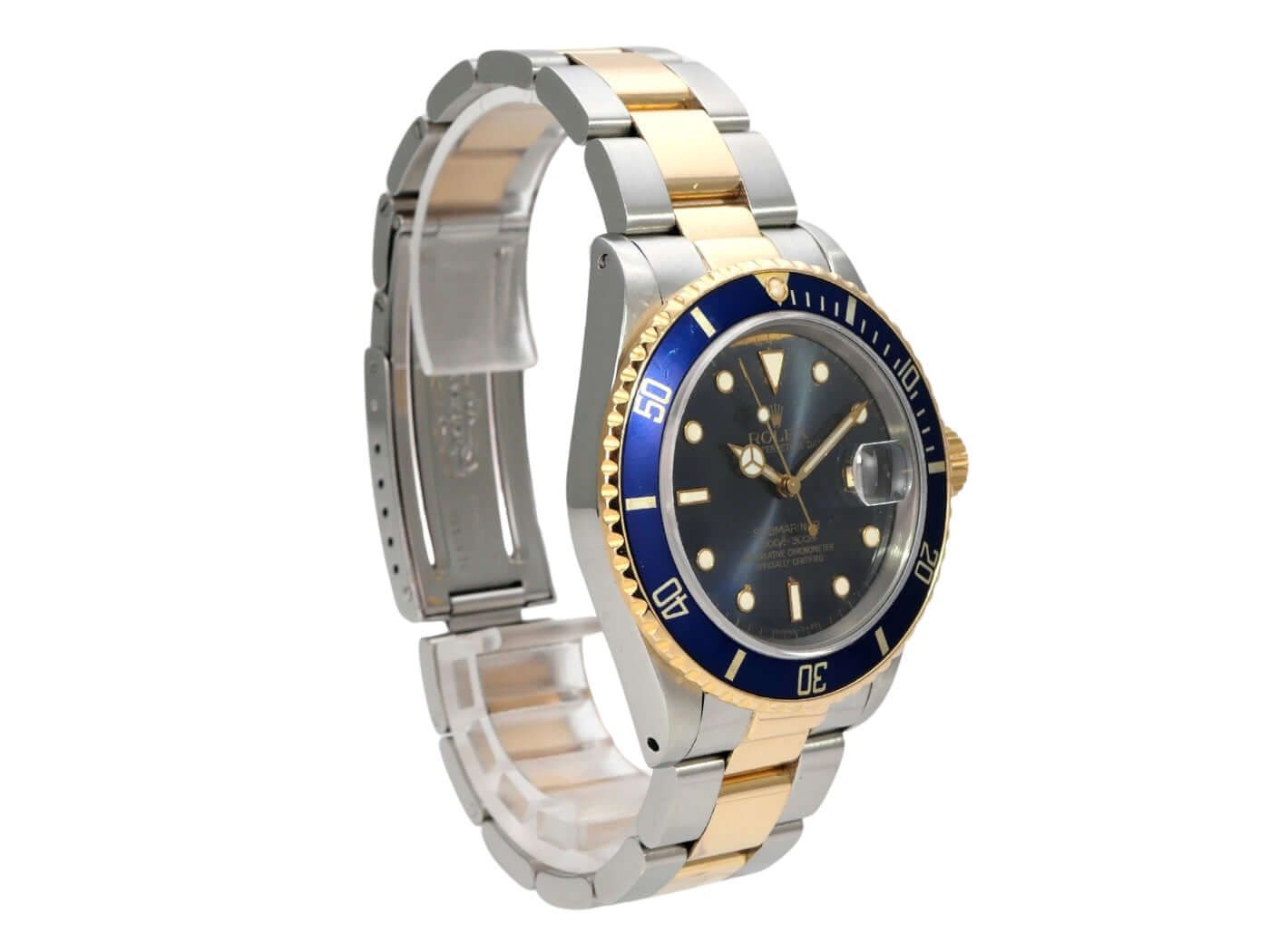 Rolex Submariner Date Ref. 16803 aus 1986 Gehäuse aus Edelstahl poliert und satiniert, Gehäusedurchmesser 40 mm, Gelbgold Lünette drehbar und geriffelt mit blauer Einlage, 60-Minuten-Skala und Leuchtpunkt, Oyster-Armband aus Edelstahl/Gelbgold mit Faltschließe, blaues Zifferblatt mit aufgesetzten Leuchtindizes und Leuchtpunkten, Automatikwerk, Rolex 3035, Schwingung 28.800 A/h, Gangreserve für ca. 48 Stunden, Datumsanzeige mit Glaslupe bei 3 Uhr, Chronometer, Saphirglas, verschraubbare Krone mit Flankenschutz, verschraubter Boden aus Edelstahl, wasserdicht bis zu 20 bar. Gebrauchte Uhr, guter Zustand, komplett mit Box und Papieren, Auslieferung aus 1986.