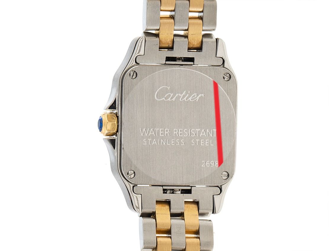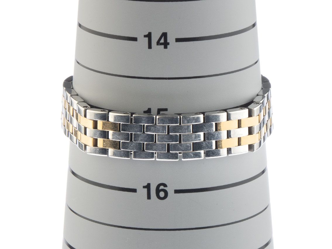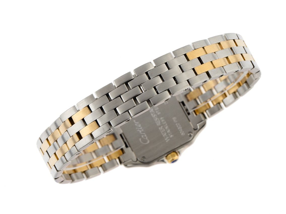 Caixa de aço inoxidável satinada, retangular, dimensões da caixa sem coroa 28 x 21mm, altura da caixa 5,6mm. Pulseira de aço inoxidável / ouro amarelo satinada e polida, fecho duplo oculto em aço inoxidável. Mostrador creme com números romanos pretos e ponteiros azulados. Movimento a quartzo, calibre Cartier Manufatura 157 com 4 pedras preciosas. Exibição de horas e minutos através de ponteiros centrais. Vidro de safira resistente a riscos. Coroa em ouro amarelo com pedra preciosa de safira e proteção lateral. Fundo em aço inoxidável, 4 vezes parafusado e gravado. Peso do relógio incluindo a pulseira 53g, comprimento da pulseira incluindo a caixa 155mm, veja a imagem número 8. Número de referência: 2698, número da caixa: 60046XXX, ID: P293563120426HW-6200, número do artigo: 10000085717. Com controle de marcha, nova bateria e revisão de abril de 2026. Caixa original Cartier e documentos de garantia de março de 2009, bem como descrição e extrato do Watch Register de abril de 2026, Certificado do Watch Register / sem registro (Banco de dados internacional para relógios perdidos ou roubados), Conjunto completo. Super oferta, investimento com potencial de valorização, de primeira mão, quase não usado. Muito bom estado. Prazo de entrega imediato. Inclui selo de certified pre owned / passaporte do relógio com uma imagem colorida, a descrição exata, bem como o valor de reposição do relógio acima de 6200,-€ e 1000 dias de garantia a partir da data de compra.