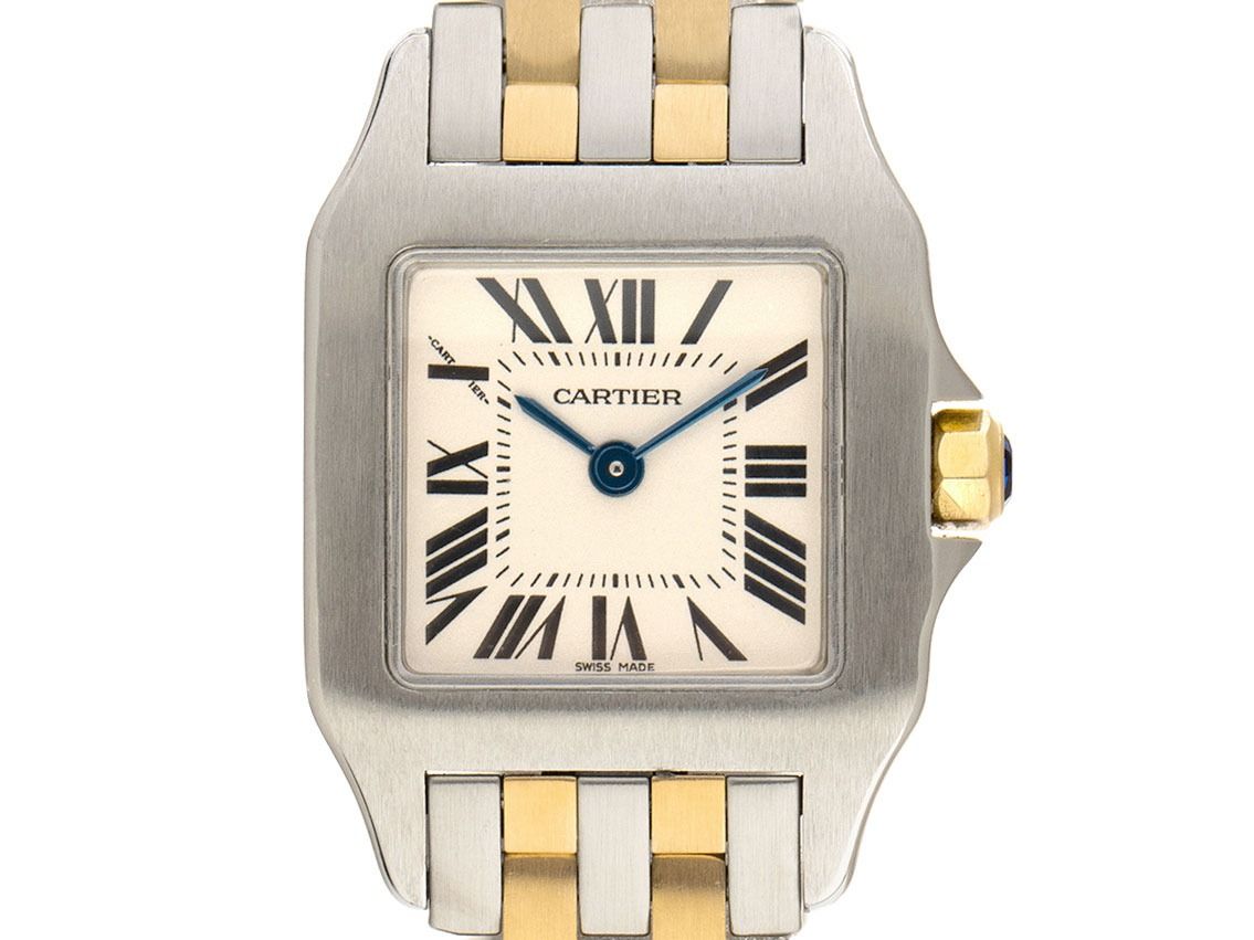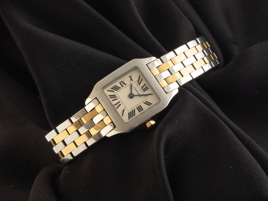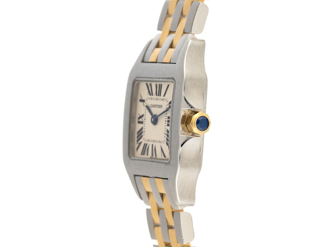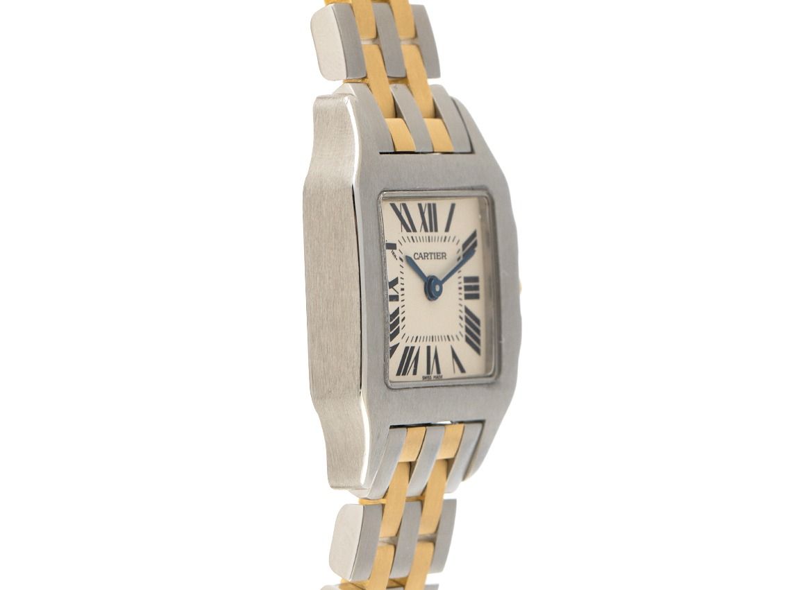 Cartier Santos Demoiselle Lady Stahl Gelbgold Quarz Armband Stahl Gelbgold Gehäuse Edelstahl satiniert, rechteckig, Gehäusemaße ohne Krone 28 x 21mm, Gehäusehöhe 5,6mm. Armband Edelstahl / Gelbgold satiniert und poliert, verdeckte Doppelfaltschließe Edelstahl. Zifferblatt cremeweiß mit schwarzen römischen Ziffern und gebläuten Zeigern. Uhrwerk quarzgesteuert, Cartier Manufakturkaliber 157 mit 4 Edelsteinen. Anzeige von Stunde und Minute über Zeiger aus der Mitte. Saphirglas kratzfest. Krone Gelbgold mit Saphir Edelstein und Flankenschutz. Boden Edelstahl 4-fach verschraubt und graviert. Gewicht der Uhr inklusive Armband 53g, Länge des Armbandes inklusive Gehäuse 155mm, siehe Bild Nummer 8. Referenznummer: 2698, Gehäusenummer: 60046XXX, ID: P293563120426HW-6200, Artikelnummer: 10000085717. Mit Gangkontrolle, neuer Batterie und Aufarbeitung von April 2026. Original Cartier Box und Garantie Papiere von März 2009 sowie Beschreibung und Watchregister Auszug von April 2026, The Watch Register Zertifikat / ohne Eintrag (Internationale Datenbank für verlorene oder gestohlene Uhren), Full Set. Superschnäppchen, Kapitalanlage mit Wertsteigerungspotential, aus erster Hand, fast nicht getragen. Sehr guter Zustand. Lieferzeit sofort. Inklusive certified pre owned Siegel / Uhrenpass mit einem Farbbild, der genauen Beschreibung sowie dem Wiederbeschaffungswert der Uhr über 6200,-€ und 1000 Tage Garantie ab Kaufdatum.