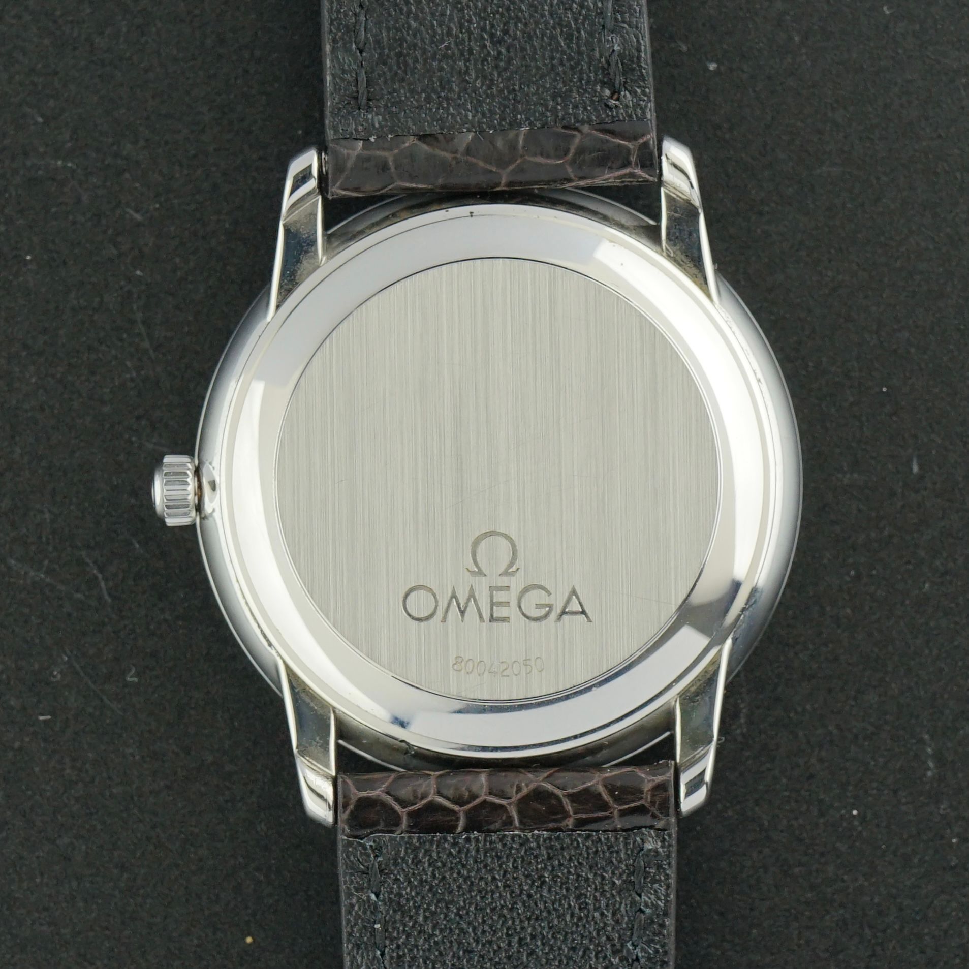 Strap: A top-grain brown leather strap with a crocodile motif and the Original Omega buckle. (Fits a 13 to 21cm wrist)