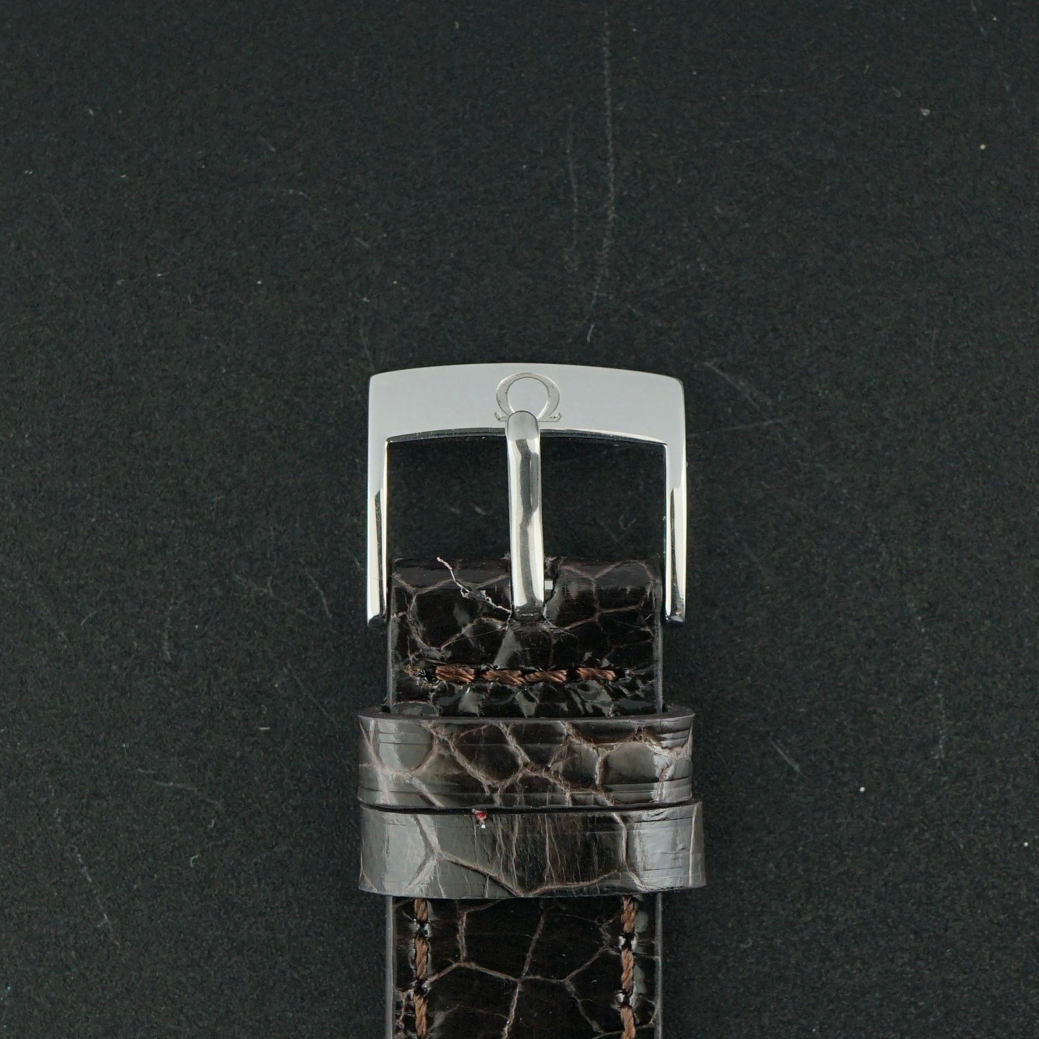 Pulseira: Uma pulseira de couro marrom de grão superior com motivo de crocodilo e a fivela original da Omega. (Serve para pulsos de 13 a 21cm)