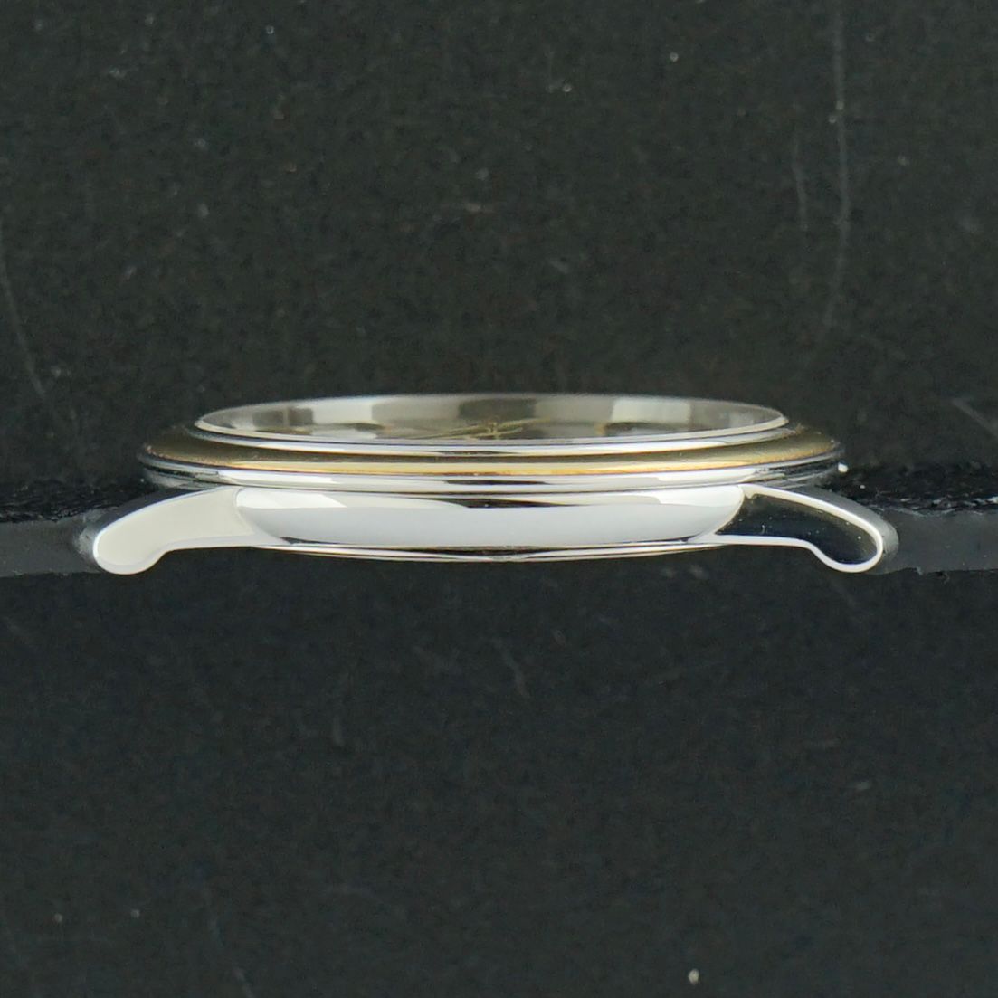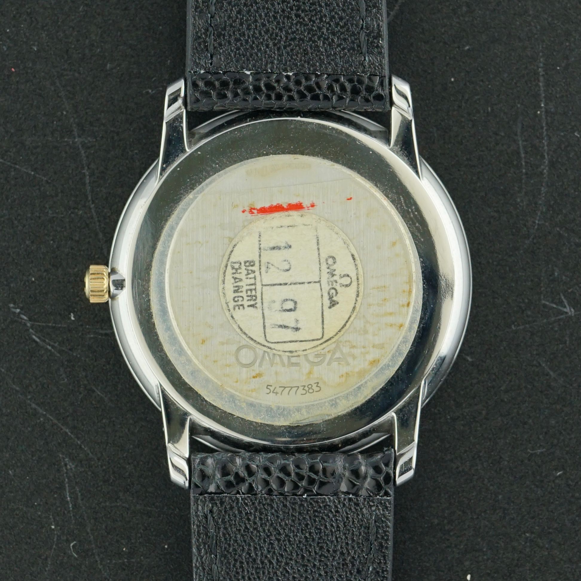 Strap: A top-grain black leather strap with a crocodile motif and the Original Omega buckle. (Fits a 13 to 21cm wrist)