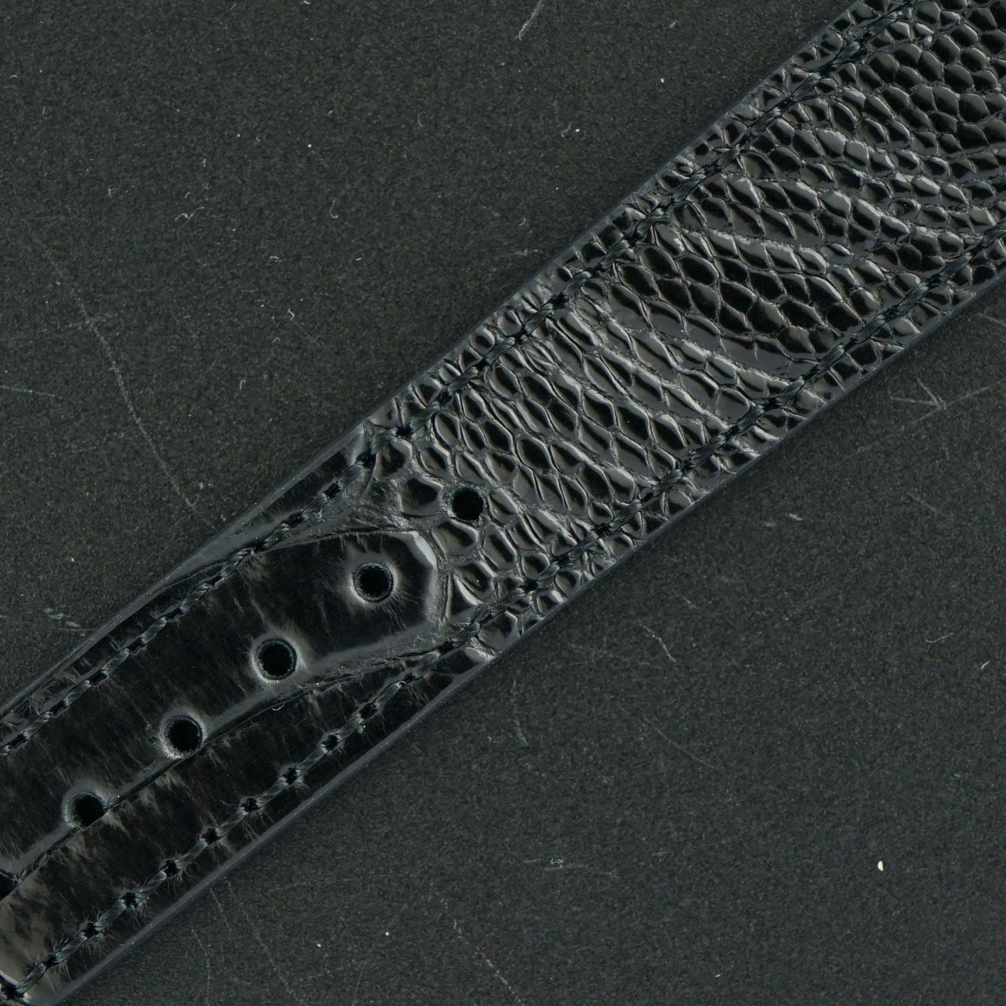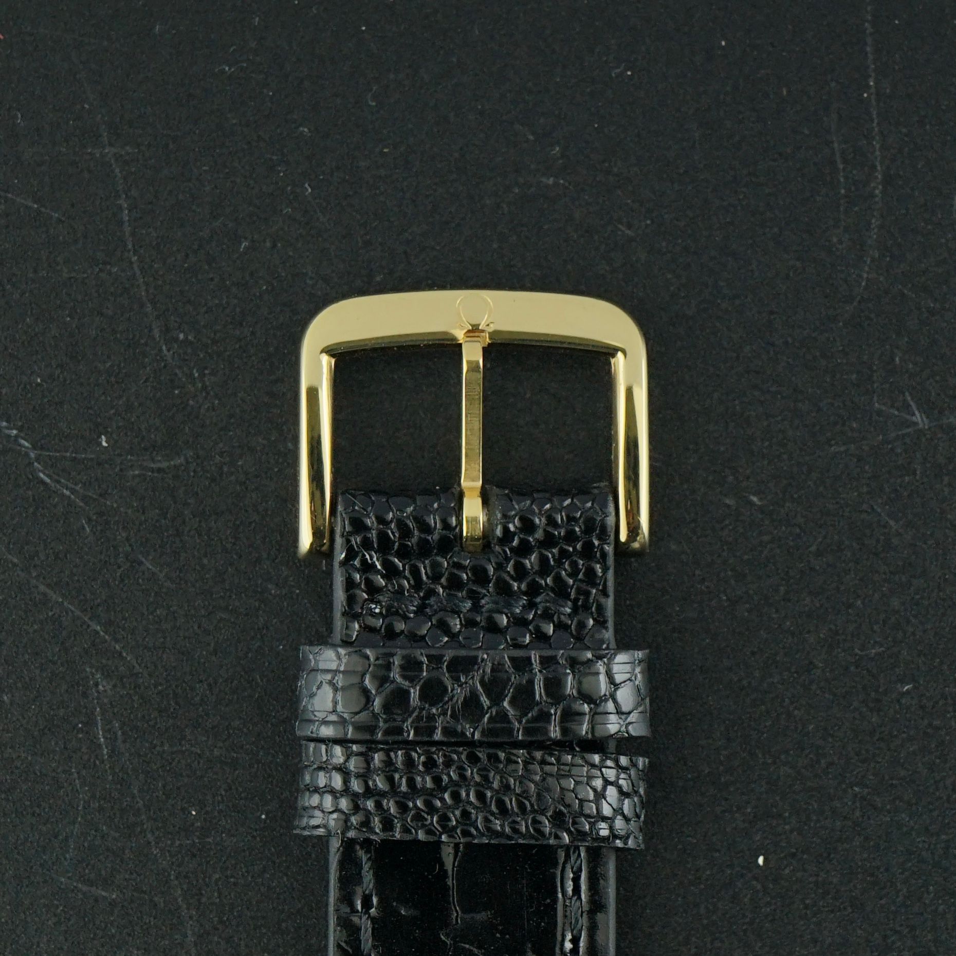 Pulseira: Uma pulseira de couro preto de grão superior com motivo de crocodilo e a fivela original Omega. (Serve para pulsos de 13 a 21cm)