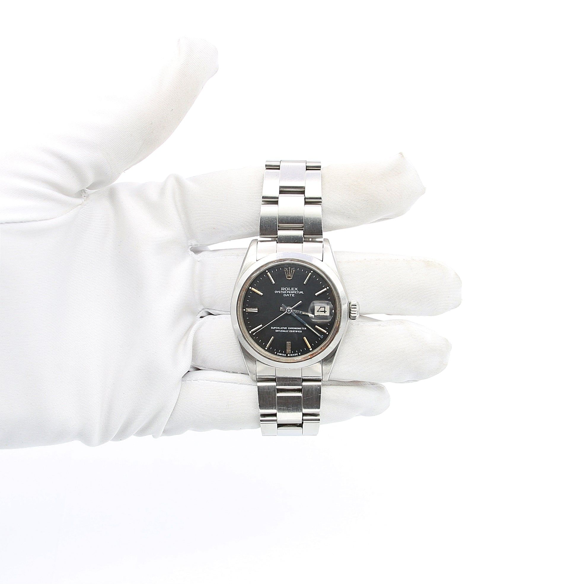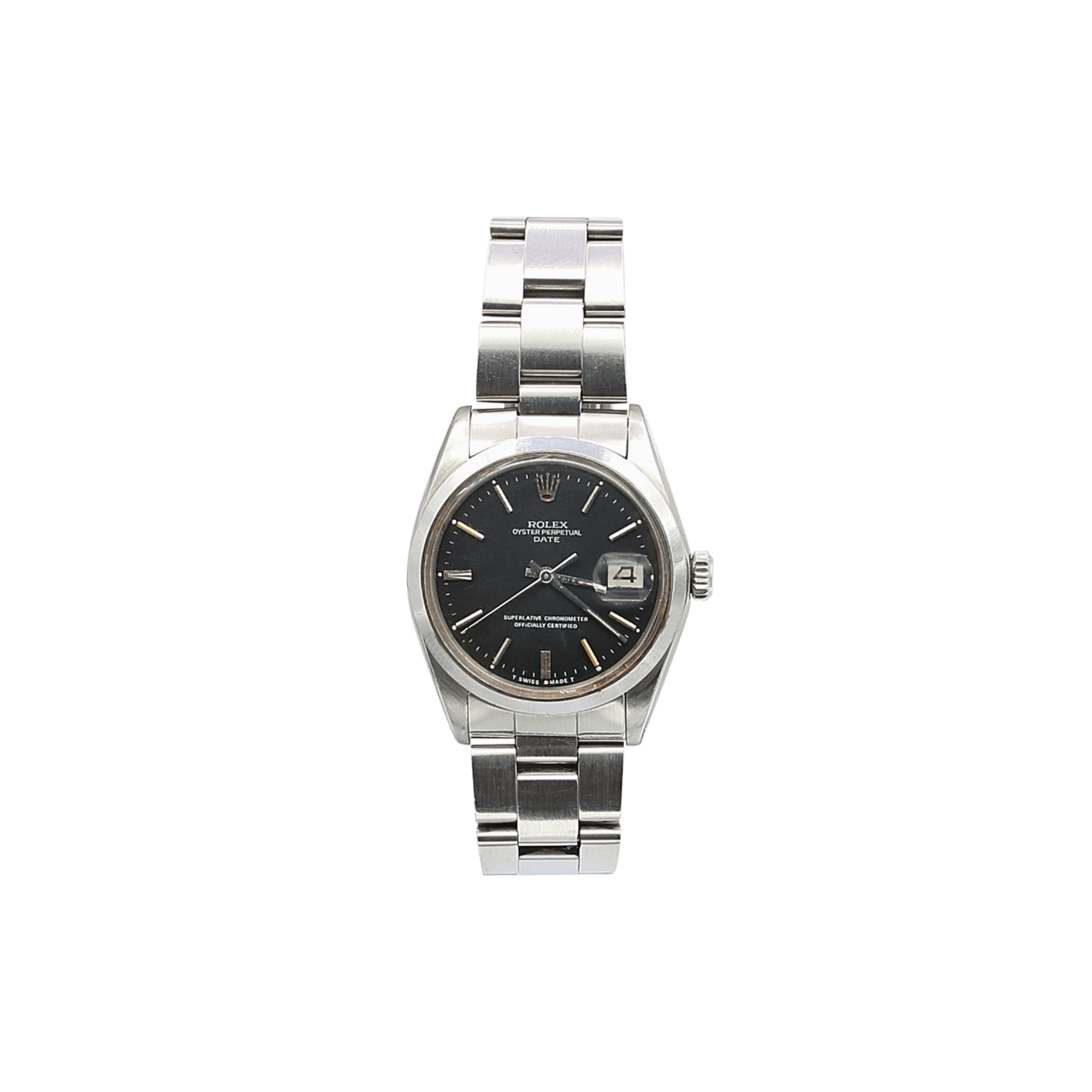 For sale at Debonar Watches: pre-owned Rolex Date 1500 from the '80s, with a deep black dial. The key factor that separates the Rolex Date ref. 1500 from the standard Datejust of the same era is its slightly smaller case. While the classic size of the men’s Rolex Datejust is 36mm, the case size of Rolex Date measures 34mm, similar to the Air-King and Oyster Perpetual models that Rolex was producing at that time. Like other vintage Rolex watches, the reference 1500 Date is fitted with an acrylic crystal (plastic/plexiglass).A bit of its story:First appearing during the 1950s, the Rolex Date offers much of the same design and functionality as the classic 36mm Datejust, but with a smaller 34mm case diameter.The Rolex Date ref. 1500 was produced from the early 1960s through the end of the 1970s. BRAND ROLEX MODEL DATE REFERENCE 1500 CASE MATERIAL STEEL MOVEMENT AUTOMATIC DIMENSION 34 MM DIAL BLACK BEZEL STEEL CRYSTAL PLEXIGLASS BRACELET TYPE OYSTER BRACELET MATERIAL STEEL BRACELET LENGHT 16 CM ORIGINAL BOX NO ORIGINAL PAPERS NO YEAR APPROX. THE '80s CONDITION VERY GOOD