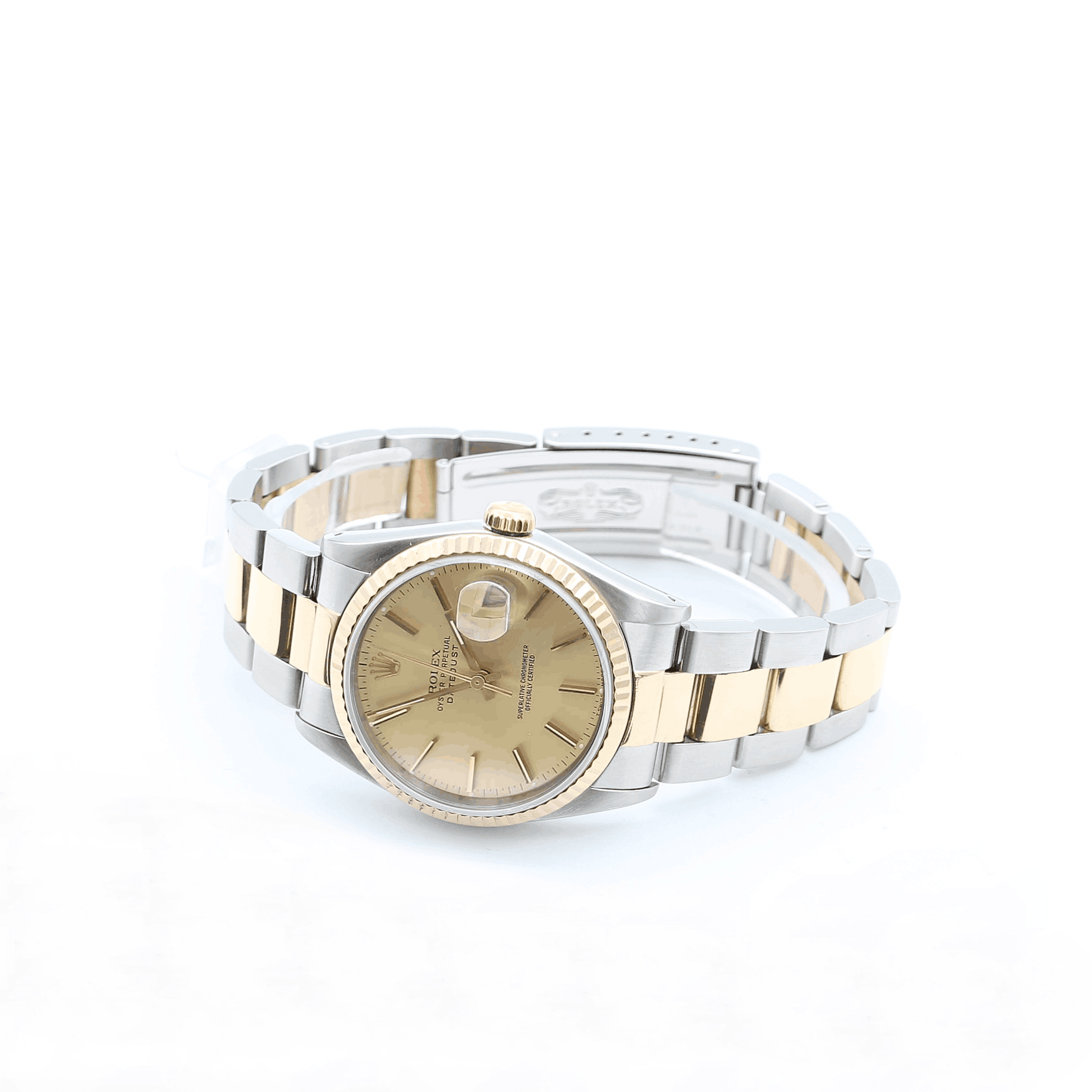 For sale at Debonar Watches: pre-owned Rolex Datejust 16233 in steel and 18k yellow gold, full set.Fluted yellow gold bezel on an Oyster bracelet, with an elegant champagne dial.The Rolex Datejust reference 16233 first made its appearance in 1988, boasting notable upgrades over its predecessor.The ref. 16233 was the direct replacement for the ref. 16013, which is sometimes known as the American Psycho Rolex.This reference maintained the classic 36mm case diameter from years past, which while a bit on the modest side by today’s standards still wears very well on a range of wrist sizes.Even though the series came to an end in the mid 2000’s, the Datejust ref. 16233 is a thoroughly modern version of the watch, and one with the classic two-tone Rolex look. BRAND ROLEX MODEL DATEJUST REFERENCE 16233 CASE MATERIAL 18K GOLD AND STEEL MOVEMENT AUTOMATIC DIMENSION 36 MM DIAL CHAMPAGNE BEZEL 18K GOLD CRYSTAL SAPPHIRE BRACELET TYPE OYSTER BRACELET MATERIAL 18K GOLD AND STEEL BRACELET LENGHT 16,5 CM ORIGINAL BOX YES ORIGINAL PAPERS YES YEAR APPROX. THE '90s CONDITION EXCELLENT