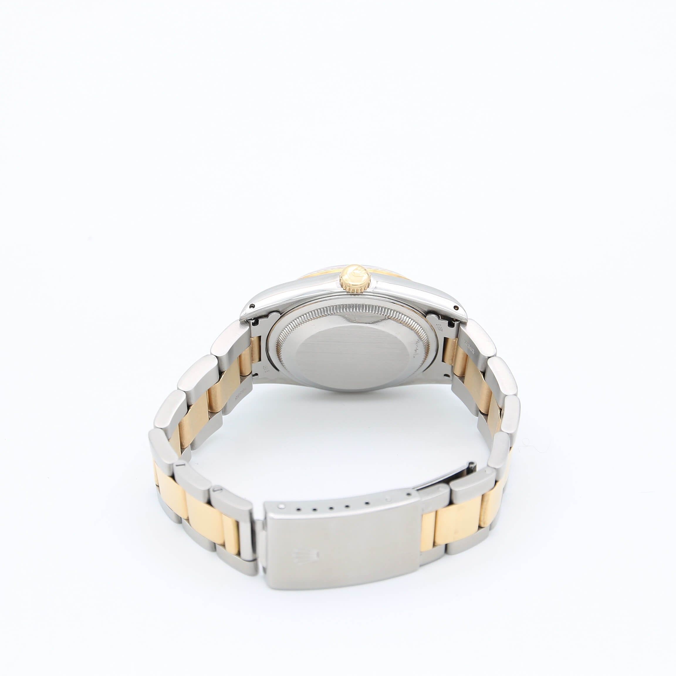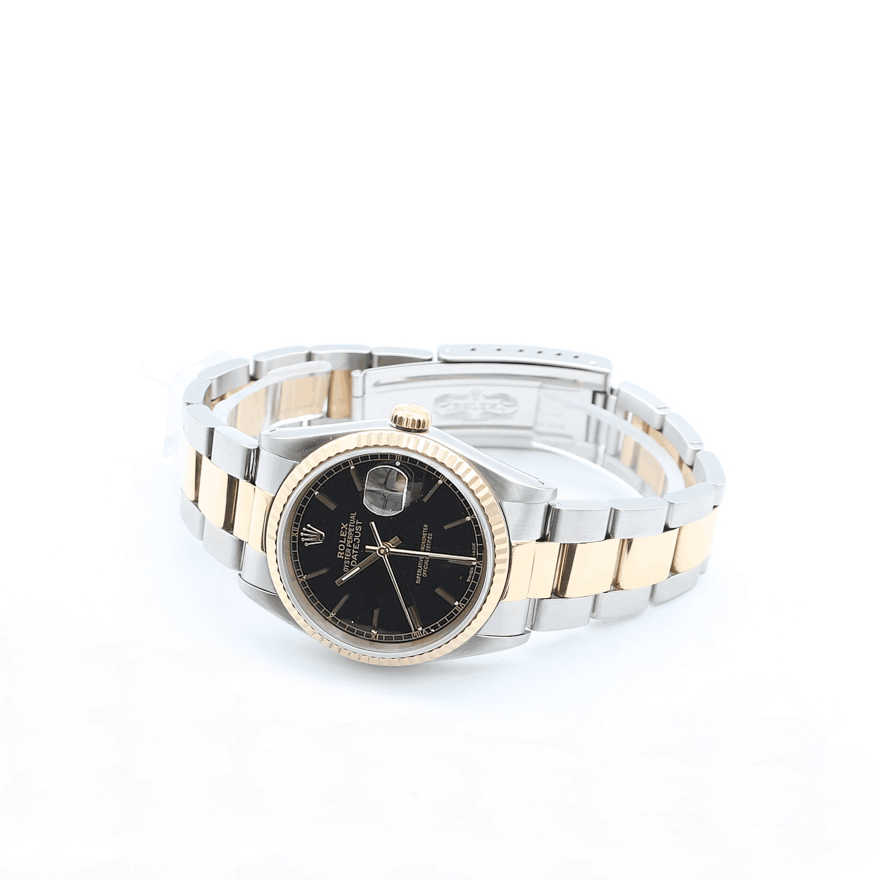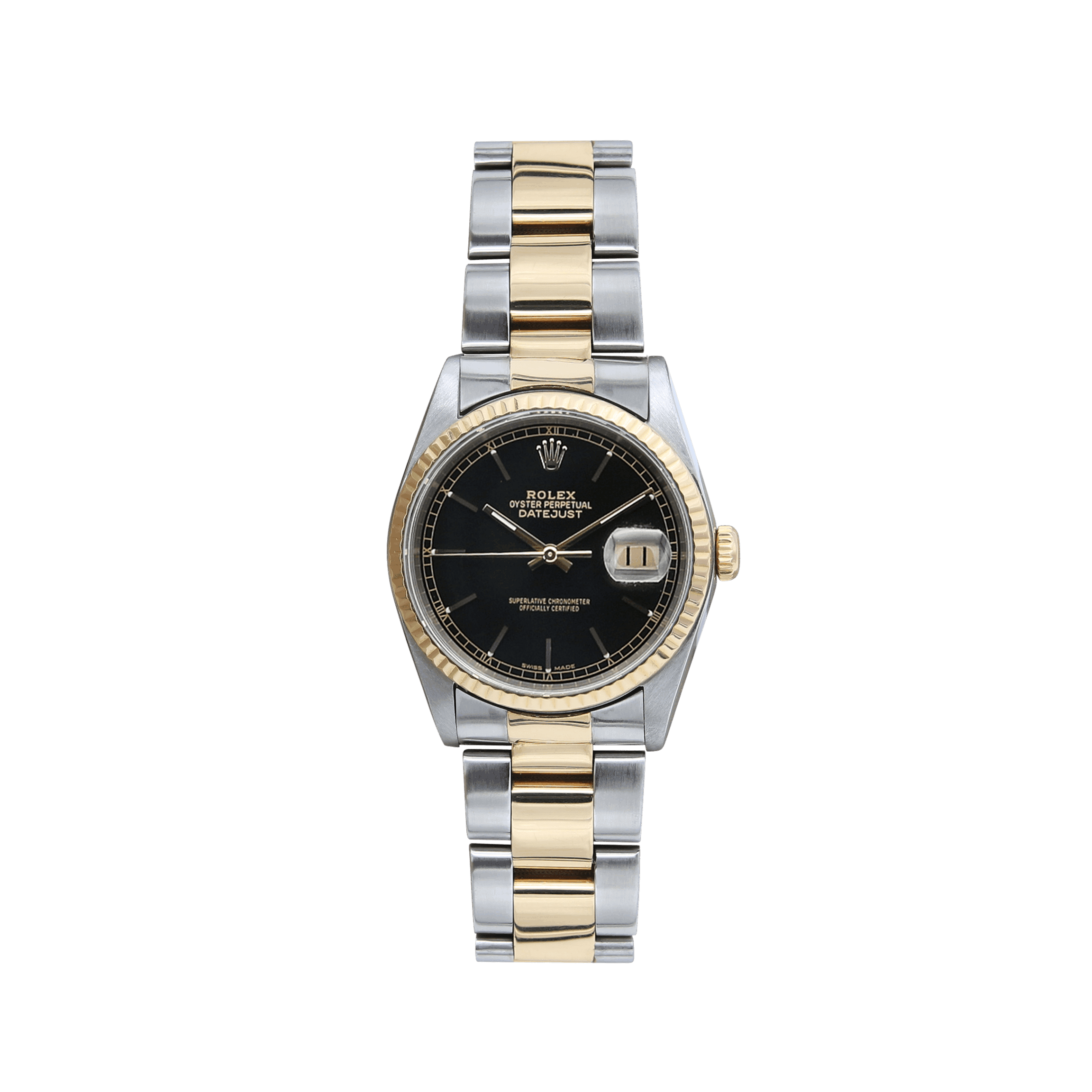 For sale at Debonar Watches: pre-owned Rolex Datejust 16233 in steel and 18k yellow gold, full set.Fluted yellow gold bezel on an Oyster bracelet, with a sportive black dial.The Rolex Datejust reference 16233 first made its appearance in 1988, boasting notable upgrades over its predecessor.The ref. 16233 was the direct replacement for the ref. 16013, which is sometimes known as the American Psycho Rolex.This reference maintained the classic 36mm case diameter from years past, which while a bit on the modest side by today’s standards still wears very well on a range of wrist sizes.Even though the series came to an end in the mid 2000’s, the Datejust ref. 16233 is a thoroughly modern version of the watch, and one with the classic two-tone Rolex look. BRAND ROLEX MODEL DATEJUST REFERENCE 16233 CASE MATERIAL 18K GOLD AND STEEL MOVEMENT AUTOMATIC DIMENSION 36 MM DIAL BLACK BEZEL 18K GOLD CRYSTAL SAPPHIRE BRACELET TYPE OYSTER BRACELET MATERIAL 18K GOLD AND STEEL BRACELET LENGHT 16,5 CM ORIGINAL BOX YES ORIGINAL PAPERS YES YEAR APPROX. THE '90s CONDITION EXCELLENT