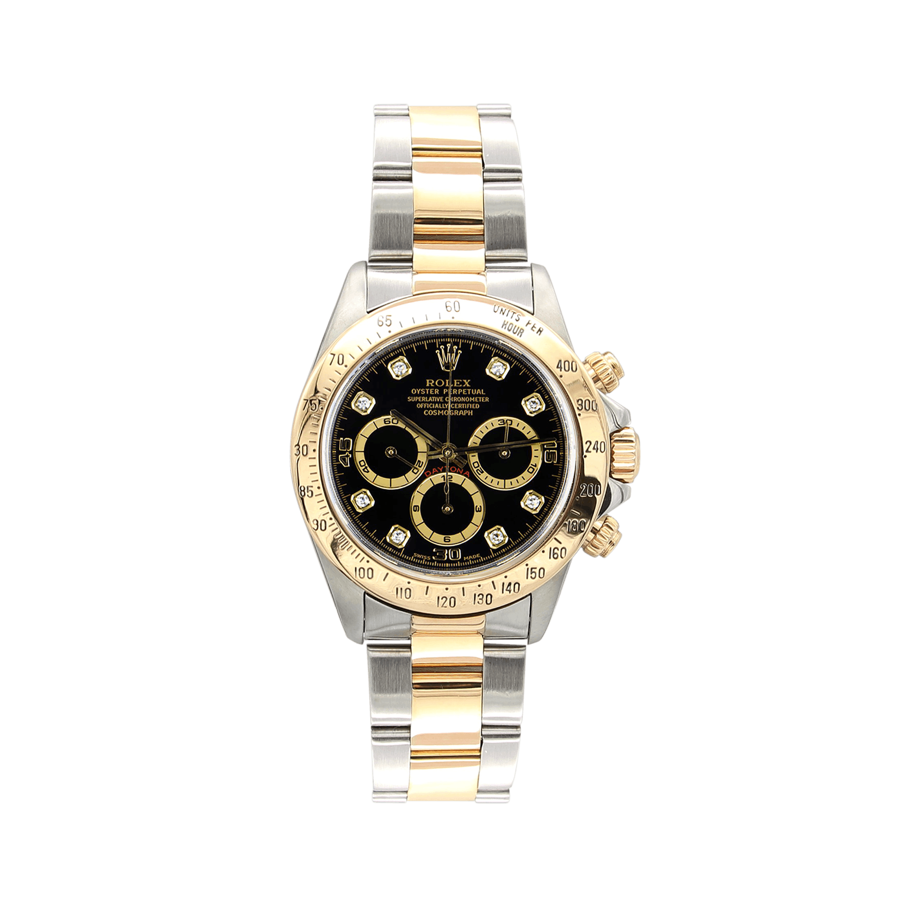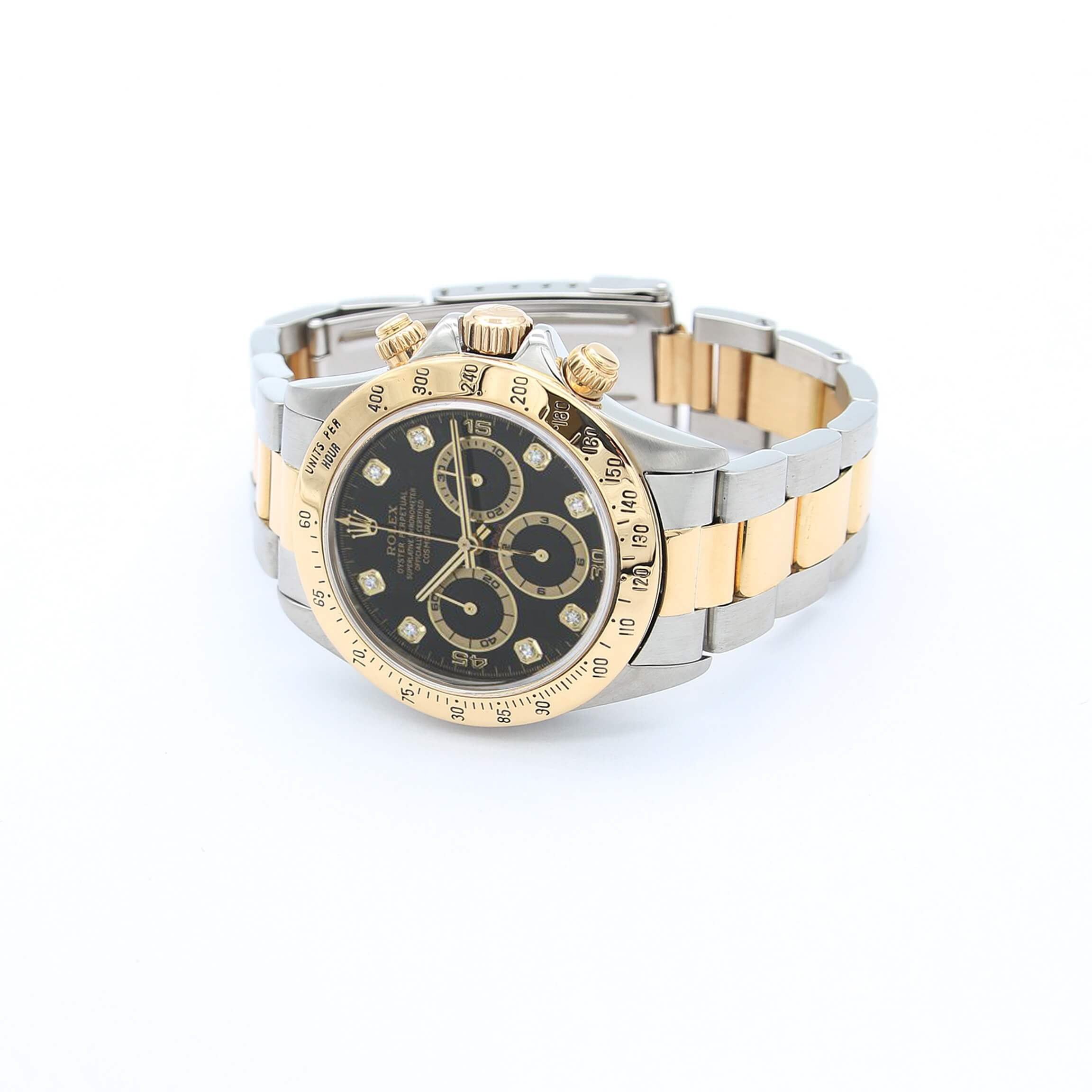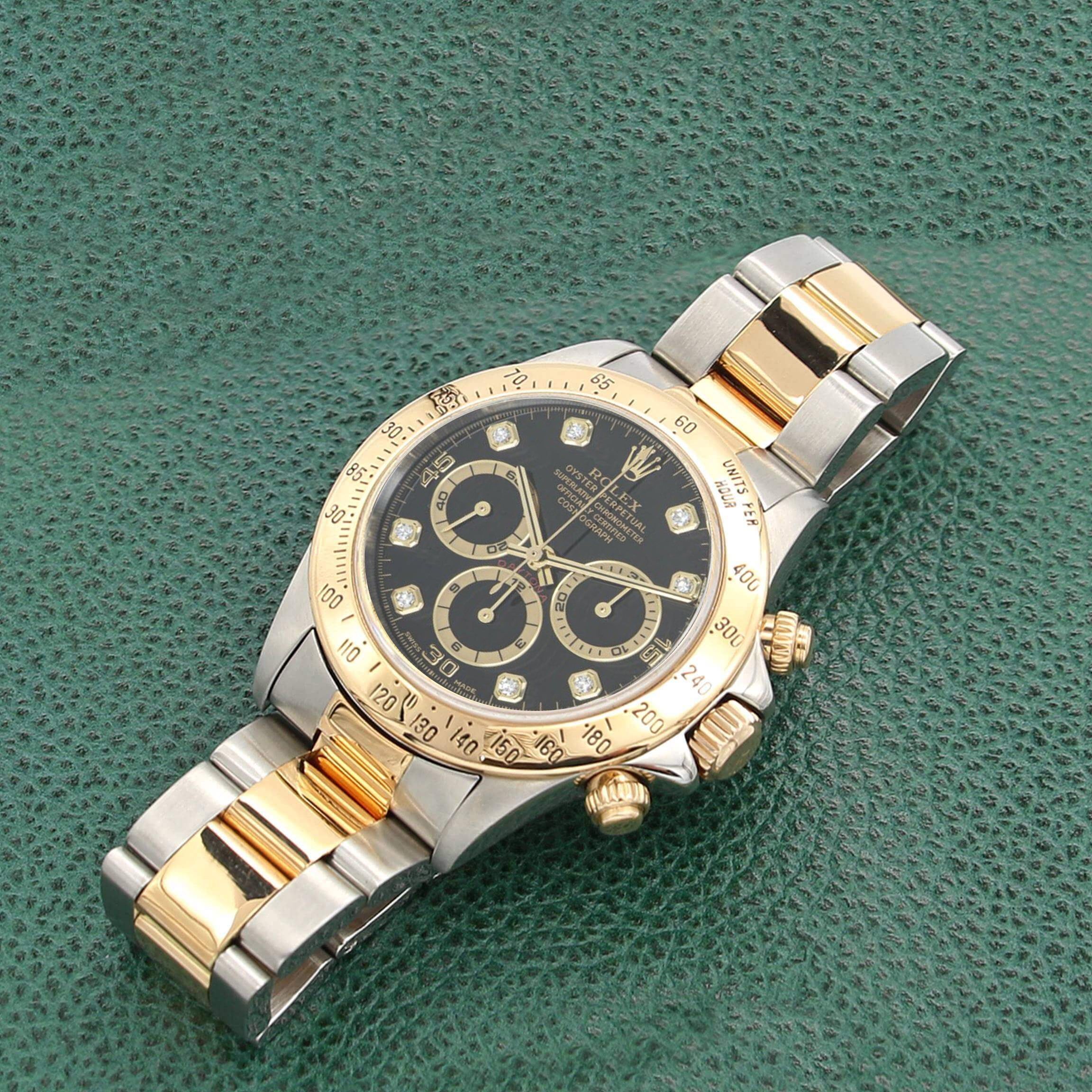 For sale at Debonar Watches: pre-owned Rolex Daytona 16523. This amazing Rolex watch sports a black dial with diamonds. This reference better known as the Zenith Daytona: it takes its nickname from the fact that it’s powered by a Zenith El Primero calibre.It wasn’t that long ago that Rolex still relied on 3rd-party suppliers for certain things. Particularly movements, which it then modified in-house.The dial of this Daytona 16523 exhibits a stunning gold sunburst pattern with black registers and bright red "Daytona" script. All appliqué indices are rendered in 18-karat yellow gold to match the dial and 18-karat yellow gold hands. This Zenith powered Rolex Daytona features a 40mm stainless steel case with an 18k yellow gold bezel surrounding a gold dial on a Rolex 904L stainless steel and 18k yellow gold Oyster bracelet with folding buckle.Functions include hours, minutes, small-seconds, 52-hour power reserve, COSC Swiss chronometer certification, 100-meter water resistance, and a column wheel chronograph. The watch also measures 12.3mm in thickness and 47.2mm from lug-to-lug. BRAND ROLEX MODEL DAYTONA REFERENCE 16523 CASE MATERIAL GOLD/STEEL MOVEMENT AUTOMATIC DIMENSION 40 MM DIAL BLACK W/DIAMONDS BEZEL GOLD/STEEL CRYSTAL SAPPHIRE BRACELET TYPE OYSTER BRACELET MATERIAL STEEL ORIGINAL BOX NO ORIGINAL PAPERS NO YEAR APPROX. '90s CONDITION VERY GOOD