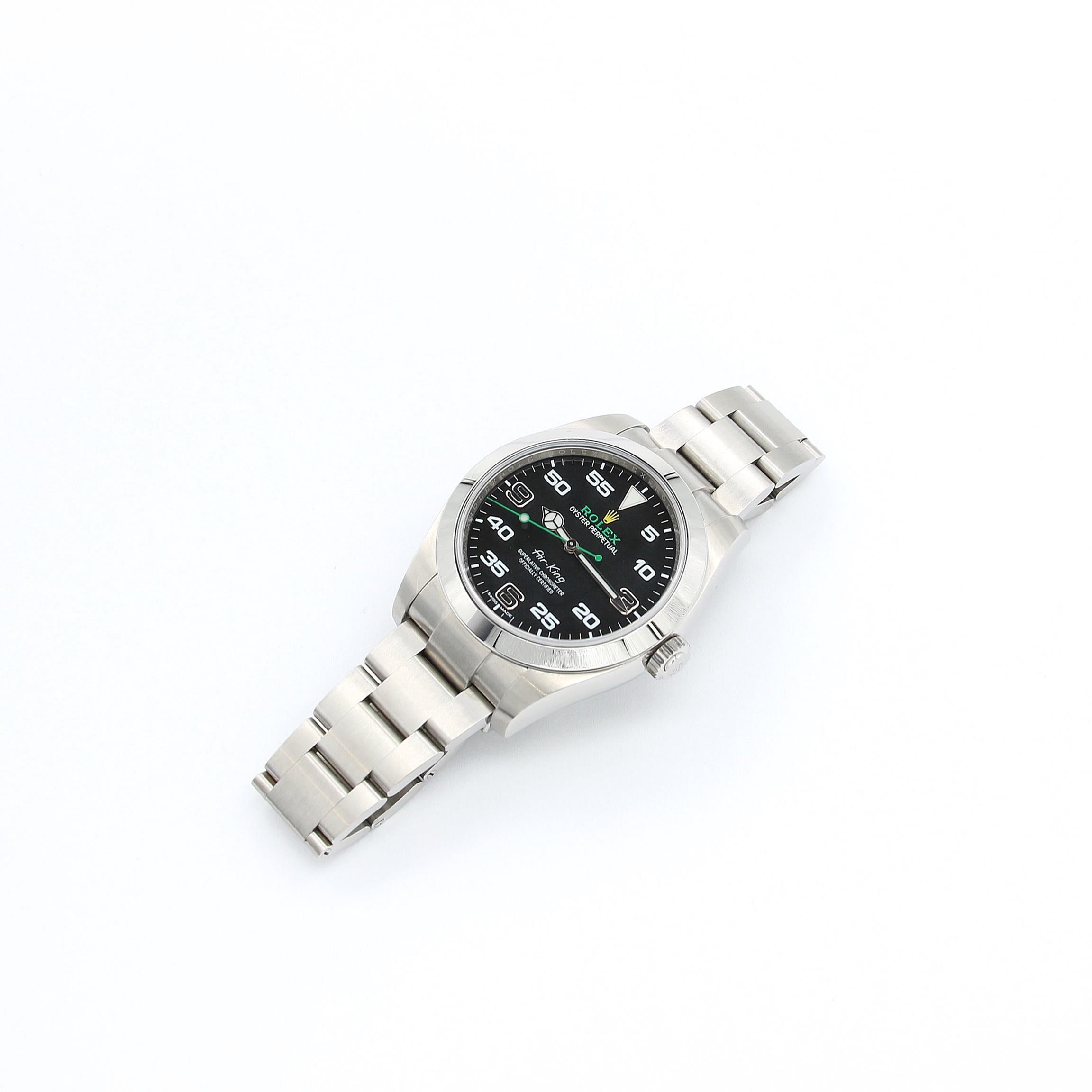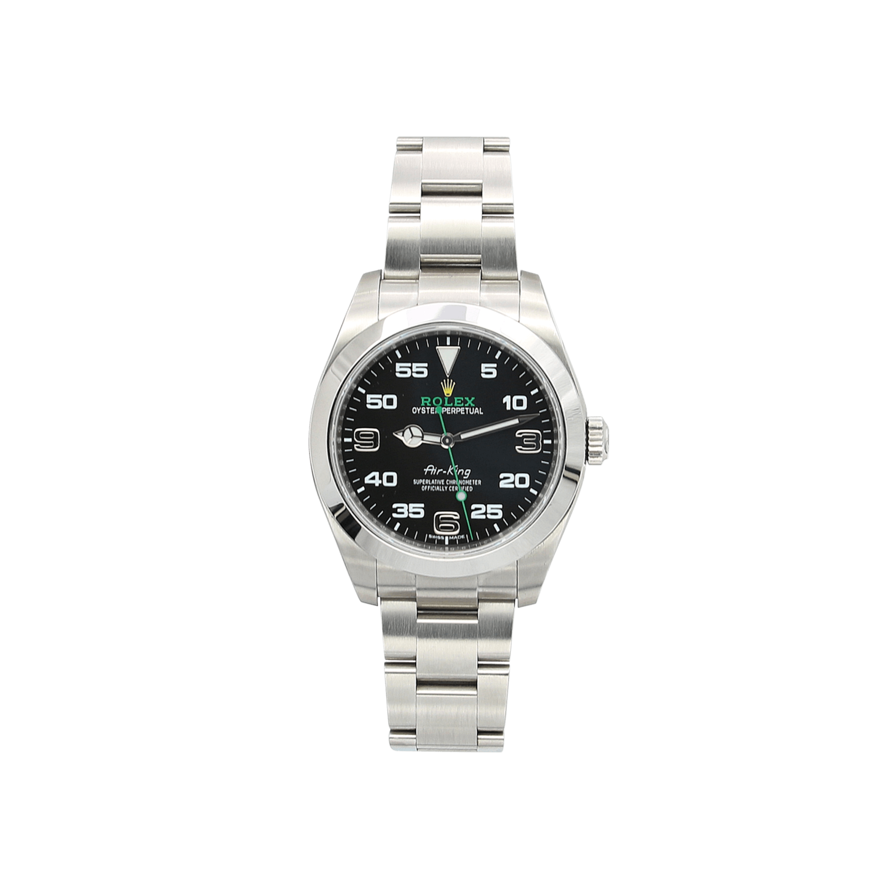For sale at Debonar Watches: pre-owned Rolex Airking ref. 116900 in excellent conditions, full set.The bigger case size (40mm) of the Air-King 116900 makes it unique and more modern, compared to the rest of its Airking "siblings" of 34mm. By using the same 40mm case as the Rolex Milgauss, the new Air-King has the same size and proportions as most of Rolex’s sport watches.The more extroverted style of the Air-King 116900 is reflected in its dial, which is uncharacteristically Rolex. Let’s start with the logo – for the first time in the company’s history, the crown and signature were printed in two different colors: the crown in yellow, the Rolex signature in green. It also comes with three different types of indexes: applied markers on the 3, 6 and 9 position like the Rolex Explorer’s, 5-minute printed white markers for the rest of the dial and an applied white luminous triangle at 12 o’clock. A green seconds hand complements the Rolex signature; and an expressive Air-King font appears below the hands. Despite the overall bold new details, the black dial blends the different design elements well, and the stainless steel case makes it very wearable for most occasions.Its story:The Rolex Air-King started ticking in the 1940s, and for most of its very long history, was the simplest Rolex there was. With no date, a screw-down crown, an Oyster case and chronometer movement, it had everything that made a Rolex, a Rolex. It was the Rolex for purists and for those new to the brand, until it was discontinued in 2014. In 2016, the Air-King returned – in a much more extroverted style. However, the newer Air-King 40 reference 116900 is definitely not your father’s Rolex Air-King. BRAND ROLEX MODEL AIR-KING REFERENCE 116900 CASE MATERIAL STEEL MOVEMENT AUTOMATIC DIMENSION 40 MM DIAL BLACK BEZEL STEEL CRYSTAL SAPPHIRE BRACELET TYPE OYSTER BRACELET MATERIAL STEEL ORIGINAL BOX YES ORIGINAL PAPERS YES YEAR - CONDITION VERY GOOD