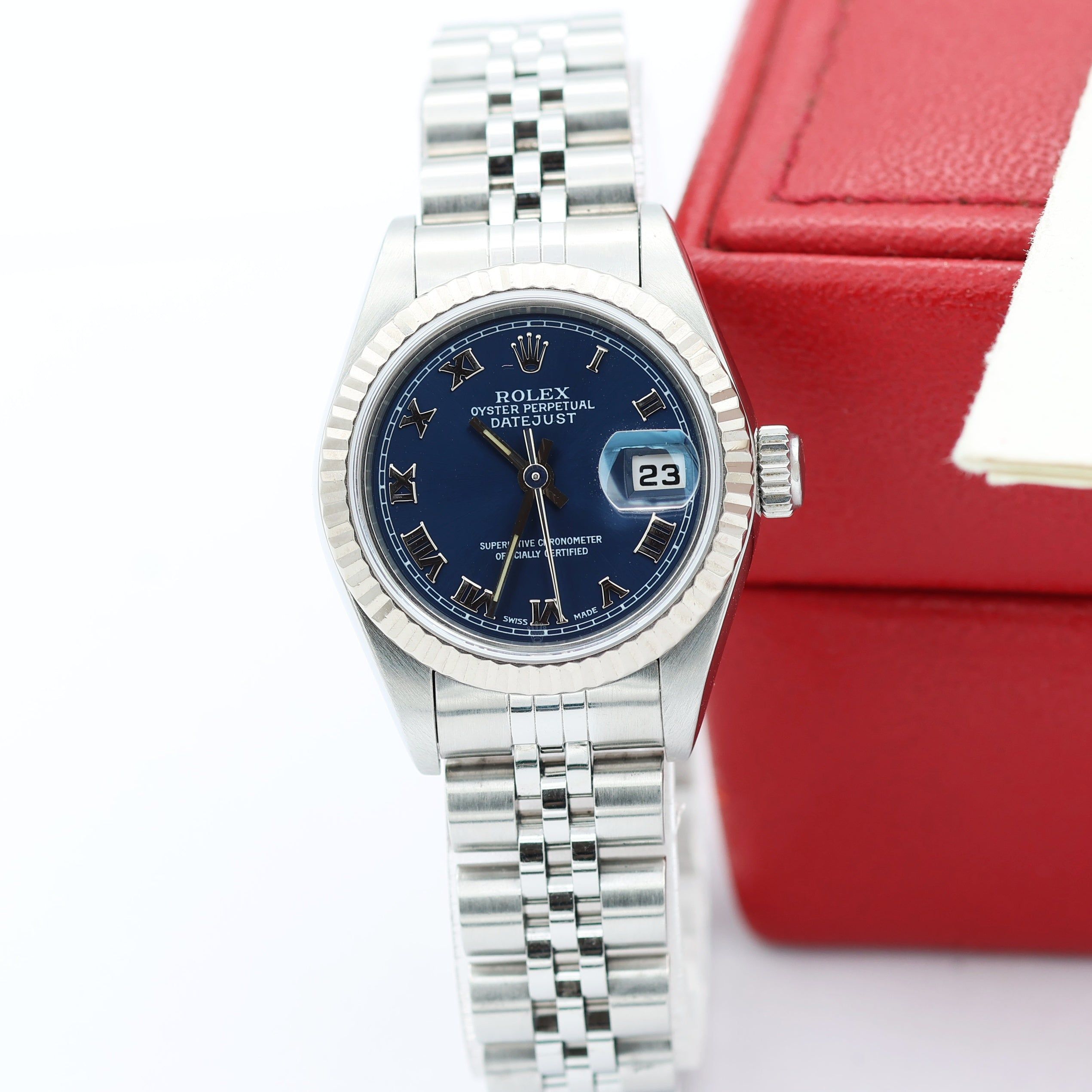 For sale at Debonar Watches: pre-owned Rolex Oyster Perpetual Datejust Ref. 69174, full set, with a beautiful blue dial with roman numbers. Fine, center seconds, self-winding automatic, water-resistant, stainless steel and 18K white gold lady's wristwatch with date and a stainless steel Rolex Jubilee bracelet with deployant clasp.The Lady-Datejusts are all about delicacy and finesse, something to accentuate a sophisticated outfit. BRAND ROLEX MODEL DATEJUST LADY REFERENCE 69174 CASE MATERIAL STEEL MOVEMENT AUTOMATIC DIMENSION 26 MM DIAL BLUE ROMAN BEZEL 18K GOLD CRYSTAL SAPPHIRE BRACELET TYPE JUBILEE BRACELET MATERIAL STEEL WRIST DIAMETER UP TO 17 CM ORIGINAL BOX YES ORIGINAL PAPERS YES YEAR APPROX. THE '90s CONDITION VERY GOOD