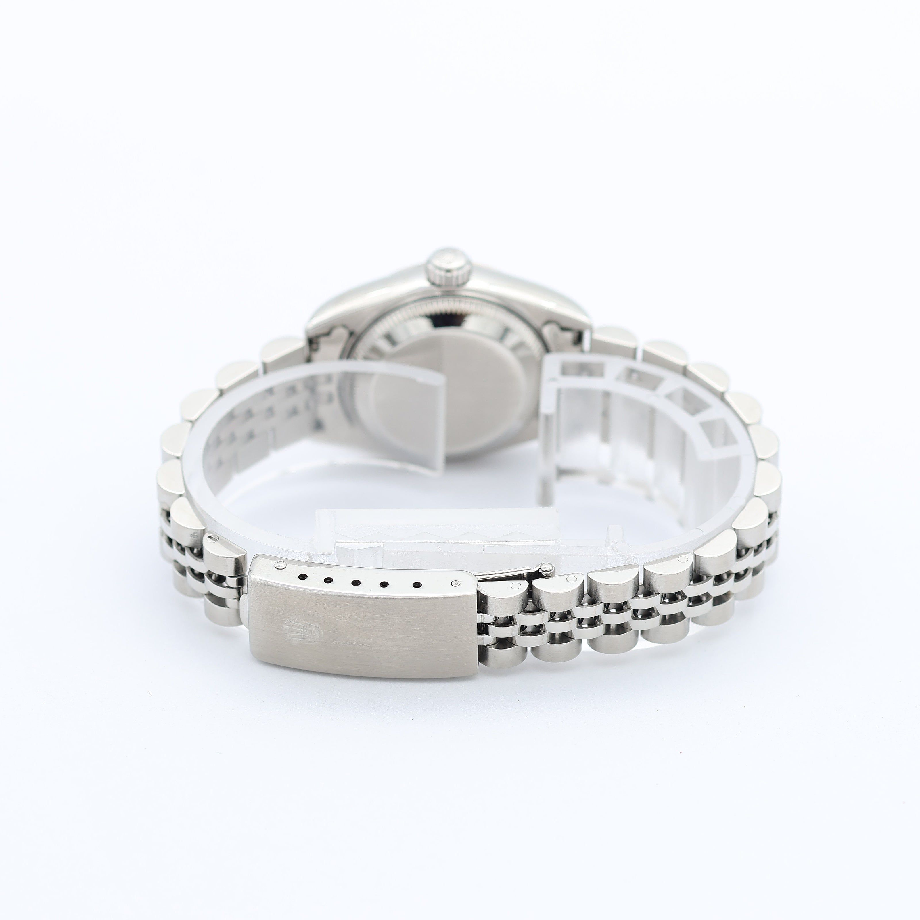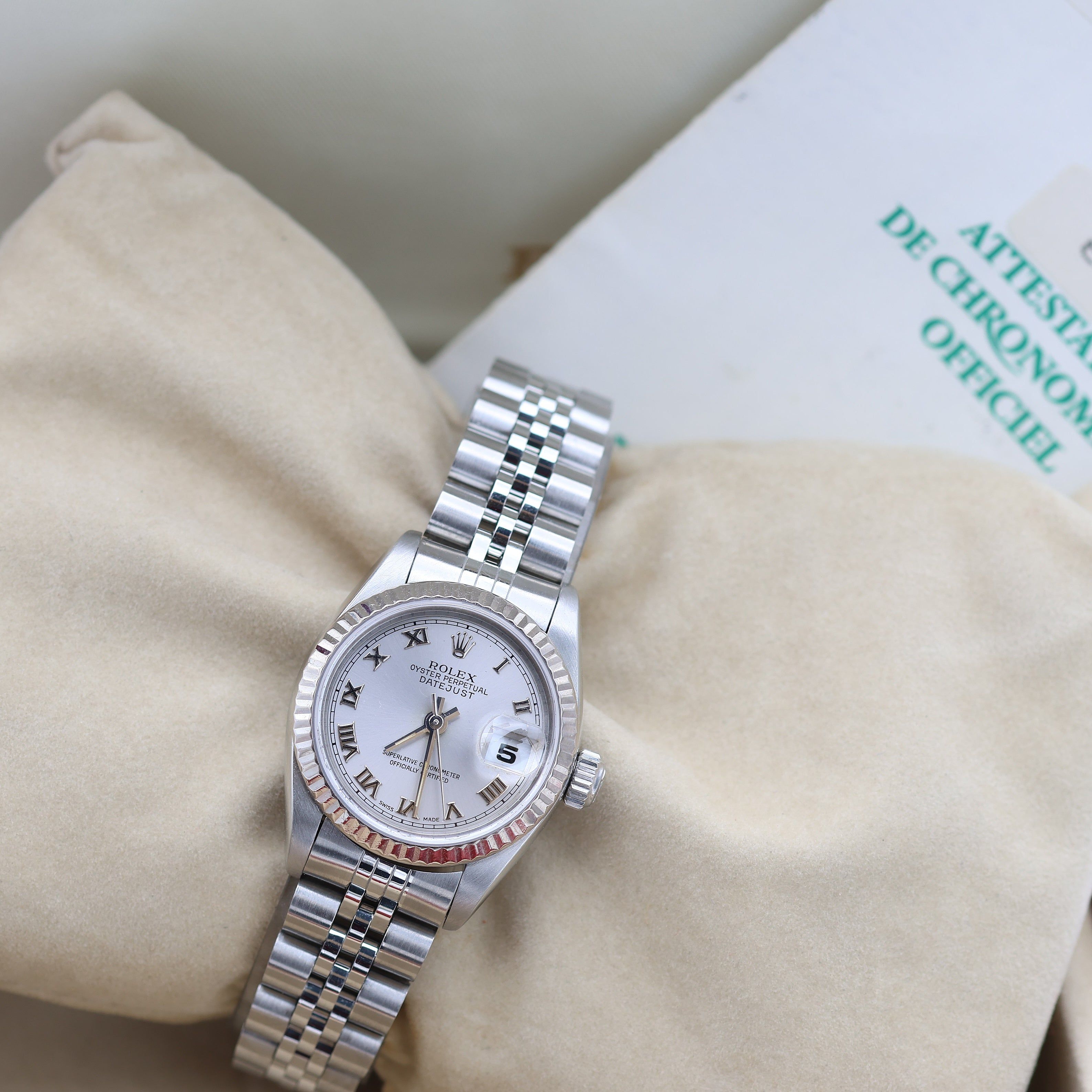 For sale at Debonar Watches: pre-owned Rolex Oyster Perpetual Datejust Ref. 69174, full set, with a majestic silver dial with roman numbers.Fine, center seconds, self-winding automatic, water-resistant, stainless steel and 18K white gold lady's wristwatch with date and a stainless steel Rolex Jubilee bracelet with deployant clasp.The Lady-Datejusts are all about delicacy and finesse, something to accentuate a sophisticated outfit. BRAND ROLEX MODEL DATEJUST LADY REFERENCE 69174 CASE MATERIAL STEEL MOVEMENT AUTOMATIC DIMENSION 26 MM DIAL SILVER ROMAN BEZEL 18K GOLD CRYSTAL SAPPHIRE BRACELET TYPE JUBILEE BRACELET MATERIAL STEEL BRACELET LENGHT 16 CM ORIGINAL BOX YES ORIGINAL PAPERS YES YEAR APPROX. THE '90s CONDITION EXCELLENT