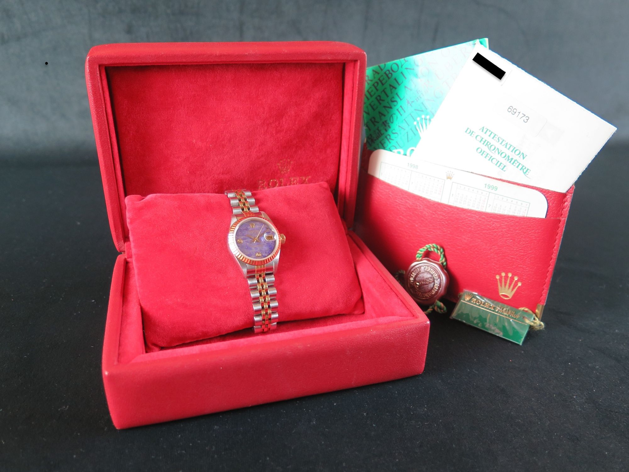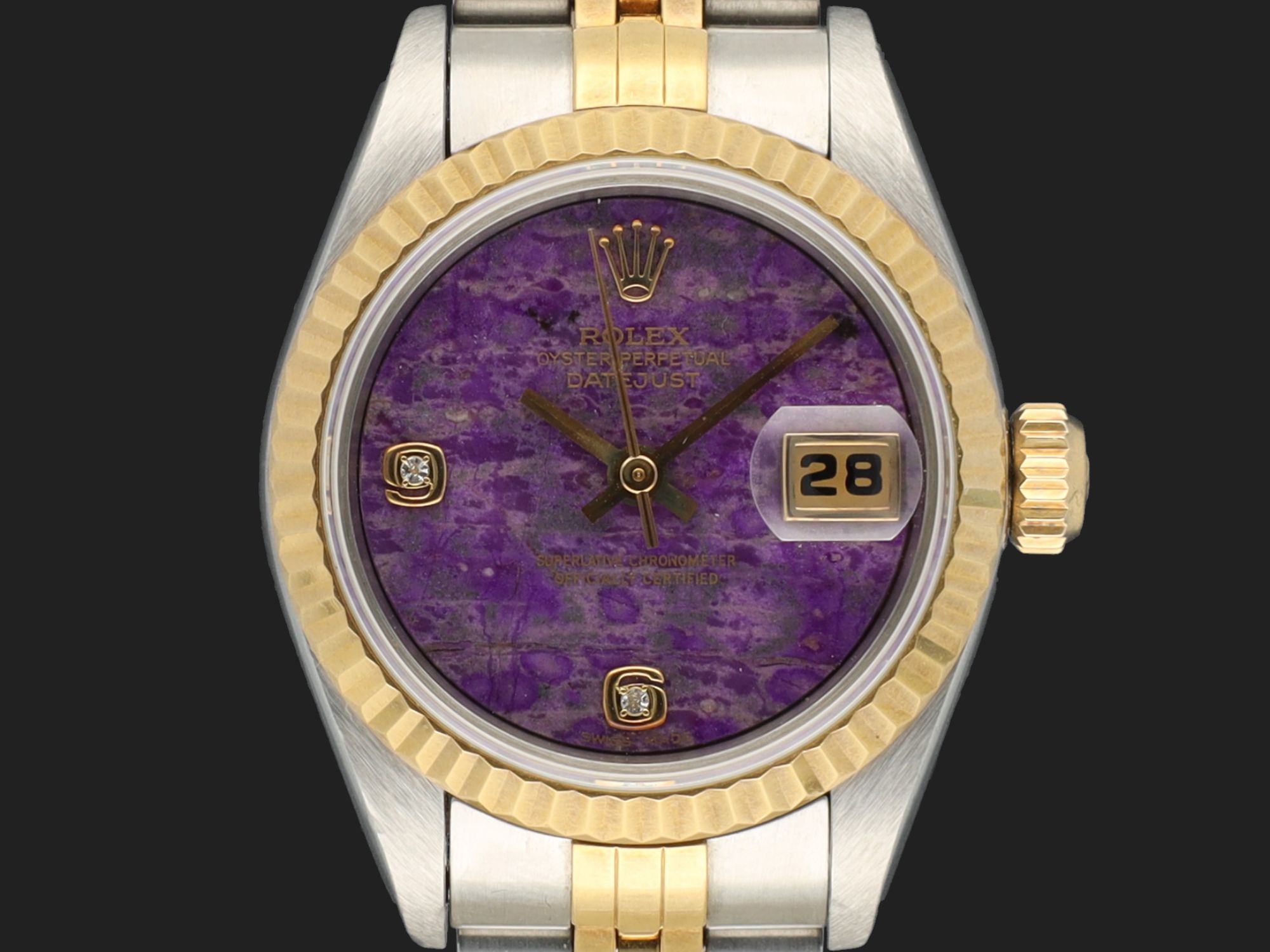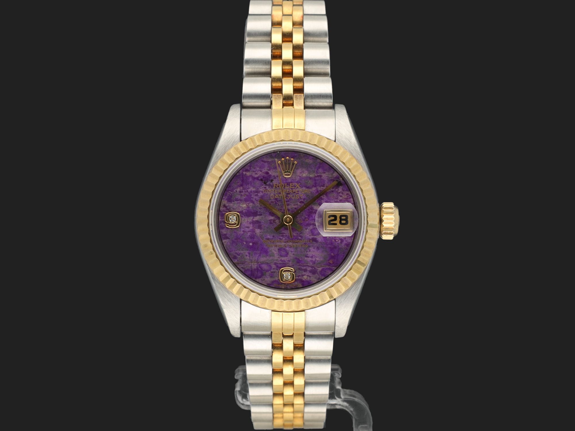 Dial colour is purple sugilite with diamond index on 6 and 9.Originally sold by Rolex 11/1999, LC430 (Singapore).