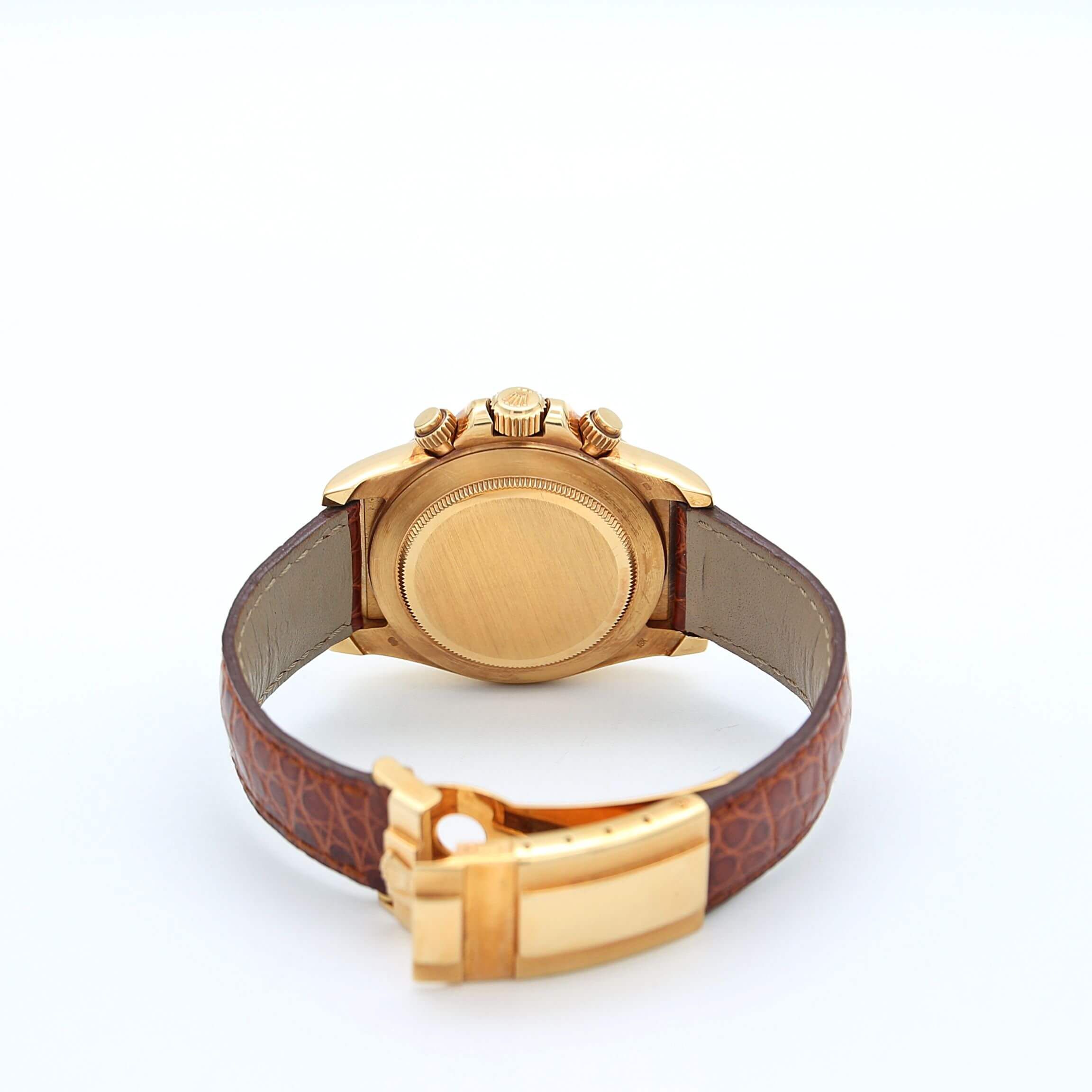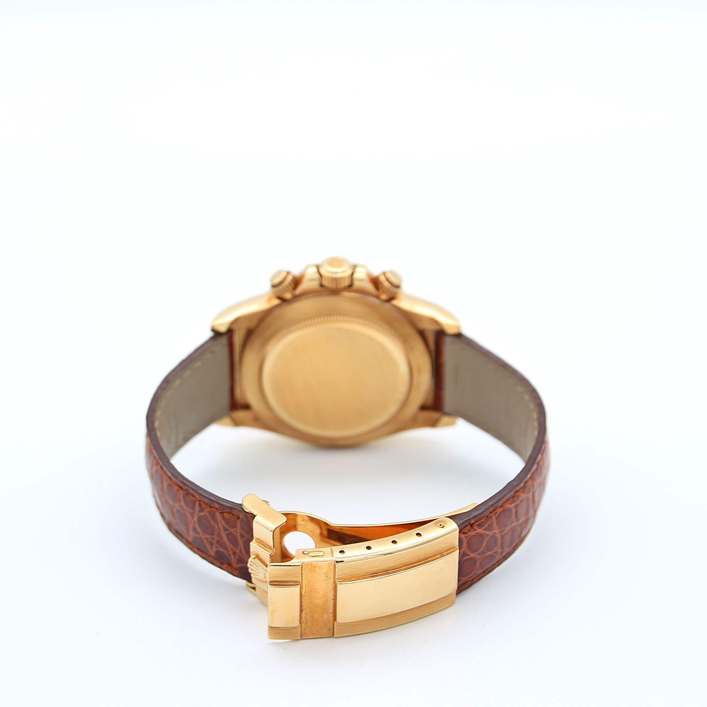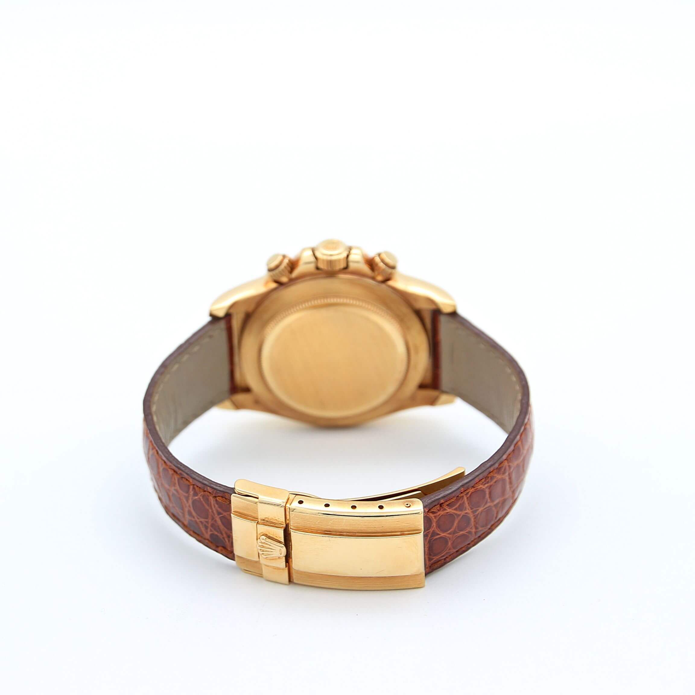 For sale at Debonar Watches: pre-owned Rolex Daytona 16518G, full set.The Rolex Cosmograph ref. 16518 is a particular yellow gold variant of the Daytona chronograph with Zenith power.This Daytona is in yellow gold with a white dial with diamonds and black subdials. More than any other contemporary Rolex, it's a timeless piece. With its iconic case, it's a slim watch, with a leather strap and a yellow gold clasp. BRAND ROLEX MODEL DAYTONA REFERENCE 16518G CASE MATERIAL YELLOW GOLD MOVEMENT AUTOMATIC DIMENSION 40 MM DIAL WHITE WITH DIAMONDS BEZEL YELLOW GOLD CRYSTAL SAPPHIRE BRACELET TYPE STRAP BRACELET MATERIAL LEATHER ORIGINAL BOX YES ORIGINAL PAPERS YES YEAR 1996 CONDITION EXCELLENT