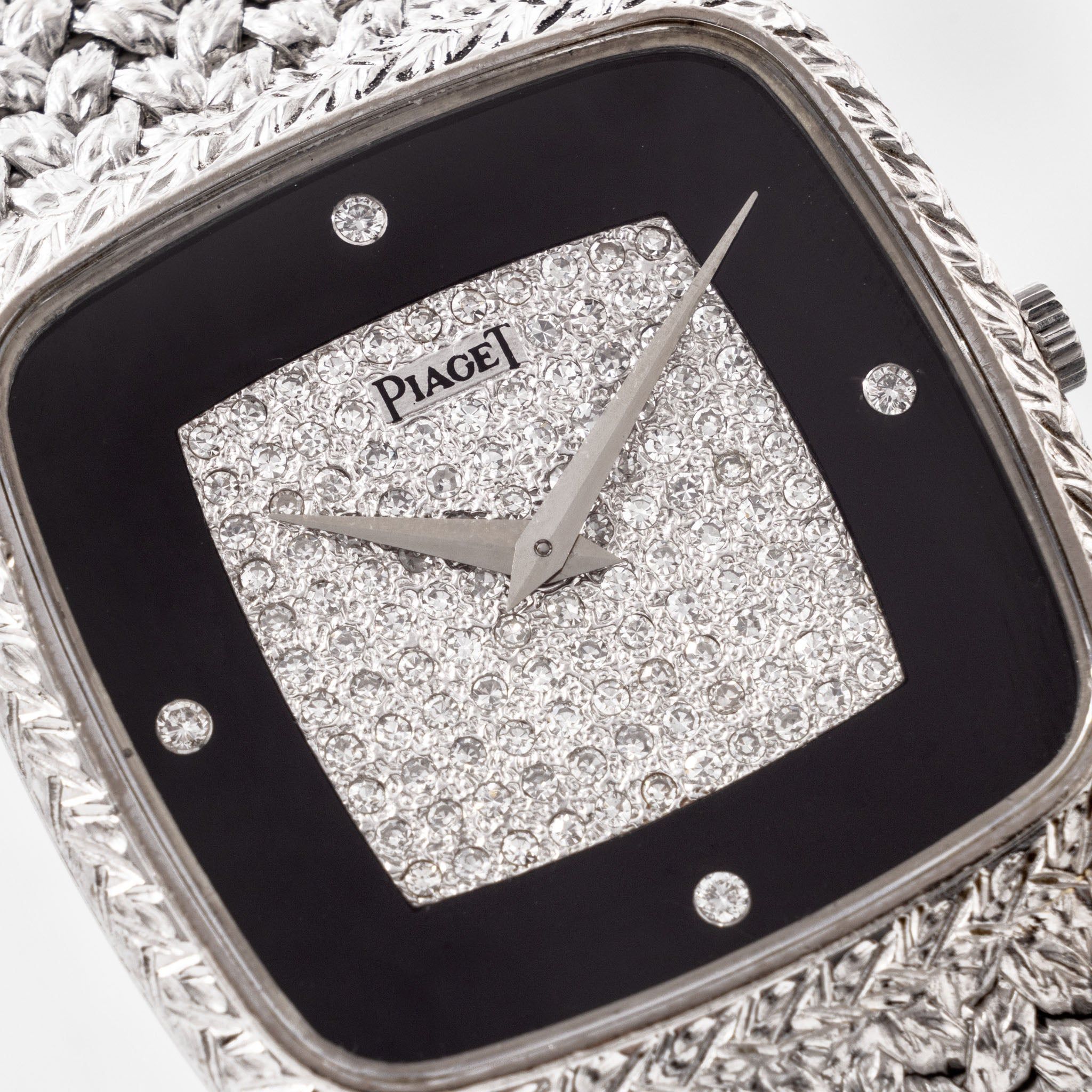 This Piaget, reference 9771 D2, is a prime example from the brand's golden era—a period between the 1960s and 1990s when Piaget perfected the art of seamlessly combining high-end watchmaking with exceptional jewelry craftsmanship! This particular model captures the essence of the iconic Piaget style: an ultra-slim, distinctive cushion-shaped case in 18K white gold, measuring 30 x 30 mm, and a masterful blend of onyx, 18K white gold, and pavé-set diamonds. The thin and very cool "woven" integrated white gold bracelet fits wrists up to 18.5 cm. This fine dresser is powered by the hand-wound Caliber 9P2, which has been fully serviced by our watchmaker. We have a full quartet of these iconic Piaget dress watches, and they are finally getting the attention these high-end jewelry timepieces deserve. We’d love to chat with you to help you choose the one that suits you best. Get in touch! Specifications: - Piaget Reference 9771 D2 Tradition- 30mm 18K white gold cushion-shaped ultra-thin case- Onyx Pavé dial with four diamond hour markers- No-lume dauphine hands- Hand-wound ultra-thin Cal. 9P2- Integrated "woven" 18K white gold bracelet- Serial 436xxx, dating to the early 1980s- Fully serviced by our watchmaker- One-year mechanical warranty- Free worldwide FedEx Priority shipping