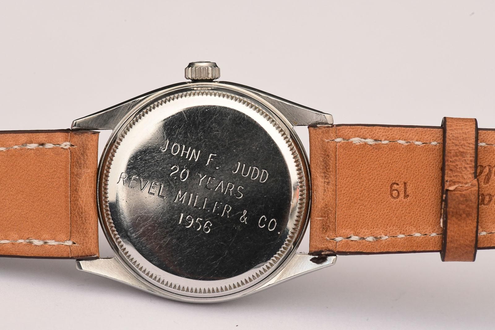 Rolex 6565 1955 Rolex Oyster Perpetual Crosshair Dial. A very well-preserved Rolex 6565 from 1955, making it 70 years old. The watch is in absolutely amazing original condition, with a 1950s-style dial featuring crosshairs, readium luminous material and Dauphine hands. The blued seconds hand is also very rare and perfectly complements the overall look. The bezel is also still in very good condition, which shows that the watch was rarely worn. The watch was a gift from the Revel Miller Co. to a loyal employee. The balanced symmetrical design ensures an elegant look on the wrist. The so-called “engine turned” bezel gives the watch a sporty touch. All numbers and punch marks are perfectly legible. A great watch for the ambitious collector.