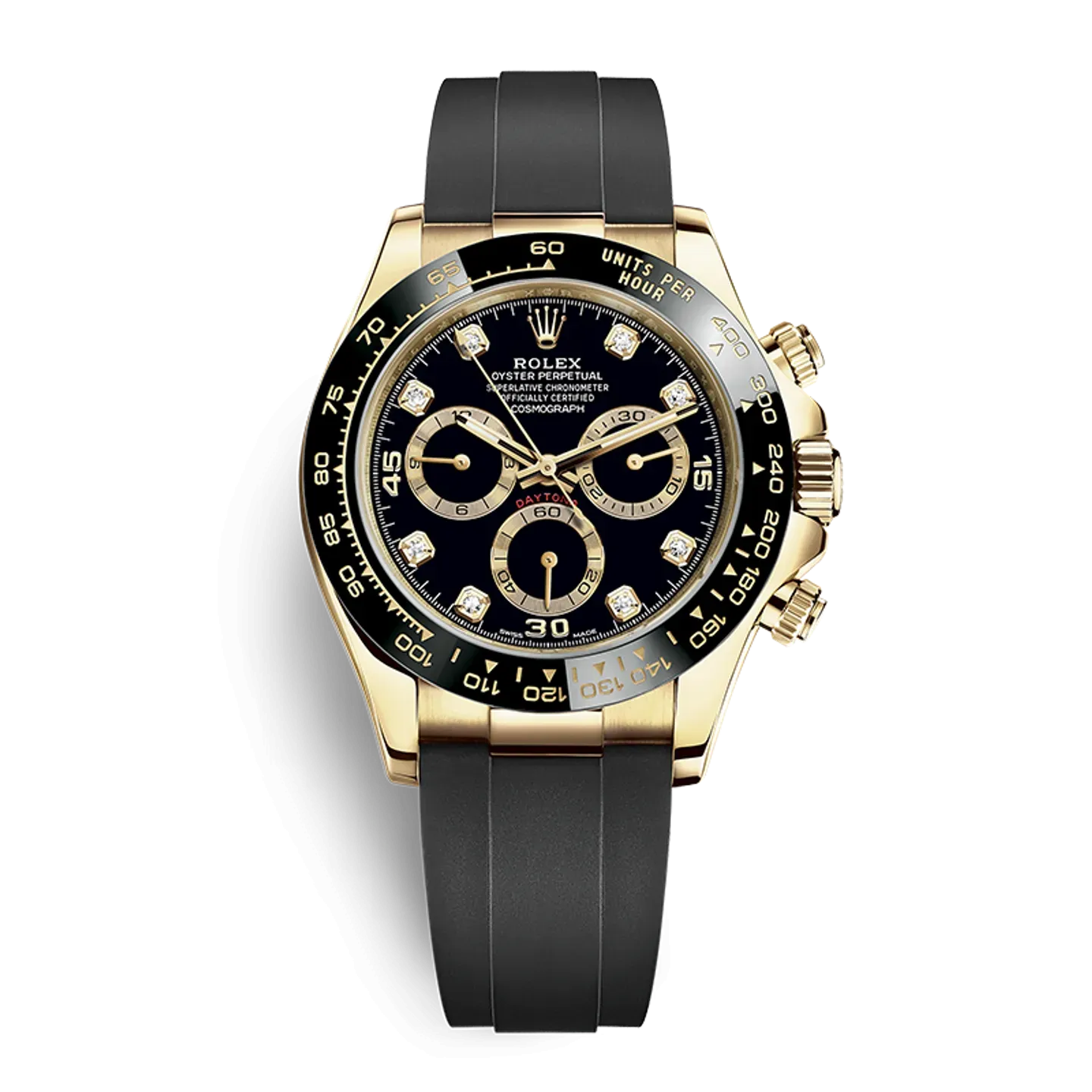 This Oyster Perpetual Cosmograph Daytona in 18 ct yellow gold, with a bright black and golden, diamond-set dial and an Oysterflex bracelet, features a black Cerachrom bezel with tachymetric scale.