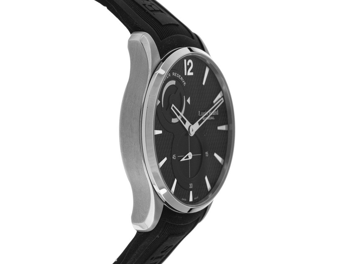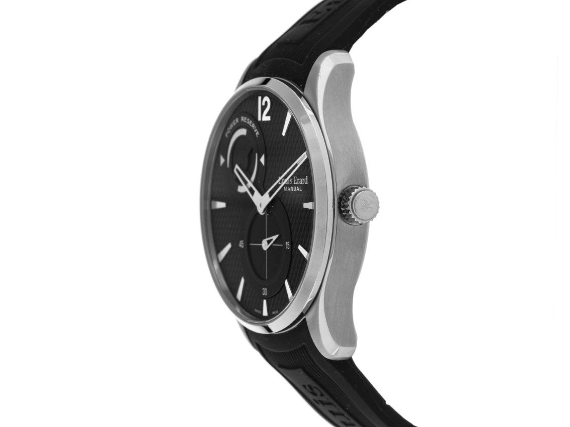 Gehäuse Edelstahl poliert und satiniert, Gehäusedurchmesser ohne Krone 42mm, Gehäusehöhe 10,5mm - Armband Kautschuk schwarz, Anstoßbreite 22mm, Doppelsicherheitsfaltschließe mit Hersteller-Logo - Zifferblatt schwarz mit aufgesetzten Indexen, arabische 12, skelettierte Edelstahl Zeiger - Uhrwerk Handaufzug, Kaliber ETA Peseux 7001 RM10 mit Louis Erard Komplikation, Anzeige von Stunden und Minuten, kleine Sekunde bei 6 Uhr, Gangreserve Anzeige bei 11 Uhr - Safirglas - Krone mit Hersteller-Logo - Boden Edelstahl 4-fach verschraubt, graviert, mit Sichtfenster - Gewicht der Uhr inklusive Armband 108g, Wasserdicht bis 5 ATM, Referenznummer 53209.AS02, ID: STKSch17720414HPP-2189, ArtikelNr: 100000017516, original Box und Papiere - neu - Lieferzeit sofort