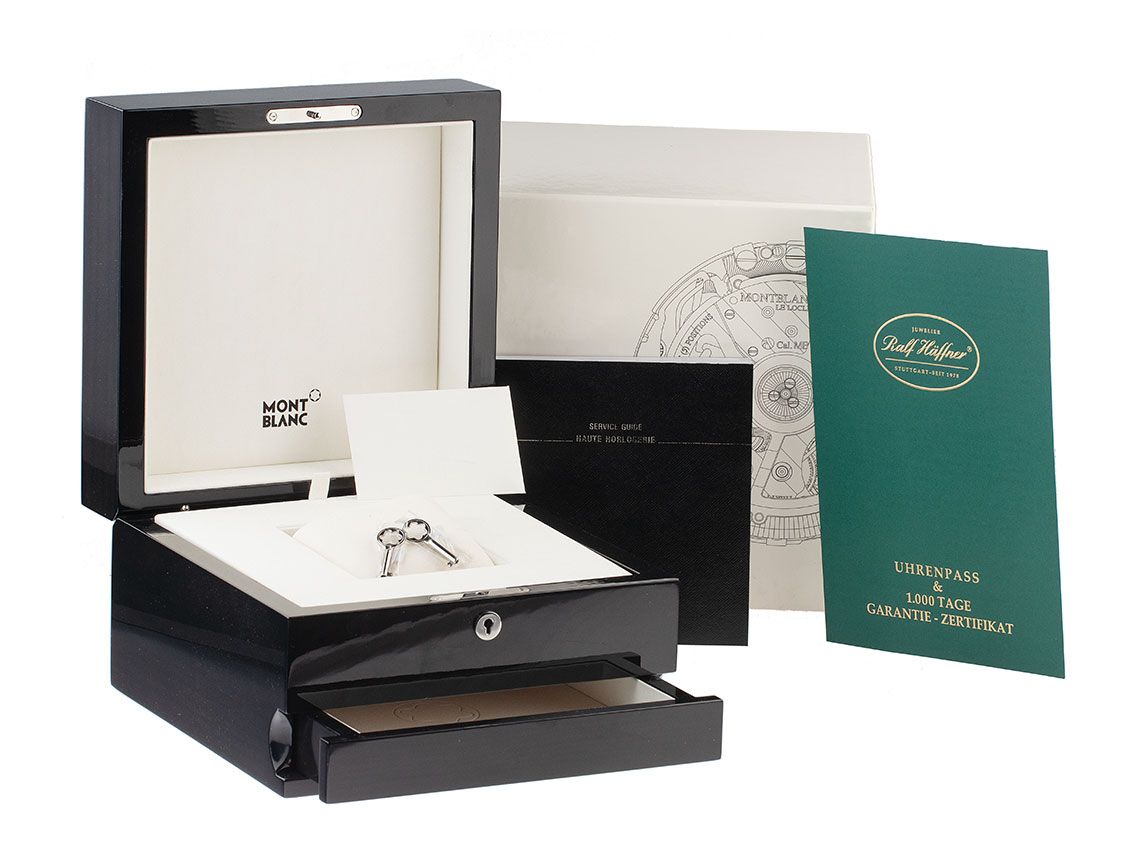 Gehäuse Titan satiniert, Gehäusedurchmesser ohne Krone 43mm, Gehäusehöhe 15,5mm. Lünette Titan satiniert. Montblanc Armband Leder grau mit Ziernaht, Anstoßbreite 22mm, Montblanc Stiftschließe Edelstahl mit Hersteller-Logo. Zifferblatt grau teilskelettiert mit schwarzen arabischen Ziffern und polierten Zeigern. Uhrwerk Automatik, Chronograph Twinfly Flyback, Kaliber MBLL 100 mit 36 Edelsteinen. Anzeige von Stunde, Minute und Sekunde über Zeiger aus der Mitte mit Sekundenstopp zur sekundengenauen Einstellung der Uhrzeit, Datumsanzeige mit Schnellverstellung bei 9 Uhr (offene Datumsscheibe), 2. Zeitzone bei 12 Uhr. Saphirglas kratzfest, gewölbt. Krone geriffelt mit Hersteller-Logo. Boden Titan 6-fach verschraubt, graviert mit Saphirglas Sichtfenster. Gewicht der Uhr inklusive Armband 80g. Referenznummer: 107338, Gehäusenummer: 7228-VA102XXX, Baujahr: 2017, ID: KB142000321H-13200, Artikelnummer: 10000057695, Limitiert auf 888 Exemplare. Mit Gangkontrolle und kompletter äußerlicher Aufarbeitung von März 2021, inkl. 1000 Tagen Garantie. Original Montblanc Box und Garantie Papiere ohne Datumseintrag, Full Set. Limitiert auf 888 Exemplare. Superschnäppchen, extrem seltenes Sammlerstück, aus erster Hand, fast nicht getragen. Ungetragen. Lieferzeit sofort.