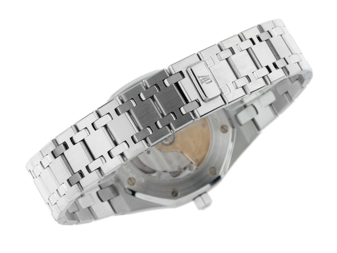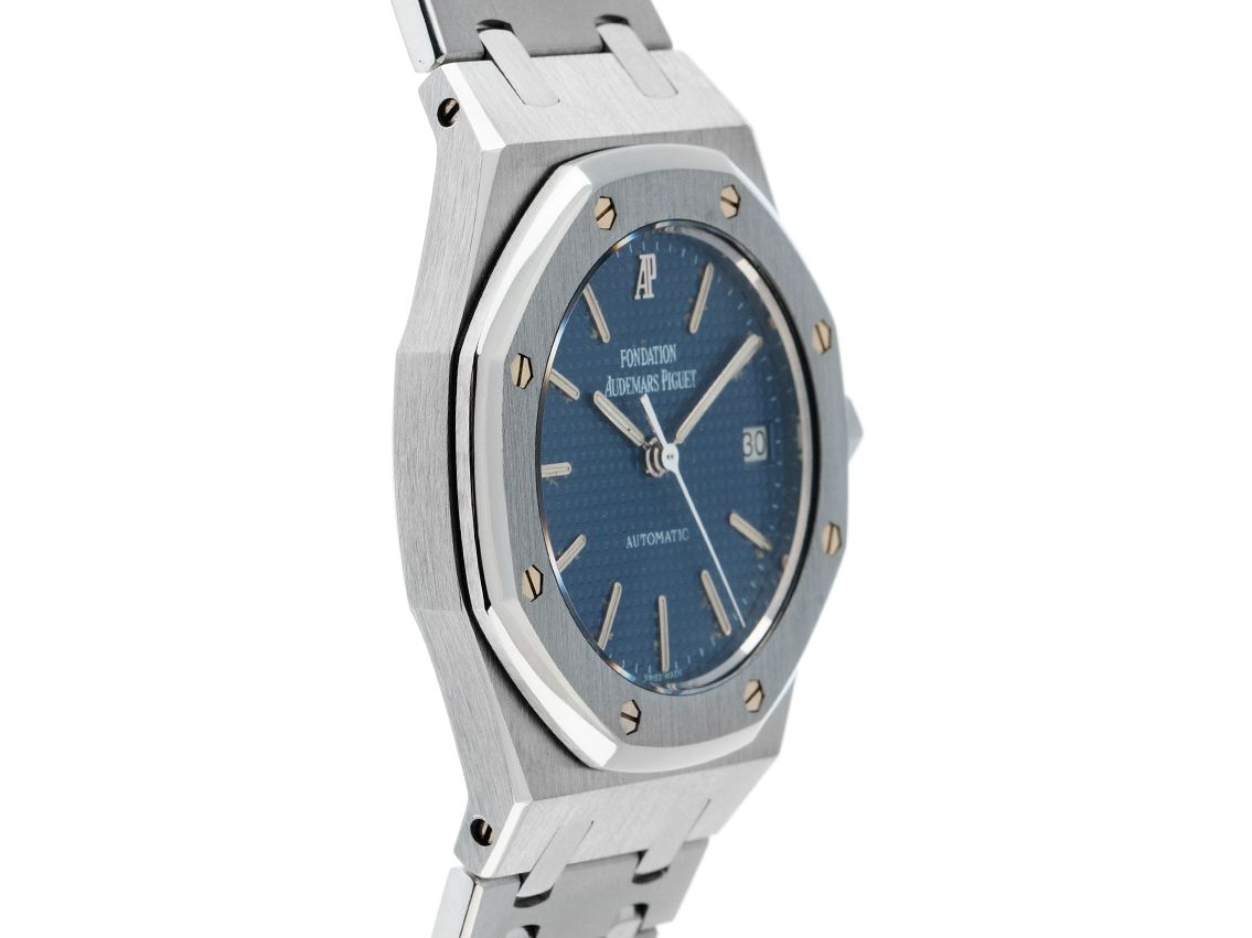 Gehäuse Edelstahl poliert und satiniert, Gehäusedurchmesser ohne Krone 36mm, Gehäusehöhe 7,5mm. Lünette Edelstahl poliert und satiniert, 8-eckig mit 8 Schrauben verschraubt. Armband Edelstahl poliert und satiniert, verschraubte Bandstege, Sicherheitsfaltschließe Edelstahl mit Hersteller-Logo. Zifferblatt blau mit Waffelmuster, aufgesetzten Edelstahl Indexen und Edelstahl Zeigern. Uhrwerk Automatik, Audemars Piguet Manufakturkaliber 2225 mit 35 Edelsteinen, Werknummer: 427XXX. Anzeige von Stunde, Minute und Sekunde über Zeiger aus der Mitte mit Sekundenstopp zur sekundengenauen Einstellung der Uhrzeit, Datumsanzeige mit Schnellverstellung bei 3 Uhr. Saphirglas kratzfest. Krone verschraubbar mit Hersteller-Logo. Boden Edelstahl 8-fach verschraubt und graviert mit Saphirglas Sichtfenster. Gewicht der Uhr inklusive Armband 92g, Länge des Armbandes inklusive Gehäuse 165mm. Referenznummer: 14990ST/O/0789ST/01, ID: KM1100001122H-86000, Gehäusenummer: D81XXX, Artikelnummer: 10000067288. Original Audemars Piguet Box und Garantie Papiere von 04/1998, AP Zertifikat und original Revisions Rechnung von 03/2022, Full Set. Limitiert auf 250 Exemplare, Foundation "Time for the Trees". Kapitalanlage mit Wertsteigerungspotential, extrem seltenes Sammlerstück, aus erster Hand, Tresoruhr, fast nicht getragen. Wie Neu. Lieferzeit sofort.