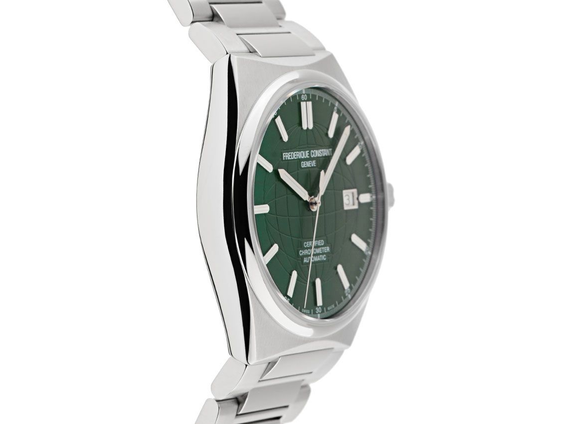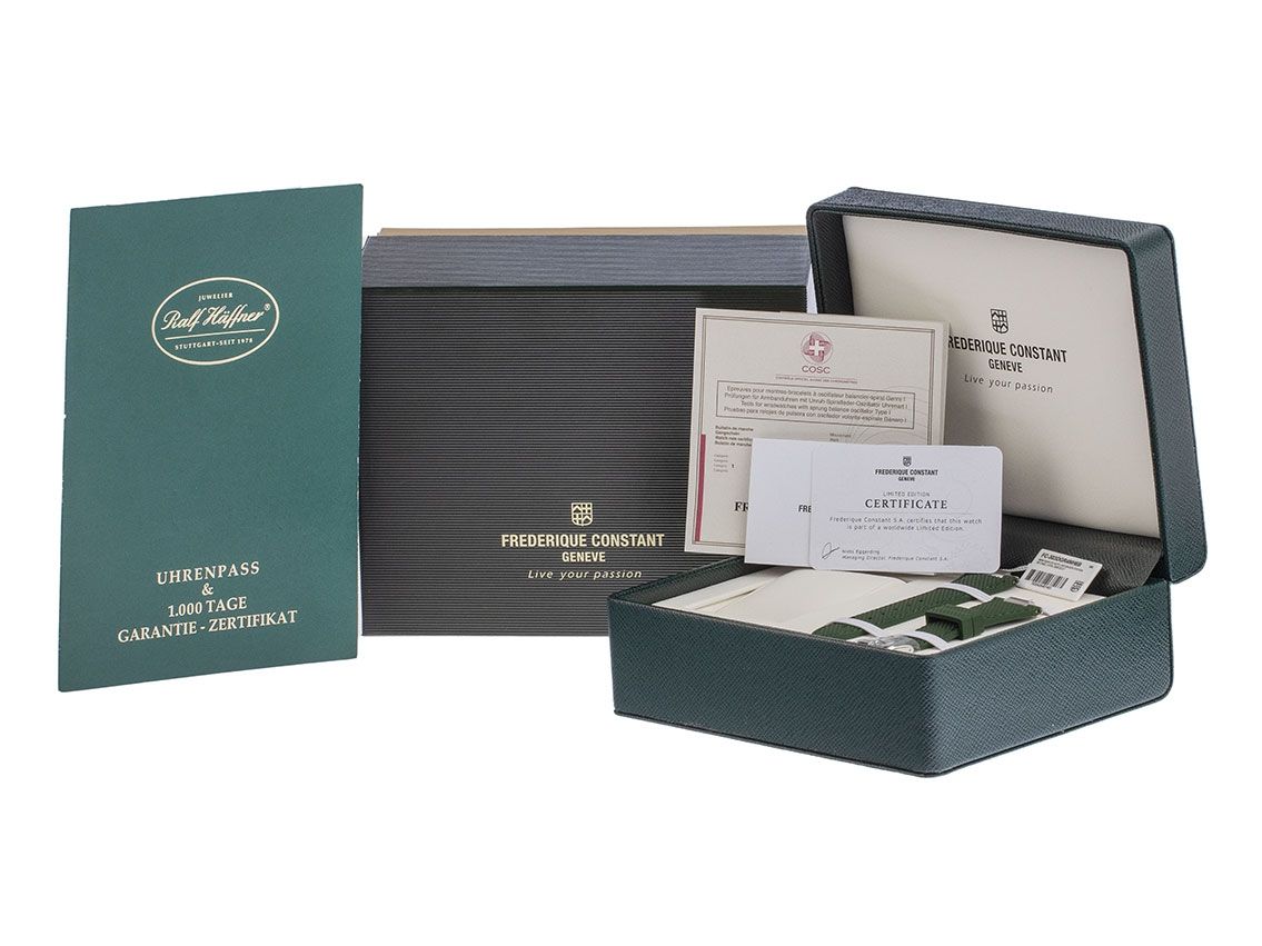 Gehäuse Edelstahl poliert und satiniert, Gehäusedurchmesser ohne Krone 41mm, Gehäusehöhe 10,9mm. Lünette Edelstahl glatt und poliert. Armband Edelstahl poliert und satiniert, verdeckte Doppelsicherheitsfaltschließe Edelstahl mit Hersteller-Logo. Zifferblatt dunkelgrün mit aufgesetzten Edelstahl Leuchtindexen und Edelstahl Leuchtzeigern. Uhrwerk Automatik, Frederique Constant Manufakturkaliber FC-303 mit 26 Edelsteinen, Gangreserve ca. 38 Stunden, 28.800A/h. Anzeige von Stunde, Minute und Sekunde über Zeiger aus der Mitte mit Sekundenstopp zur sekundengenauen Einstellung der Uhrzeit, Datumsanzeige mit Schnellverstellung unter Glaslupe bei 3 Uhr. Saphirglas kratzfest und gewölbt. Krone mit Hersteller-Logo. Boden Edelstahl 4-fach verschraubt und graviert mit Saphirglas Sichtfenster. Gewicht der Uhr inklusive Armband 156g, Länge des Armbandes inklusive Gehäuse 205mm. Wasserdicht bis 5 ATM. Referenznummer: FC-303DGR4NH6B, Gehäusenummer: 4032XXX, ID: ST254622700123H-1895, Artikelnummer: 10000068251. Original Frederique Constant Box und Garantie Papiere sowie Beschreibung und Wechsel-Armband, Full Set. Limitiert auf 99 Exemplare. Neu. Lieferzeit sofort.