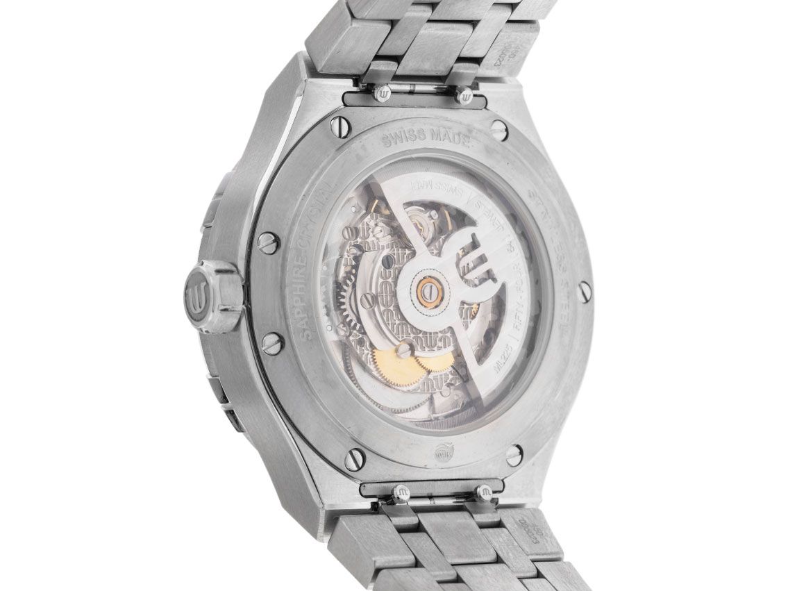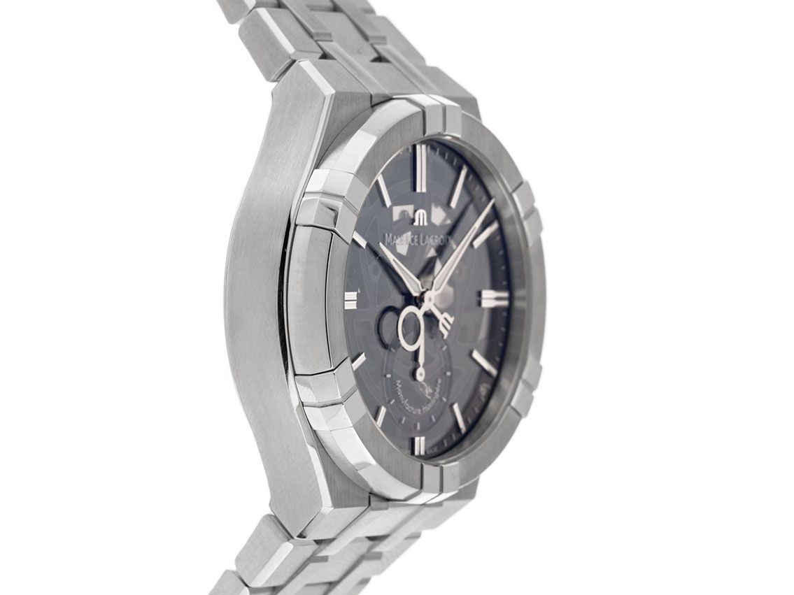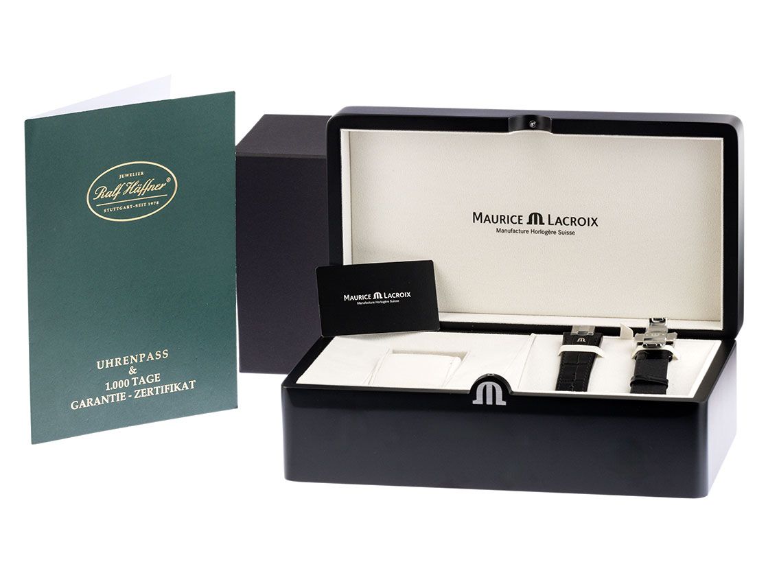 Gehäuse Edelstahl satiniert, Gehäusedurchmesser ohne Krone 44mm, Gehäusehöhe 14,8mm. Lünette Edelstahl satiniert mit polierten Reitern. Armband Edelstahl poliert und satiniert, Doppelsicherheitsfaltschließe Edelstahl mit Hersteller-Logo. Zifferblatt schwarz matt, skelettiert mit aufgesetzten Edelstahl Leuchtindexen und polierten Edelstahl Leuchtzeigern. Uhrwerk Automatik mit patentiertem Zeitspeicher-Modul (frei schwingende Zeiger, die nur in aufrechter Position die korrekte Uhrzeit anzeigen), Maurice Lacroix Kaliber ML225 mit 54 Edelsteinen. Anzeige von Stunde und Minute über Zeiger aus der Mitte, kleine Sekunde mit Sekundenstopp zur sekundengenauen Einstellung der Uhrzeit bei 6 Uhr. Saphirglas kratzfest. Krone verschraubbar mit Hersteller-Logo. Boden Edelstahl 7-fach verschraubt und graviert mit Saphirglas Sichtfenster. Gewicht der Uhr inklusive Armband 217g, Länge des Armbands inkl. Gehäuse 215mm. Wasserdicht bis 10 ATM. Referenznummer: AI6088-SS002-030-1, Gehäusenummer: AY52XXX, ID: ST197553561123RE-7500, Artikelnummer: 10000072278. Original Maurice Lacroix Box mit Umkarton und Garantie Papiere sowie Beschreibung und Wechselarmband Leder schwarz, Full Set. Neu. Lieferzeit sofort.