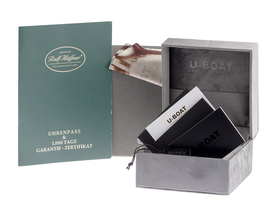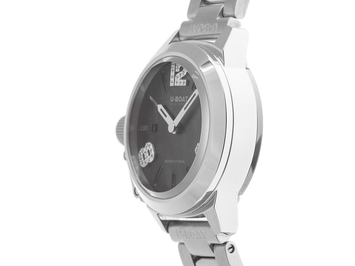 Gehäuse Edelstahl poliert, Gehäusedurchmesser ohne Krone 30mm, Gehäusehöhe 11,4mm. Lünette Edelstahl glatt und poliert. Armband Edelstahl poliert und satiniert, Doppelfaltschließe Edelstahl mit Hersteller-Logo. Zifferblatt Perlmutt Black mit aufgesetzten arabischen Diamantindexen, zusammen ca. 0,08ct sowie Indexen und Edelstahl Zeigern. Uhrwerk quarzgesteuert, Kaliber Ronda 774. Anzeige von Stunde und Minute über Zeiger aus der Mitte, Datumsanzeige mit Schnellverstellung bei 9 Uhr. Saphirglas kratzfest. Krone mit speziellem Kronenschutz, verschraubbar bei 9 Uhr. Boden Edelstahl 4-fach verschraubt und graviert mit Mineralglas. Gewicht der Uhr inklusive Armband 83g, Länge des Armbandes inklusive Gehäuse 170mm. Wasserdicht 5 ATM. Referenznummer: 8899, ID: ST115427260424H-2400, Artikelnummer: 10000074506. Original U-Boat Box mit Umkarton und Garantie Papiere sowie Diamant-Zertifikat und Poliertuch, Full Set. Neu. Lieferzeit sofort.