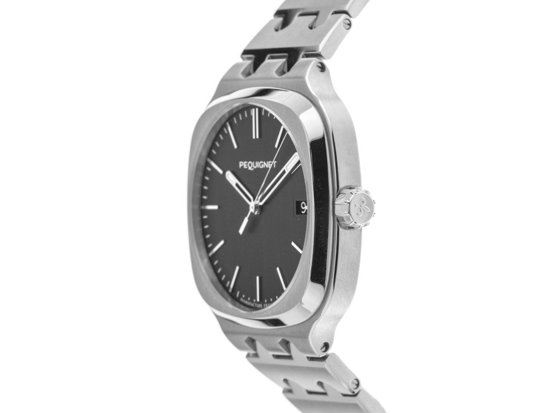 Gehäuse Edelstahl poliert und satiniert, Gehäusedurchmesser ohne Krone 40mm, Gehäusehöhe 9,25mm. Lünette Edelstahl glatt, poliert und satiniert. Armband Edelstahl poliert und satiniert, verdeckte Doppelfaltschließe Edelstahl mit Hersteller-Logo. Zifferblatt deep charcoal grey mit aufgesetzten Edelstahl Indexen und Edelstahl Leuchtzeigern. Uhrwerk Automatik, Calibre Initial® mit 21 Edelsteinen. Gangreserve ca. 65 Stunden. Anzeige von Stunde, Minute und Sekunde über Zeiger aus der Mitte mit Sekundenstopp zur sekundengenauen Einstellung der Uhrzeit, Datumsanzeige mit Schnellverstellung bei 3 Uhr. Saphirglas kratzfest. Krone geriffelt mit Hersteller-Logo. Boden Edelstahl 6-fach verschraubt und graviert mit Saphirglas Sichtfenster. Gewicht der Uhr inklusive Armband 140g, Länge des Armbandes inklusive Gehäuse 190mm. Wasserdicht bis 10 ATM. Referenznummer: 9040443, Gehäusenummer: 0XXX, ID: ST506440000624H-4000, Artikelnummer: 10000074900. Original Pequignet Box mit Umkarton und Garantie Papiere, sowie Beschreibung, Full Set. Neu. Lieferzeit sofort.