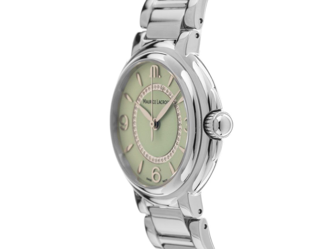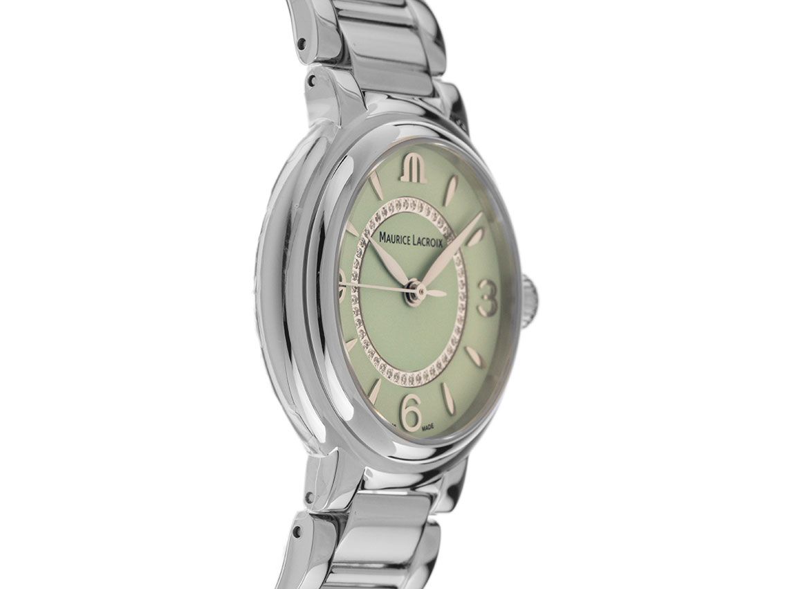 Gehäuse Edelstahl poliert, Gehäusedurchmesser ohne Krone 32mm, Gehäusehöhe 9,0mm. Lünette Edelstahl glatt und poliert. Armband Edelstahl poliert, verdeckte Doppelfaltschließe Edelstahl mit Hersteller-Logo. Zifferblatt grün mit aufgesetzten Edelstahl Indexen, arabischen Edelstahl Ziffern, Edelstahl Zeigern und 46 aufgesetzten Diamanten, W / SI (weiß mit kleinen Einschlüssen). Uhrwerk quarzgesteuert, Kaliber Maurice Lacroix, Basis Ronda10 1/2. Anzeige von Stunde, Minute und Sekunde über Zeiger aus der Mitte mit sekundenstopp zur sekundengenauen Einstellung der Uhrzeit. Saphirglas kratzfest und gewölbt. Krone geriffelt. Boden Edelstahl graviert. Gewicht der Uhr inklusive Armband 88g, Länge des Armbandes inkl. Gehäuse 200mm. Referenznummer: FA1104-SS002-G20-1, Gehäusenummer: BB43XXX, ID: ST197517260624H-1550, Artikelnummer: 10000074924. Original Maurice Lacroix Box und Garantie Papiere, Full Set. Neu. Lieferzeit sofort.