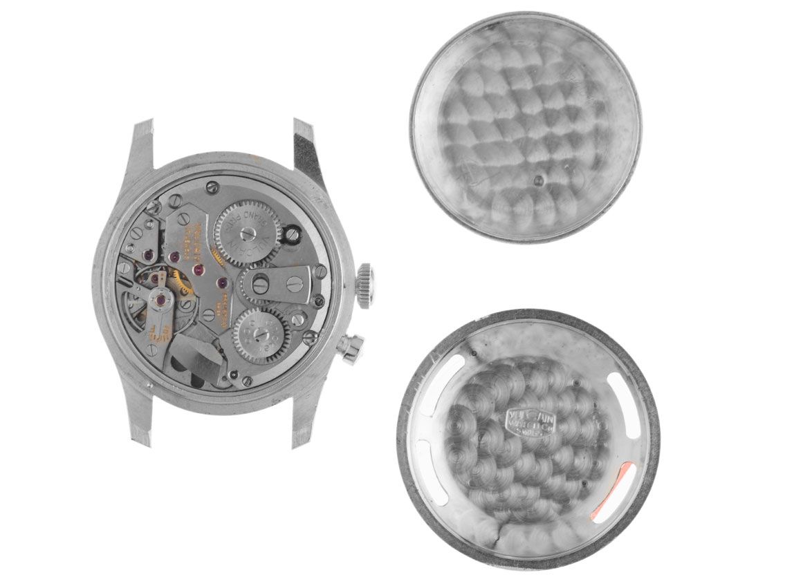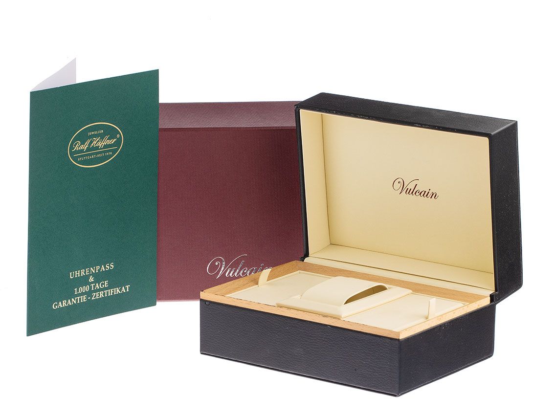 Gehäuse Edelstahl poliert, Gehäusedurchmesser ohne Krone 34mm, Gehäusehöhe 12,7mm. Lünette Edelstahl glatt und poliert. Armband Krokoleder schwarz mit Ziernaht, Anstoßbreite 18mm, Stiftschließe Edelstahl. Zifferblatt silberfarben mit aufgesetzten gelbgoldenen römischen Ziffern und Indexen sowie gelbgoldenen Zeigern. Uhrwerk Handaufzug, Wecker, Kaliber Vulcain 120 mit 17 Edelsteinen. Anzeige von Stunde, Minute und Sekunde über Zeiger aus der Mitte, Wecker über Zeiger aus der Mitte mit schwarzer Spitze. Plexiglas gewölbt. Boden Edelstahl verschraubt und graviert. Gewicht der Uhr inklusive Armband 46g. Gehäusenummer: 410XXX, Baujahr: 1969, ID: KS121332000624H-3500, Artikelnummer: 10000075209. Mit Gangkontrolle und kompletter äußerlicher Aufarbeitung von Juni 2024, inkl. 1000 Tage Garantie. Vulcain Box mit Umkarton und Uhrenpass. Superschnäppchen, extrem seltenes Sammlerstück, aus erster Hand. Sehr guter Zustand. Lieferzeit sofort.