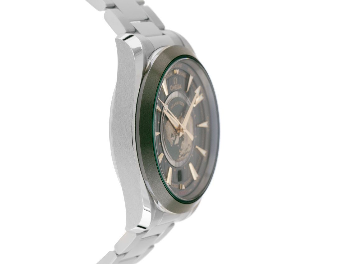Gehäuse Edelstahl poliert und satiniert, Gehäusedurchmesser ohne Krone 43mm, Gehäusehöhe 14,1mm. Lünette Keramik grün gebürstet. Armband Edelstahl poliert und satiniert, Doppelsicherheitsfaltschließe Edelstahl mit Hersteller-Logo. Zifferblatt grün mit Weltkarte aus lasergraviertem Titan, roségoldenen aufgesetzten Leuchtkeilindexen und roségoldenen Leuchtzeigern. Uhrwerk Automatik, Chronometer mit Zeugnis, Omega Manufakturkaliber 8938 mit 38 Edelsteinen, Gangreserve ca. 60 Stunden, Co-Axial Hemmung, Freie Unruh-Spiralfeder. Anzeige von Stunde, Minute und Sekunde über Zeiger aus der Mitte mit Sekundenstopp zur sekundengenauen Einstellung der Uhrzeit, Datumsanzeige mit Schnellverstellung bei 6 Uhr, zweite Zeitzone (GMT) und Tag- und Nachtanzeige ablesbar über Ring aus der Mitte, Weltstädteanzeige über äußeren Ring. Saphirglas kratzfest und gewölbt. Krone verschraubbar mit Hersteller-Logo. Boden Edelstahl verschraubt und graviert mit Saphirglas Sichtfenster. Gewicht der Uhr inklusive Armband 162g, Länge des Armbandes inklusive Gehäuse 200mm. Wasserdicht bis 15 ATM. Referenznummer: 220.30.43.22.10.001, ID: ST1160168401224H-11900, Artikelnummer: 10000077471. Original Omega Box mit Umkarton und Garantie Papiere von November 2024 sowie Beschreibung, Full Set. Ungetragen. Lieferzeit sofort.