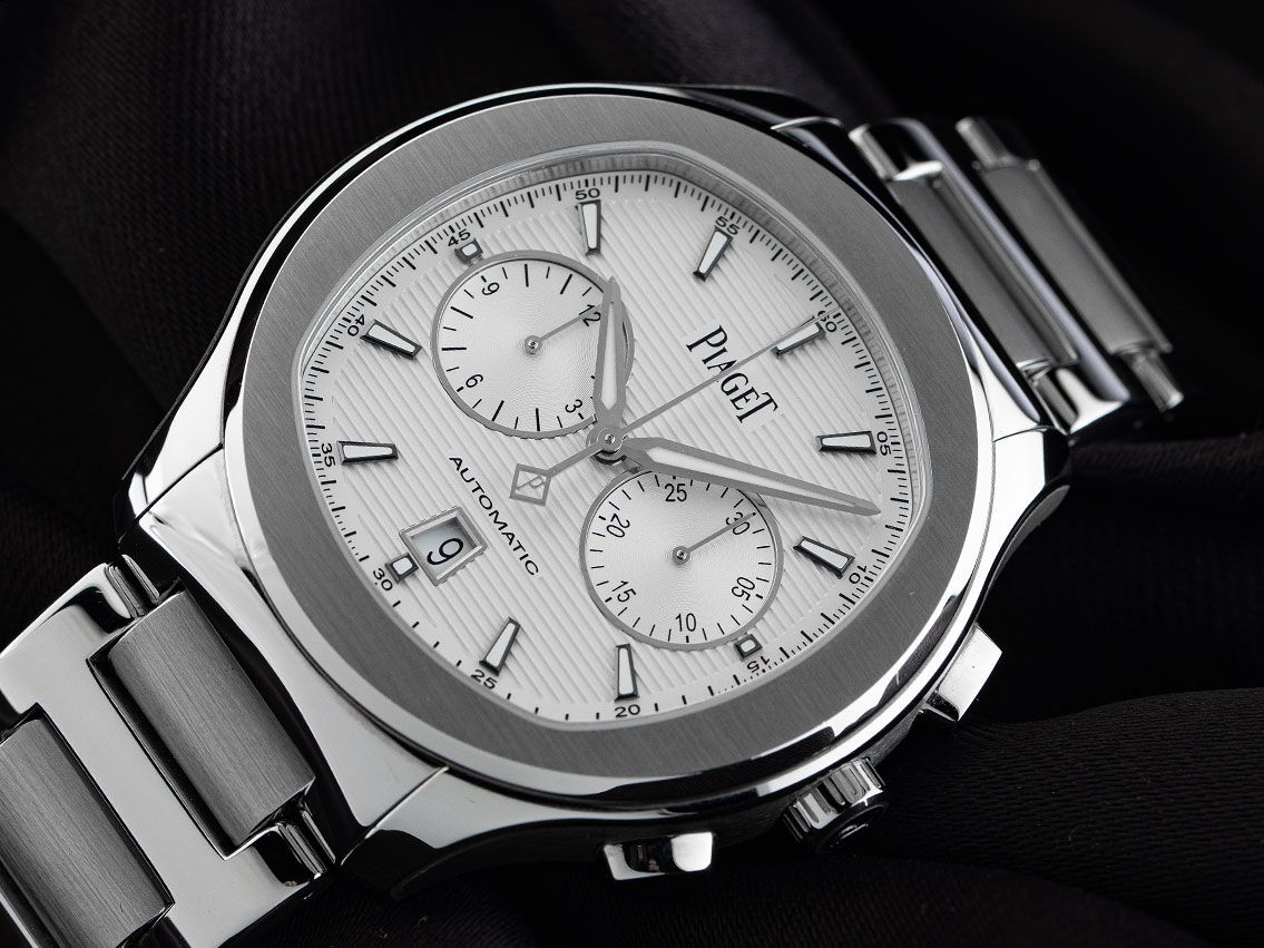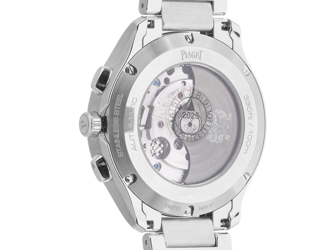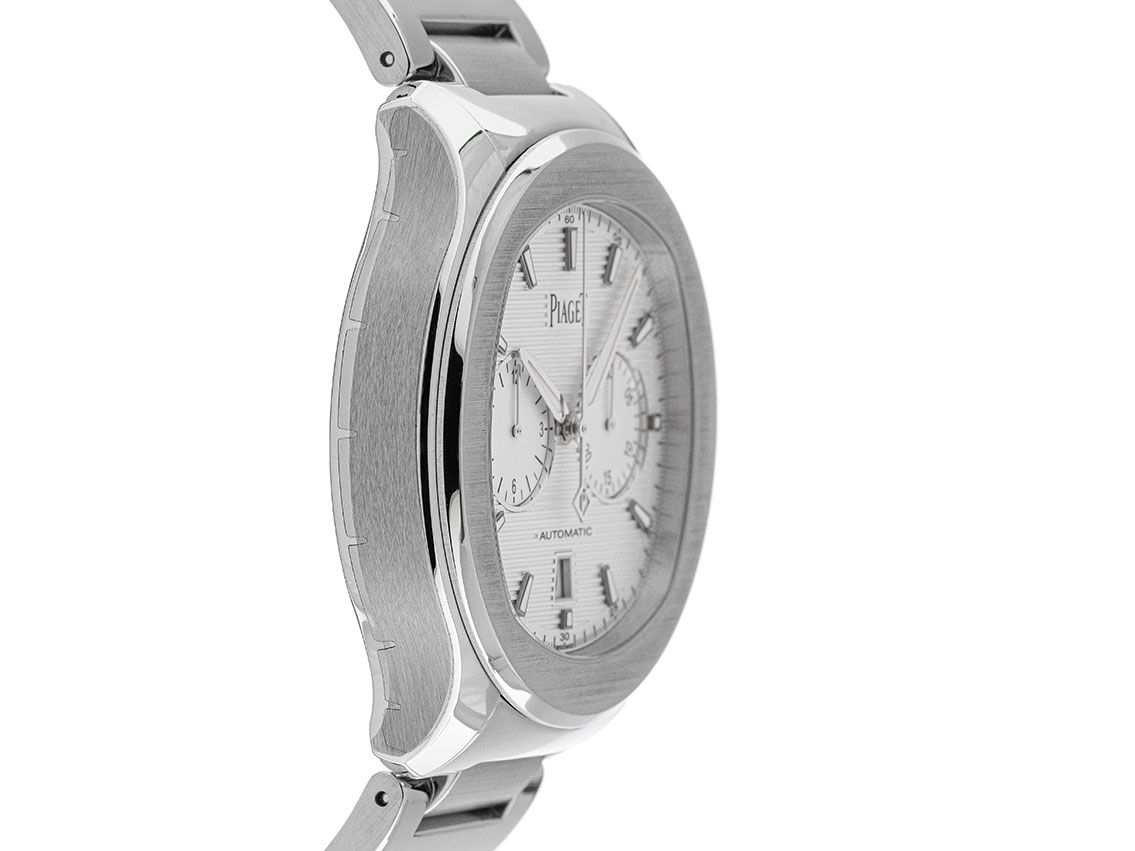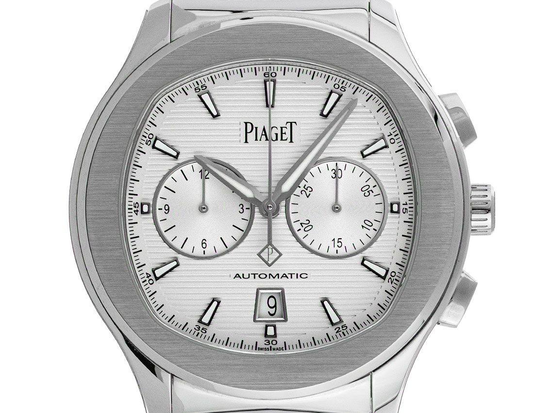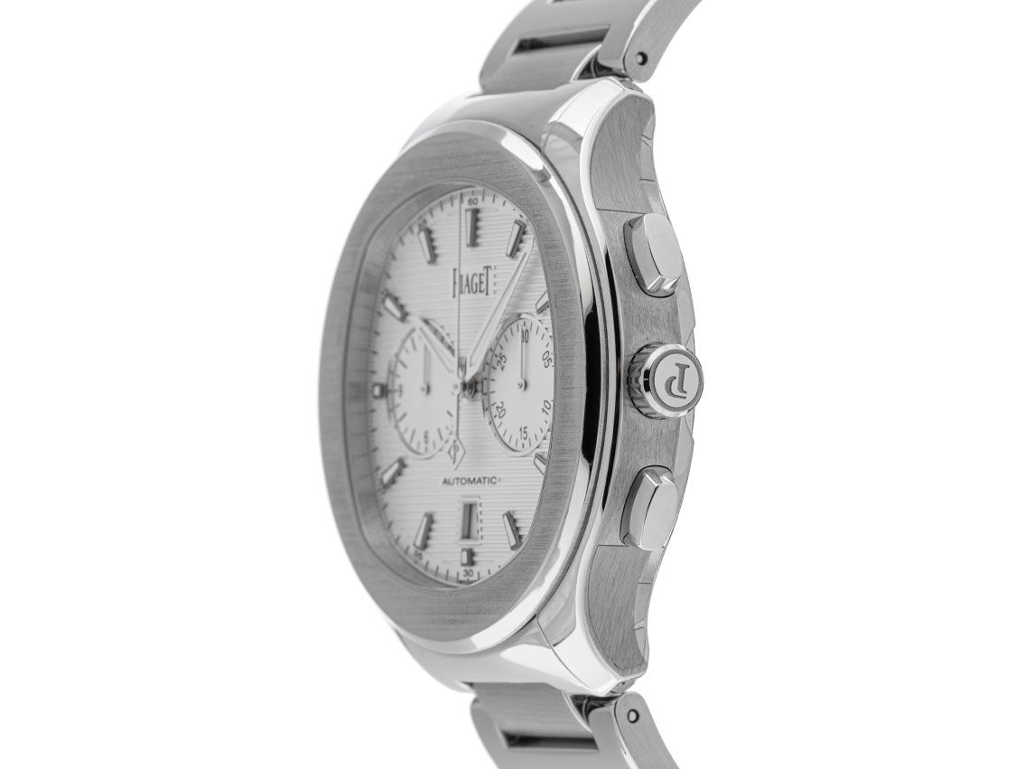 Gehäuse Edelstahl poliert und satiniert, Gehäusedurchmesser ohne Krone 42mm, Gehäusehöhe 11,2mm. Lünette Edelstahl poliert und satiniert. Armband Edelstahl poliert und satiniert, Doppelsicherheitsfaltschließe Edelstahl mit Hersteller-Logo. Zifferblatt silberfarben guillochiert mit aufgesetzten Leuchtindexen und Leuchtzeigern. Uhrwerk Automatik, Chronograph, Kaliber Piaget 1160P mit 35 Edelsteinen, Gangreserve ca. 50 Stunden. Anzeige von Stunde und Minute über Zeiger aus der Mitte, Datumsanzeige mit Schnellverstellung bei 6 Uhr. Saphirglas kratzfest. Krone mit Hersteller-Logo. Boden Edelstahl 6-fach verschraubt und graviert mit Saphirglas Sichtfenster. Gewicht der Uhr inklusive Armband 171g, Länge des Armbandes inkl. Gehäuse 205mm. Referenznummer: G0A41004, ID: ST1160226481224H-21000, Artikelnummer: 10000077717. Original Piaget Box mit Umkarton und Garantie Papiere von Dezember 2024, Full Set. Ungetragen. Lieferzeit sofort.