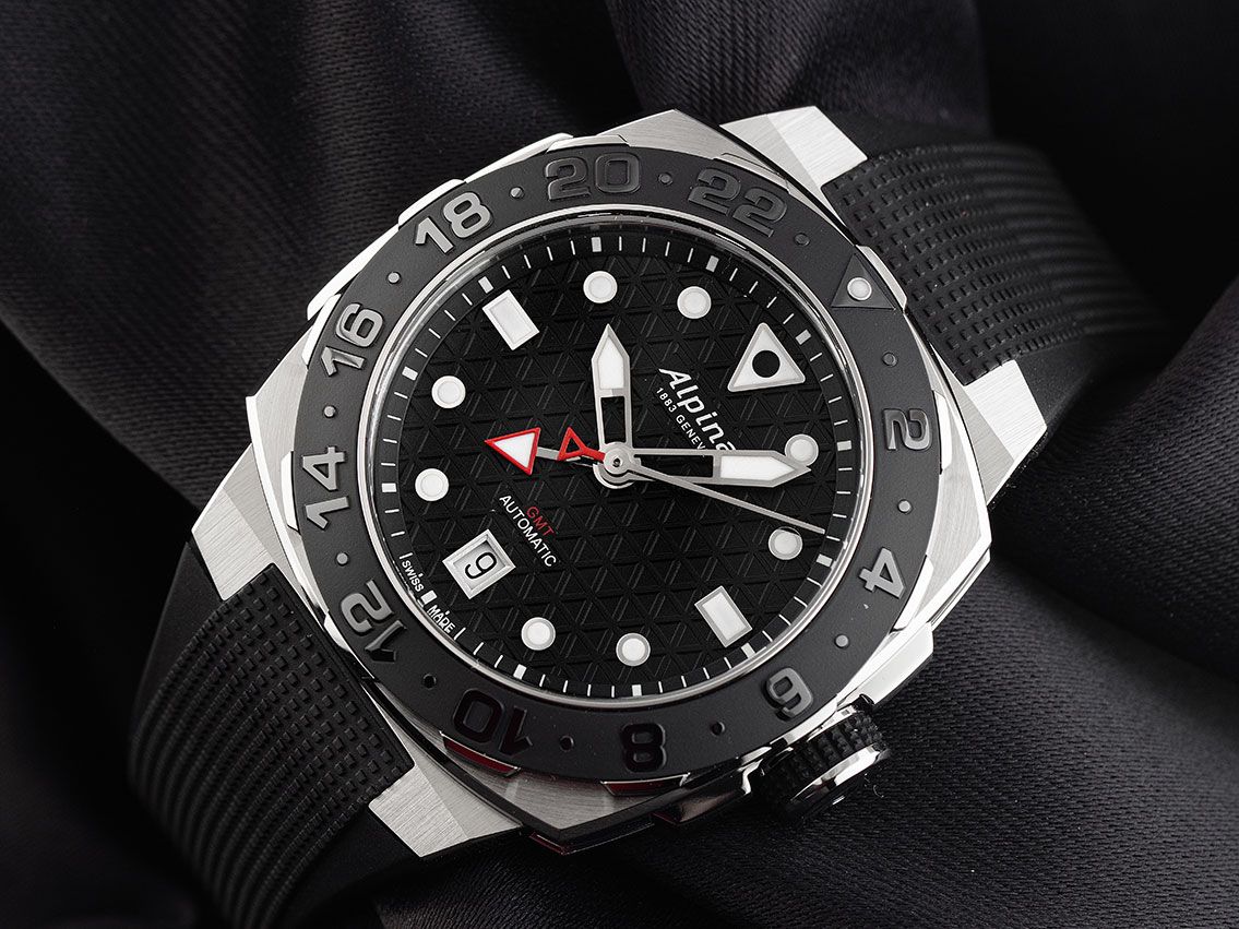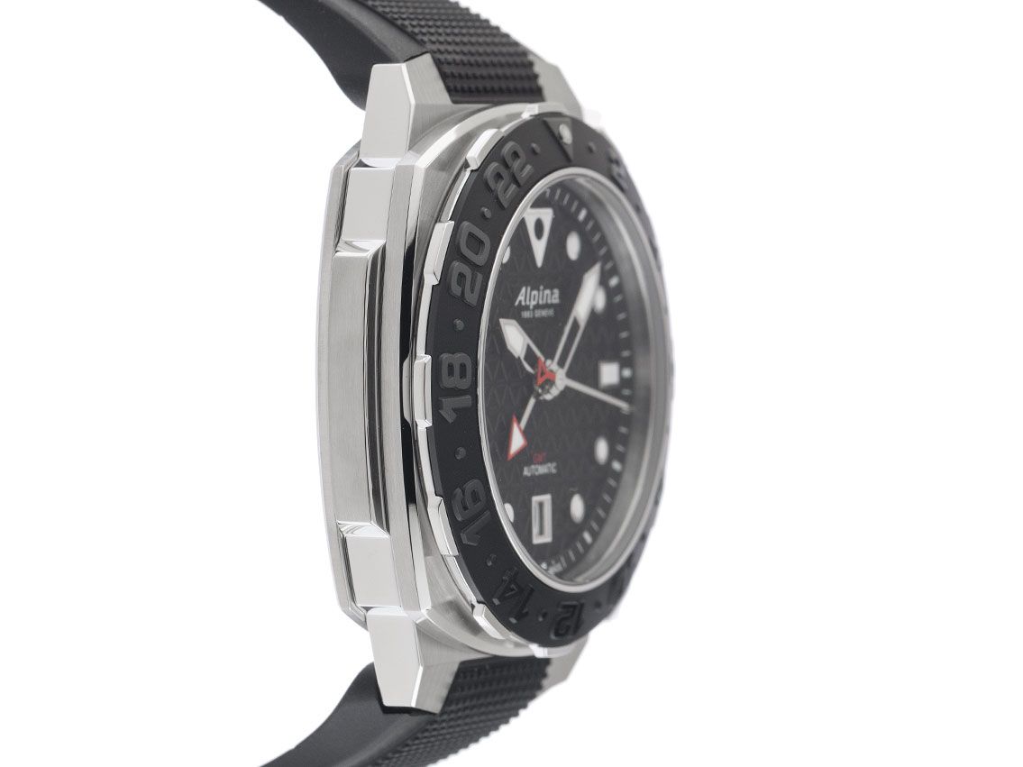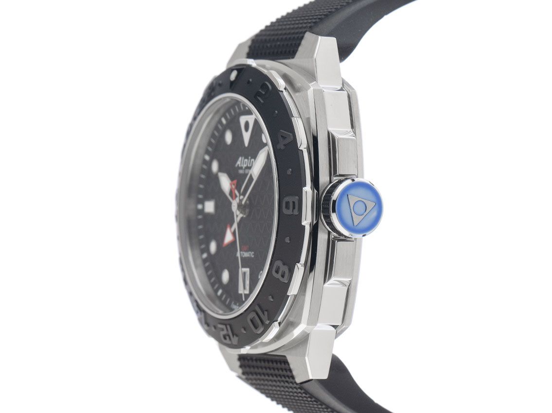 Gehäuse Edelstahl poliert und satiniert, Gehäusemaße ohne Krone (L x B x H) 40,5 x 39 x 12,0mm. Lünette Keramik schwarz matt mit 24-Stunden Skala, beidseitig drehbar. Armband Kautschuk schwarz, Sicherheitsfaltschließe Edelstahl mit Hersteller-Logo. Zifferblatt schwarz mit Dreiecksmuster, aufgesetzten Edelstahl Leuchtindexen und Edelstahl Leuchtzeigern. Uhrwerk Automatik, Kaliber AL-560 mit 25 Edelsteine, Gangreserve ca. 50 Stunden. Anzeige von Stunde, Minute und Sekunde über Zeiger aus der Mitte mit Sekundenstopp zur sekundengenauen Einstellung der Uhrzeit, Datumsanzeige mit Schnellverstellung bei 3 Uhr, zweite Zeitzone (GMT) ablesbar über Lünette, einstellbar über Zeiger mit roter Leuchtspitze aus der Mitte. Saphirglas kratzfest. Krone verschraubbar mit Hersteller-Logo. Boden Edelstahl 6-fach verschraubt und graviert. Gewicht der Uhr inklusive Armband 119g. Wasserdicht bis 30 ATM. Referenznummer: AL-560B3VE6, ID: ST254624960225H-2495, Artikelnummer: 10000078797. Original Alpina Box mit Umkarton und Garantie Papiere sowie Beschreibung, Full Set. Neu. Lieferzeit sofort.