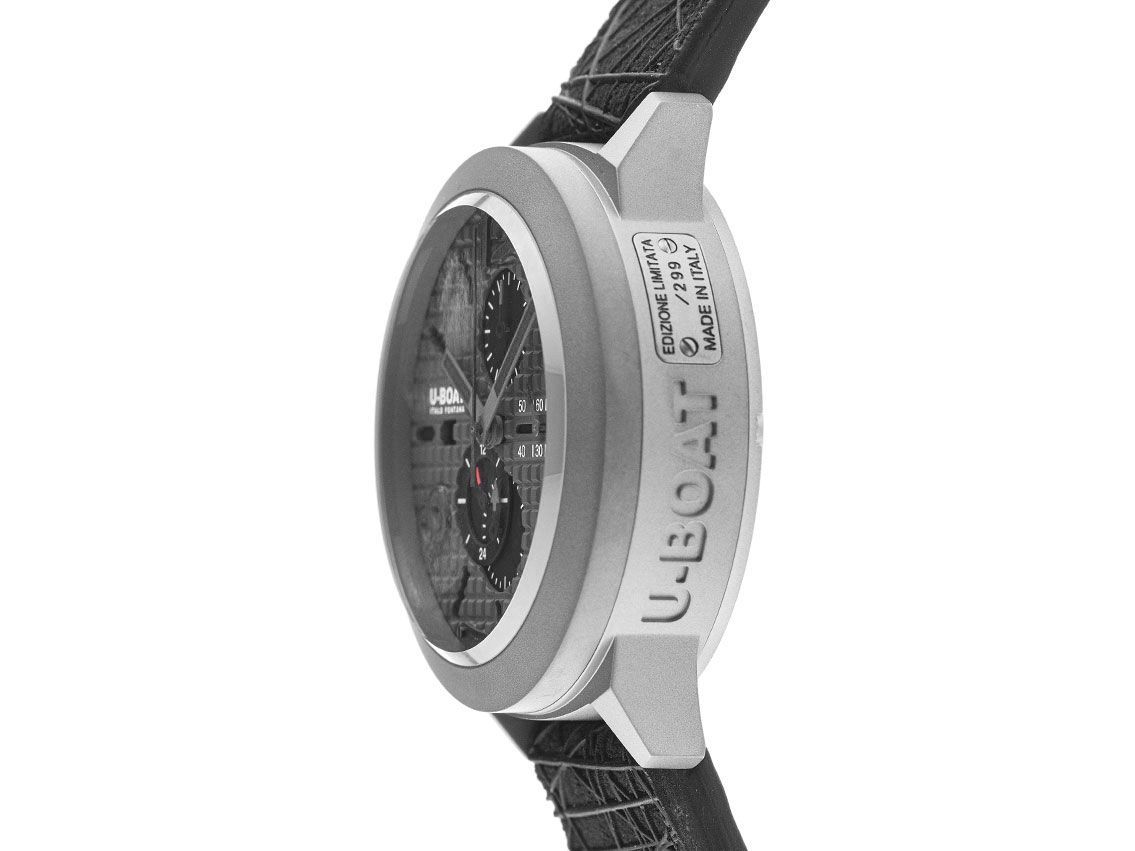Gehäuse Titan satiniert, Gehäusedurchmesser ohne Krone 45mm, Gehäusehöhe 18,3mm. Lünette glatt und satiniert. Armband Leder schwarz mit Kautschuk Verzierung, Anstoßbreite 22mm, Stiftschließe Titan mit Hersteller-Logo. Zifferblatt grau matt mit Waffelmuster, aufgesetzten arabischen Leuchtziffern und Indexen sowie Leuchtzeigern. Uhrwerk Automatik, Chronograph, Kaliber U-Boat mit 25 Edelsteinen, Gangreserve ca. 62 Stunden. Anzeige von Stunde und Minute über Zeiger aus der Mitte, kleine Sekunde mit Sekundenstopp zur sekundengenauen Einstellung der Uhrzeit bei 3 Uhr, Datumsanzeige mit Schnellverstellung bei 9 Uhr. Saphirglas kratzfest. Krone mit speziellem Kronenschutz verschraubbar bei 9 Uhr. Boden Titan 7-fach verschraubt und graviert mit Saphirglas Sichtfenster in U-Form. Gewicht der Uhr inklusive Armband 129g. Wasserdicht 10 ATM. Referenznummer: 3002, ID: ST115458320325RE-4900, Artikelnummer: 10000079168. Original U-Boat Box mit Umkarton und Garantie Papiere, Full Set. Limitiert auf 299 Exemplare. Neu. Lieferzeit sofort.
