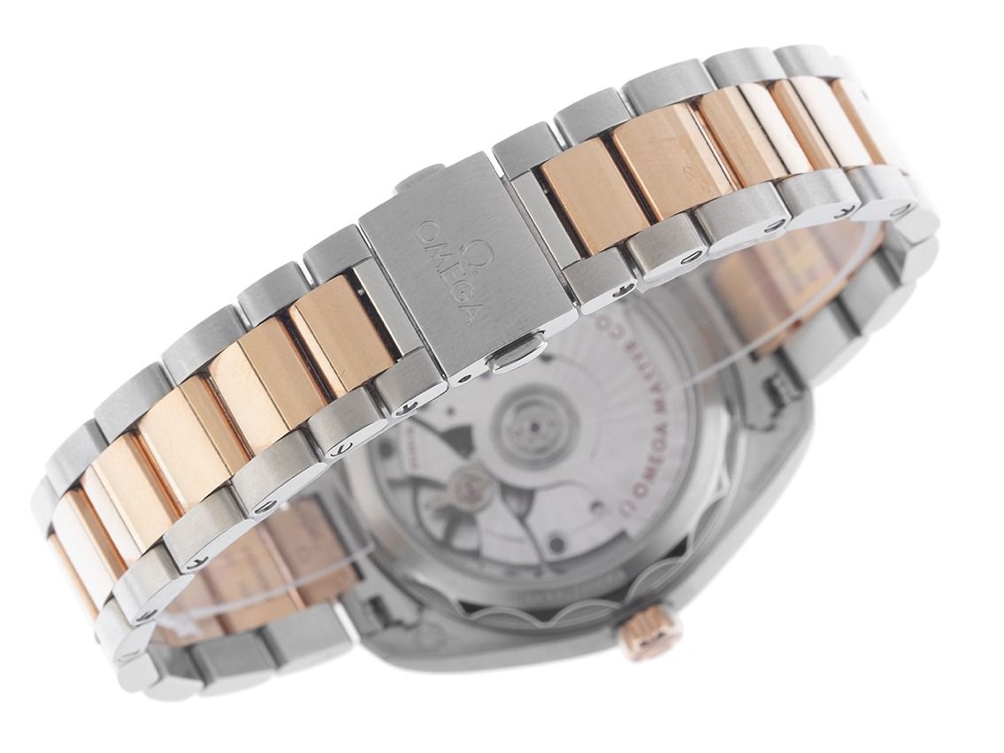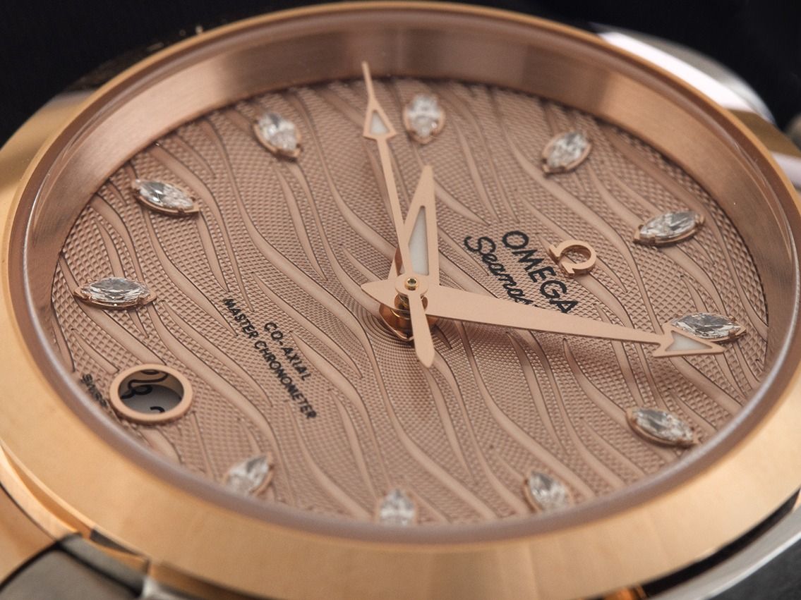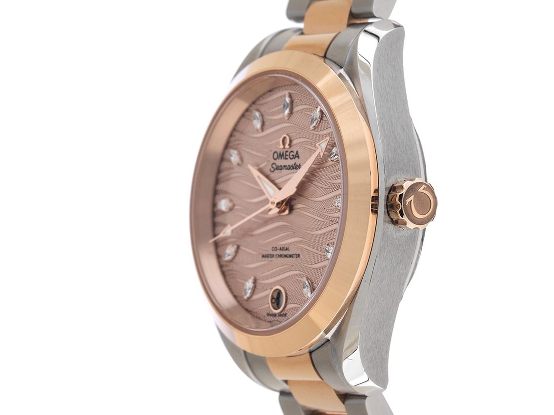 Gehäuse Edelstahl poliert und satiniert, Gehäusedurchmesser ohne Krone 34mm, Gehäusehöhe 11,9mm. Lünette 18kt Sedna™‑Gold glatt und poliert. Armband Edelstahl / 18kt Sedna™‑Gold poliert und satiniert, verdeckte Doppelsicherheitsfaltschließe Edelstahl / 18kt Sedna™‑Gold mit Hersteller-Logo. Zifferblatt wellenförmig nudefarben mit 11 aufgesetzten Diamantindexen, zusammen ca. 0,14ct TW / IF - VVS (feines Weiß lupenrein bis sehr sehr kleinen Einschlüssen) und 18kt Sedna™‑Gold Leuchtzeigern. Uhrwerk Automatik, Chronometer mit Zeugnis, Omega Manufakturkaliber 8800 mit 35 Edelsteinen, Gangreserve ca. 55 Stunden. Anzeige von Stunde, Minute und Sekunde über Zeiger aus der Mitte mit Sekundenstopp zur sekundengenauen Einstellung der Uhrzeit, Datumsanzeige mit Schnellverstellung bei 6 Uhr. Saphirglas kratzfest, gewölbt und beidseitig entspiegelt. Krone mit Hersteller-Logo. Boden Edelstahl verschraubt und graviert mit Saphirglas Sichtfenster. Gewicht der Uhr inklusive Armband 109g, Länge des Armbandes inklusive Gehäuse 165mm. Wasserdicht bis 15 ATM. Referenznummer: 220.20.34.20.59.001, ID: ST5122165120325H-17700, Artikelnummer: 10000079278. Original Omega Box mit Umkarton und Garantie Papiere von 2025, Full Set. Ungetragen. Lieferzeit sofort.