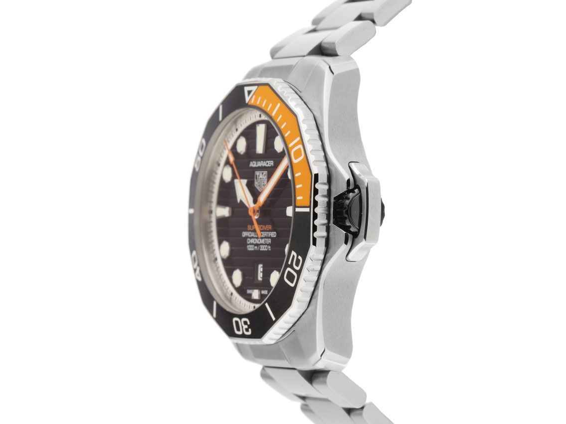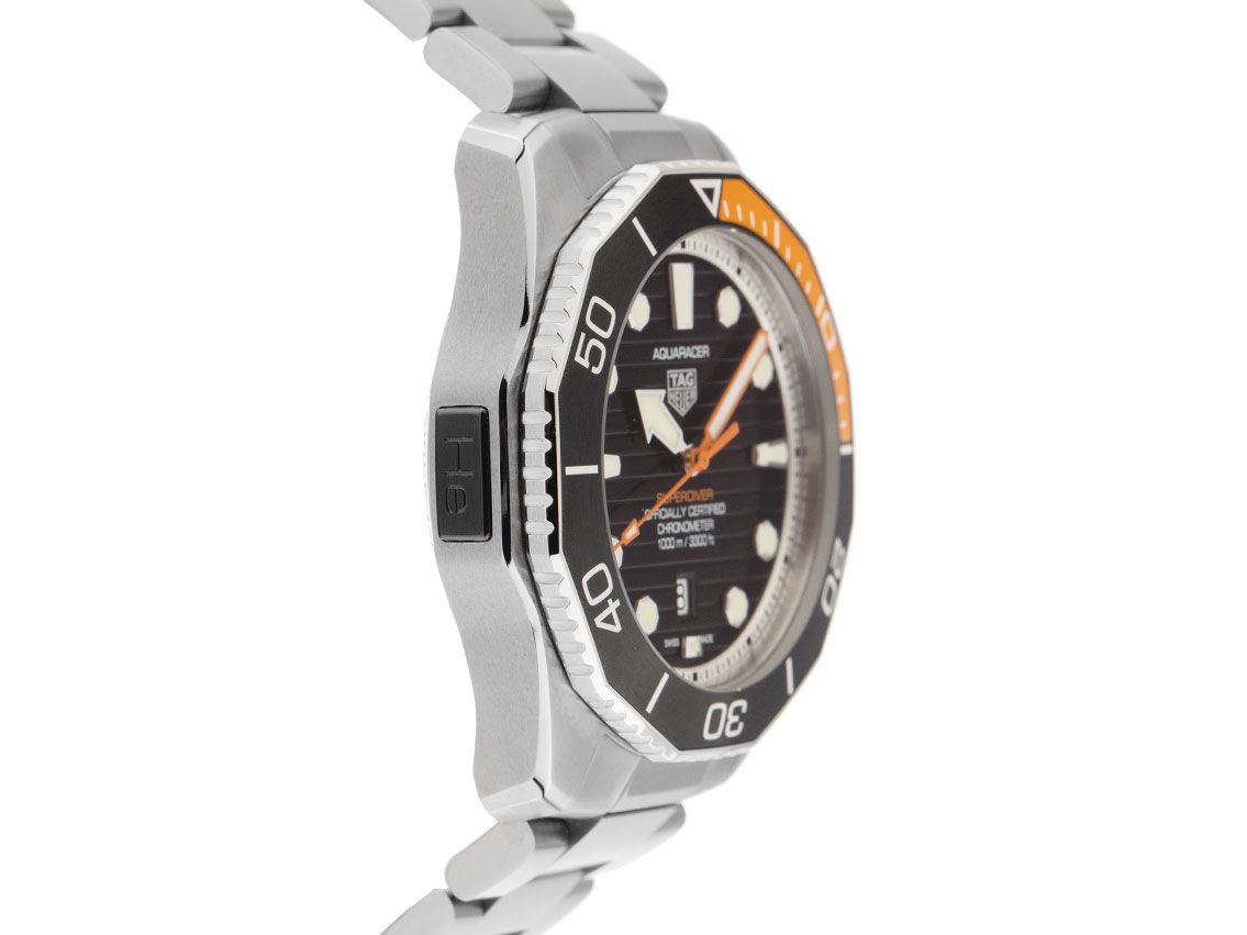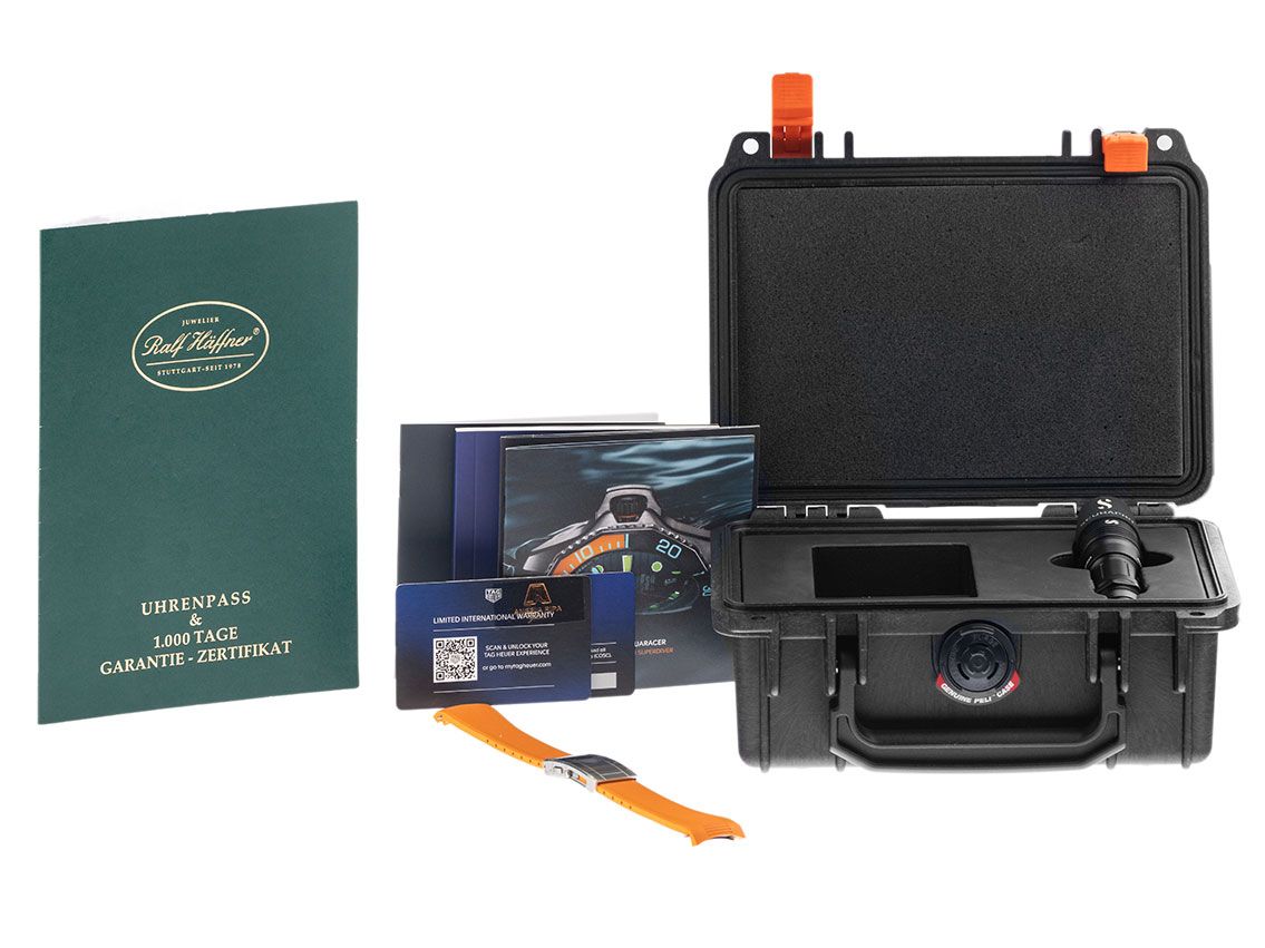 Gehäuse Titan poliert und satiniert, Gehäusedurchmesser ohne Krone 45mm, Gehäusehöhe 15,9mm. Lünette Titan mit schwarz / orangenem Inlay und 60-Minuten Skala, einseitig drehbar. Heliumventil bei 9 Uhr. Armband Titan poliert und satiniert, Sicherheitsfaltschließe Edelstahl mit Hersteller-Logo. Zifferblatt schwarz mit Streifendekor, aufgesetzten Edelstahl Leuchtindexen und polierten Edelstahl / orangenen Leuchtzeigern. Uhrwerk Automatik, Kaliber Tag Heuer TH30-00 mit 28 Edelsteinen, Gangreserve ca. 70 Stunden. Anzeige von Stunde, Minute und Sekunde über Zeiger aus der Mitte mit Sekundenstopp zur sekundengenauen Einstellung der Uhrzeit, Datumsanzeige mit Schnellverstellung bei 6 Uhr. Saphirglas kratzfest. Krone verschraubbar mit Flankenschutz und Hersteller-Logo. Boden Titan graviert. Gewicht der Uhr inklusive Armband 189g, Länge des Armbandes inkl. Gehäuse 205mm. Wasserdicht bis 100 ATM. Referenznummer: WBP5A8A.BF0619, ID: ST116091480425H-6950, Artikelnummer: 10000079638. Original Tag Heuer Box mit Umkarton und Garantie Papiere von März 2025 sowie Beschreibung und Wechselarmband Kautschuk orange, Full Set. Ungetragen. Lieferzeit sofort.
