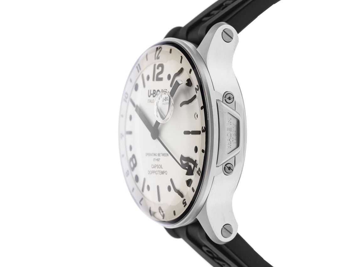 Gehäuse Edelstahl satiniert, Gehäusedurchmesser ohne Krone 45mm, Gehäusehöhe 18,6mm. U-Boat Armband Kautschuk schwarz, Anstoßbreite 22mm, Stiftschließe Edelstahl mit Hersteller-Logo. Zifferblatt weiß mit arabischen schwarzen Ziffern und schwarzen Indexen sowie schwarzen Zeigern. Uhr ist mit einem speziellen Öl gefüllt sowie einer Luftblase zum Ausgleich der Temperaturschwankungen. Uhrwerk quarzgesteuert, elektromechanisch, im Ölbad, arbeitet zwischen 0° und +60°C. Anzeige von Stunde und Minute über Zeiger aus der Mitte, zweite Zeitzone (GMT) ablesbar über Zeiger mit Pfeilspitze und Unterglaslünette, einstellbar über Krone bei 8 Uhr. Saphirglas kratzfest und gewölbt. Krone links bei 10 Uhr, verschraubbar. Boden Edelstahl verschraubt und graviert. Gewicht der Uhr inklusive Armband 145g. Wasserdicht 10 ATM. Referenznummer: 8888/B, ID: ST115425220425H-2300, Artikelnummer: 10000079753. Original U-Boat Box und Garantie Papiere, Full Set. Neu. Lieferzeit sofort.