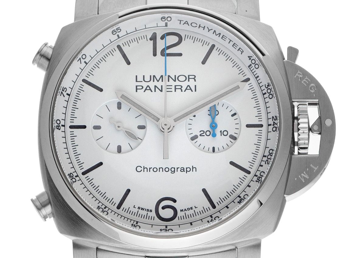 Gehäuse Edelstahl satiniert, Gehäusedurchmesser ohne Krone 44mm, Gehäusehöhe 18,2mm. Lünette Edelstahl glatt und poliert mit Unterglas Tachymeter-Skala. Armband Edelstahl poliert und satiniert, Doppelsicherheitsfaltschließe Edelstahl mit Hersteller-Logo. Zifferblatt weiß mit arabischen Ziffern und Indexen sowie Edelstahl Leuchtzeigern. Uhrwerk Automatik, Chronograph, Panerai Manufakturkaliber P.9200 mit 41 Edelsteinen, Gangreserve ca. 42 Stunden. Anzeige von Stunde und Minute über Zeiger aus der Mitte, kleine Sekunde mit Sekundenstopp zur sekundengenauen Einstellung der Uhrzeit bei 9 Uhr. Saphirglas kratzfest und bombiert. Krone mit patentiertem Panerai Verschluss und Schutzbügel. Boden Edelstahl verschraubt und graviert. Gewicht der Uhr inklusive Armband 193g, Länge des Armbandes inklusive Gehäuse 190mm. Referenznummer: PAM01548, ID: ST1160159700425H-11000, Artikelnummer: 10000079878. Original Panerai Box mit Umkarton und Garantie Papiere von März 2025 sowie Beschreibung und Bandwechselwerkzeug, Full Set. Ungetragen. Lieferzeit sofort.