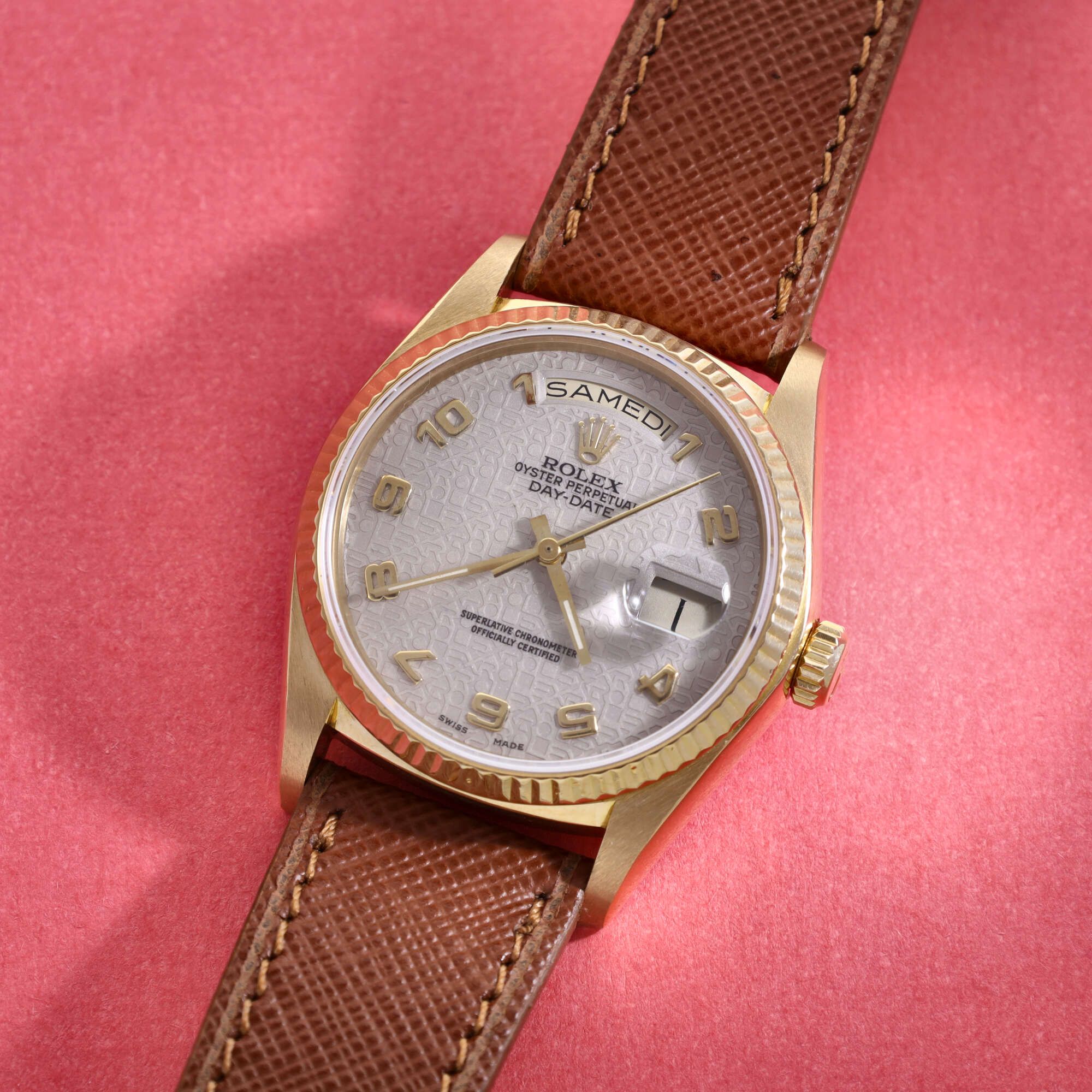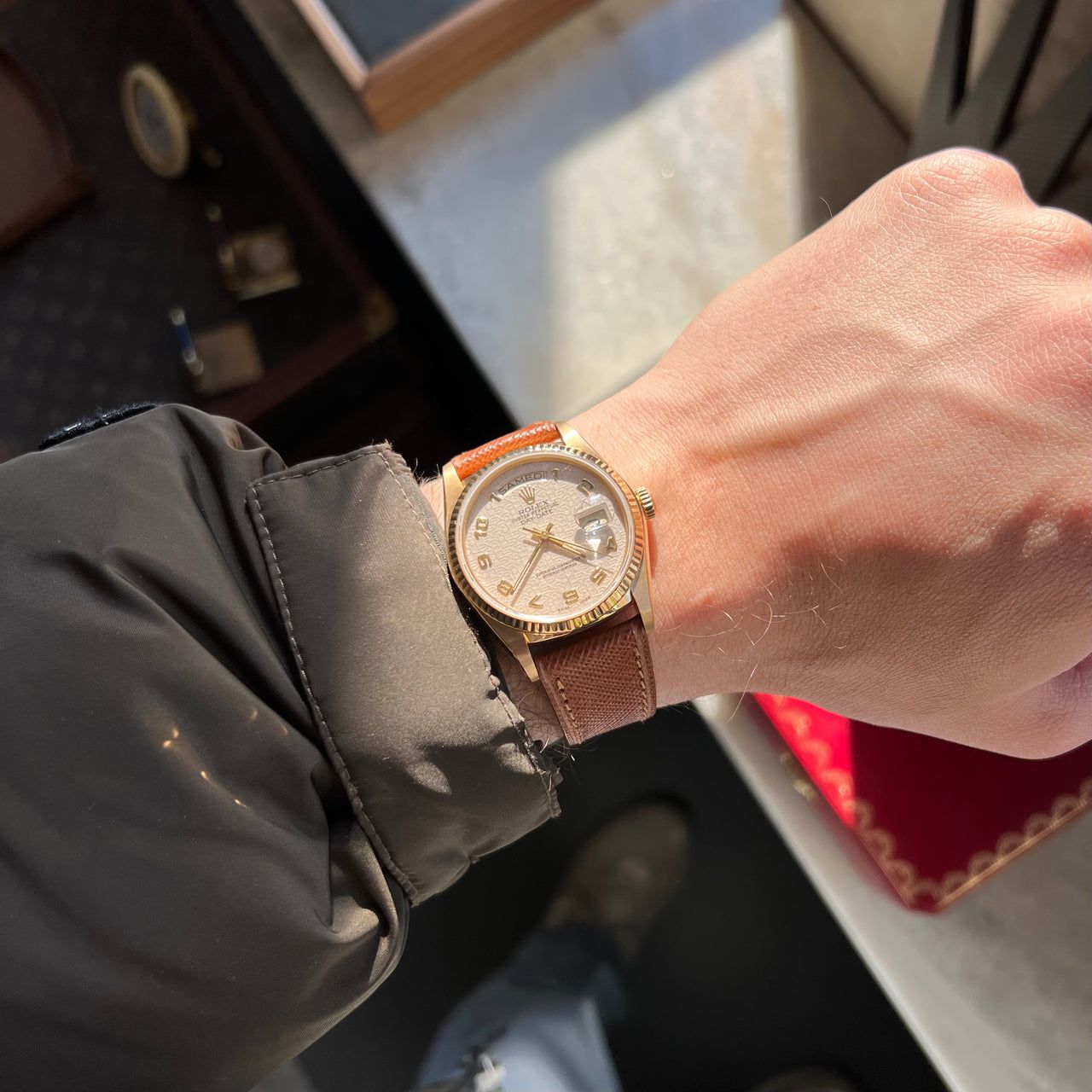 The dial on this Day-Date is seriously next level—impossible to capture properly in a pic. In the sun, it shimmers like metallic paint and under normal light it settles into this warm, creamy white tone. Honestly, the perfect vibe for this head-only listing. The dial really spices up the overall look.
