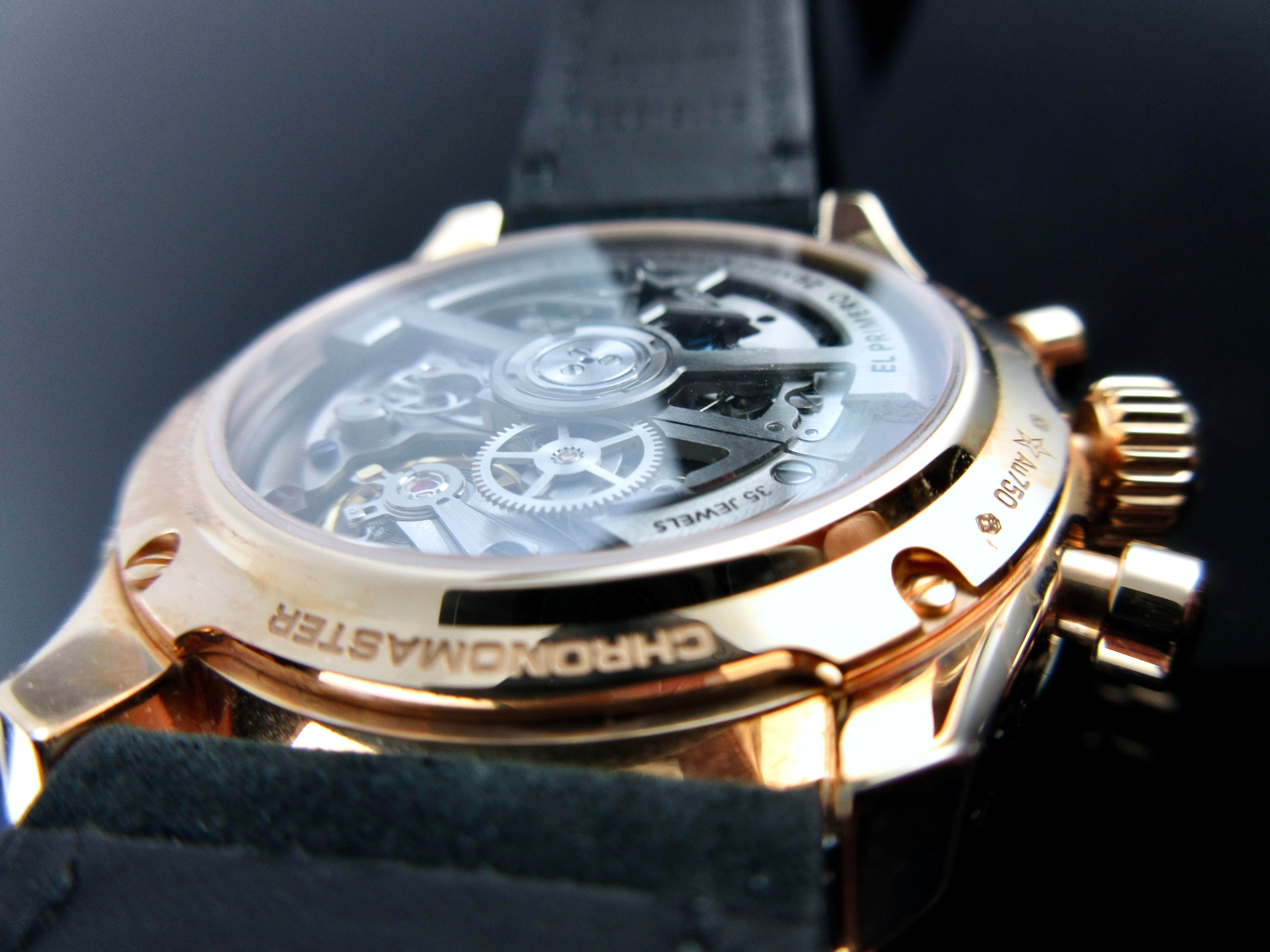 Stunden- und Minutenzeiger aus der Mitte Kleine Sekunde bei 9 Uhr Zehntelsekunden-Chronograph: – Zentraler Chronographenzeiger, der eine Umdrehung in 10 Sekunden vollführt – 60-Minuten-Zähler bei 6 Uhr – 60-Sekunden-Zähler bei 3 Uhr