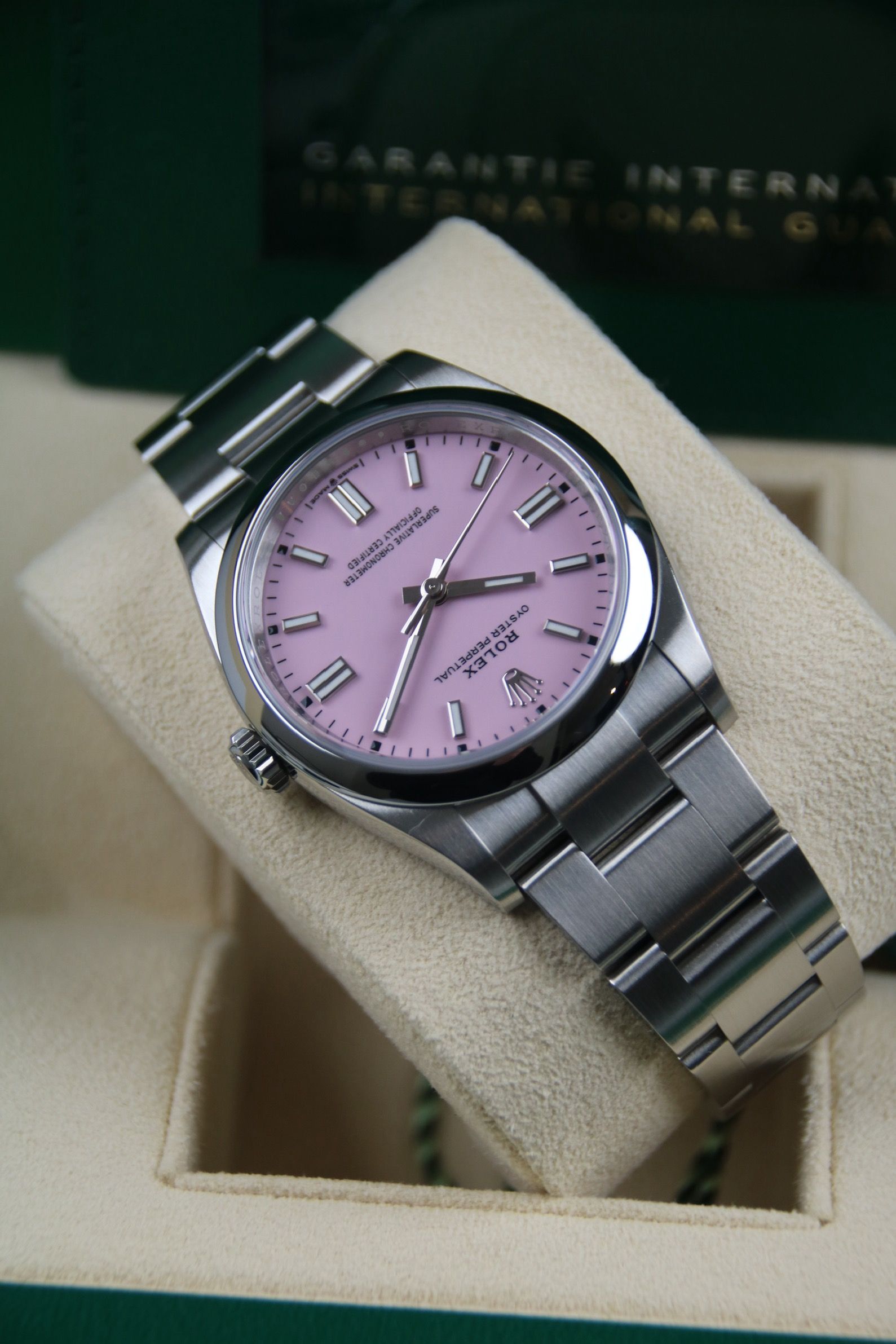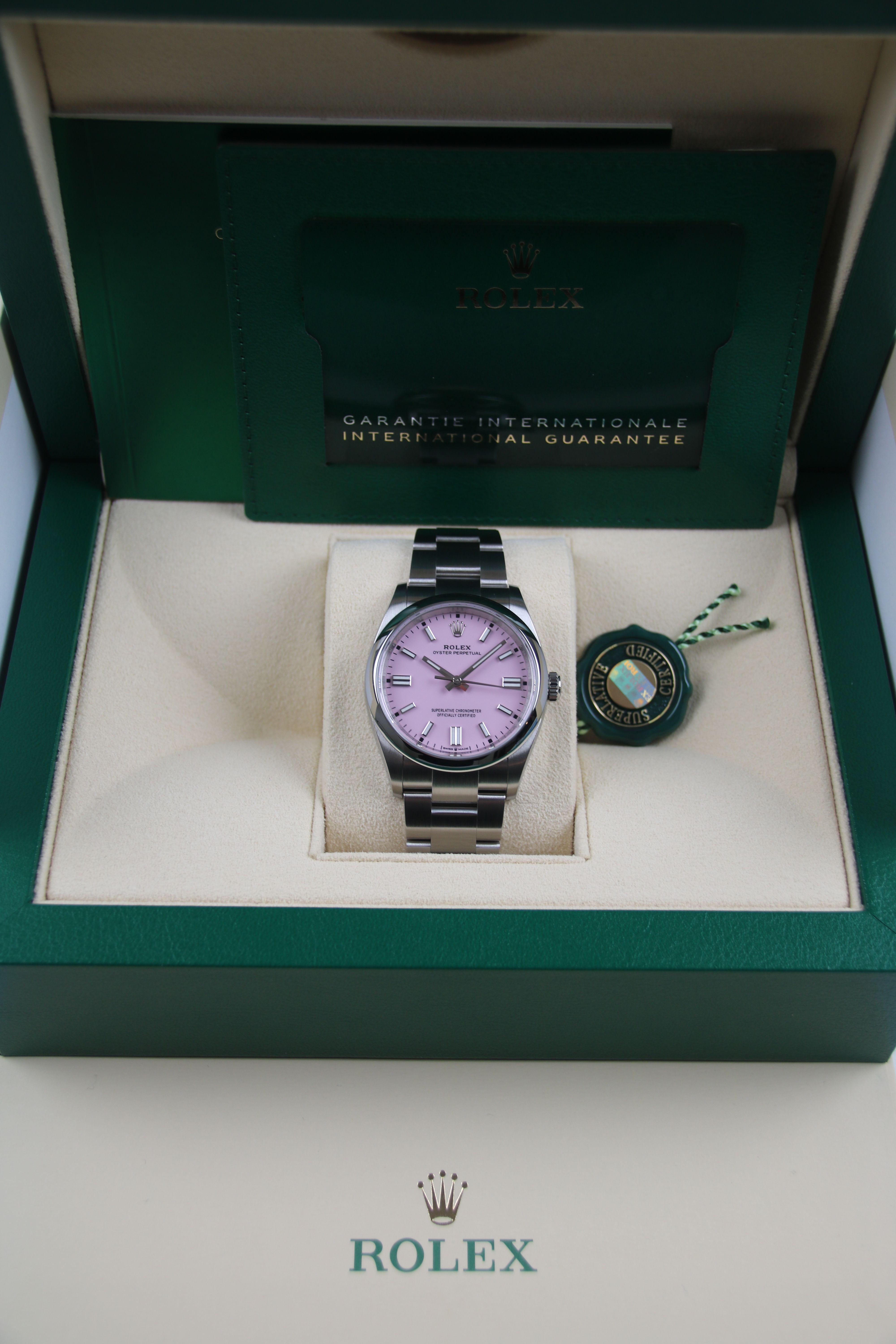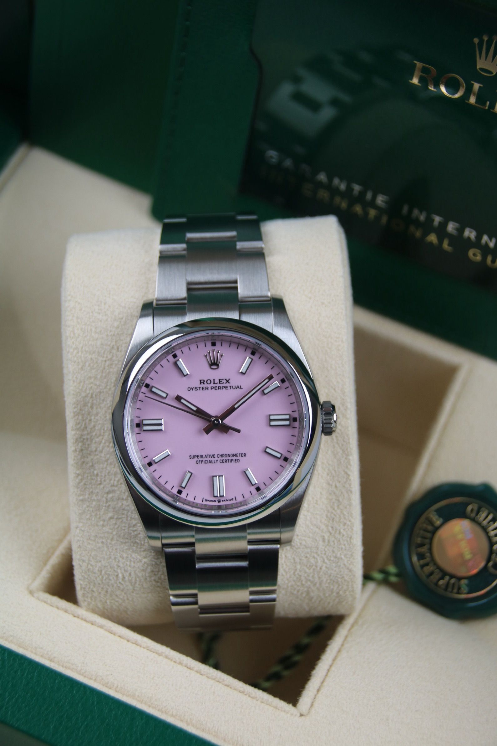 For sale is a brand new and unworn Rolex Oyster Perpetual 36 with original Candy Pink dial. This watch was bought at the authorized retailer in 2025 and comes as a perfect full set including box, papers etc. Rolex warranty till 2030.