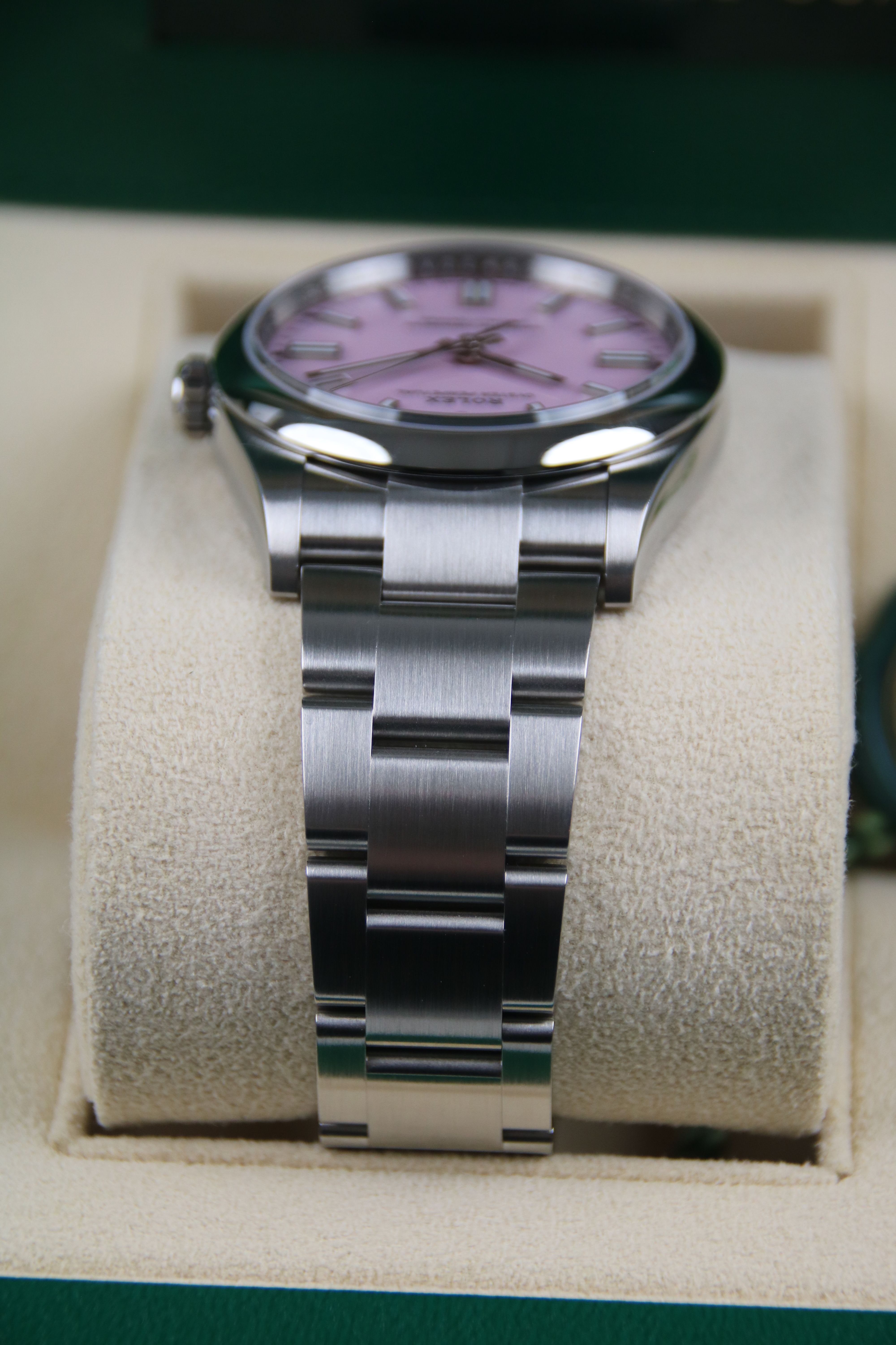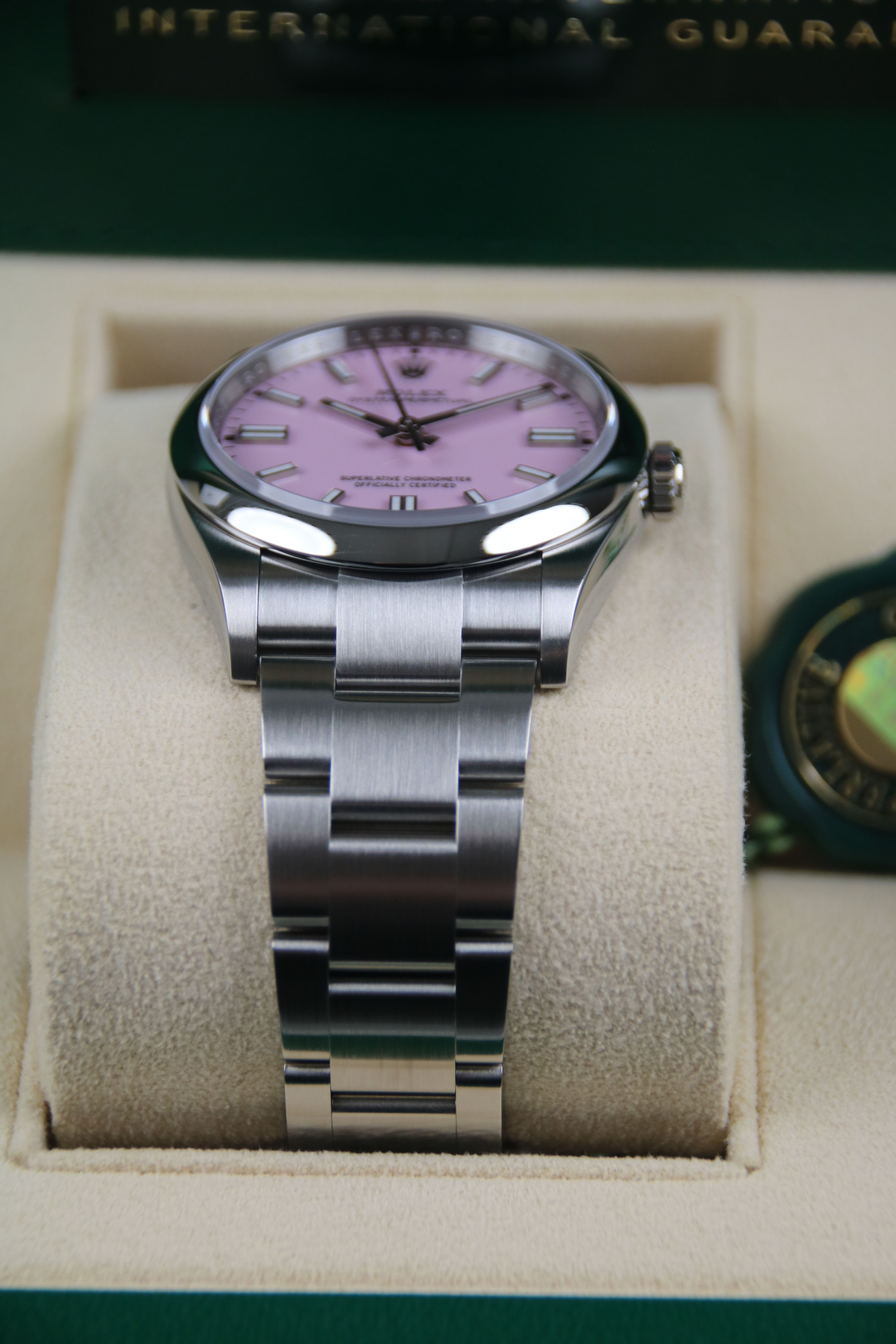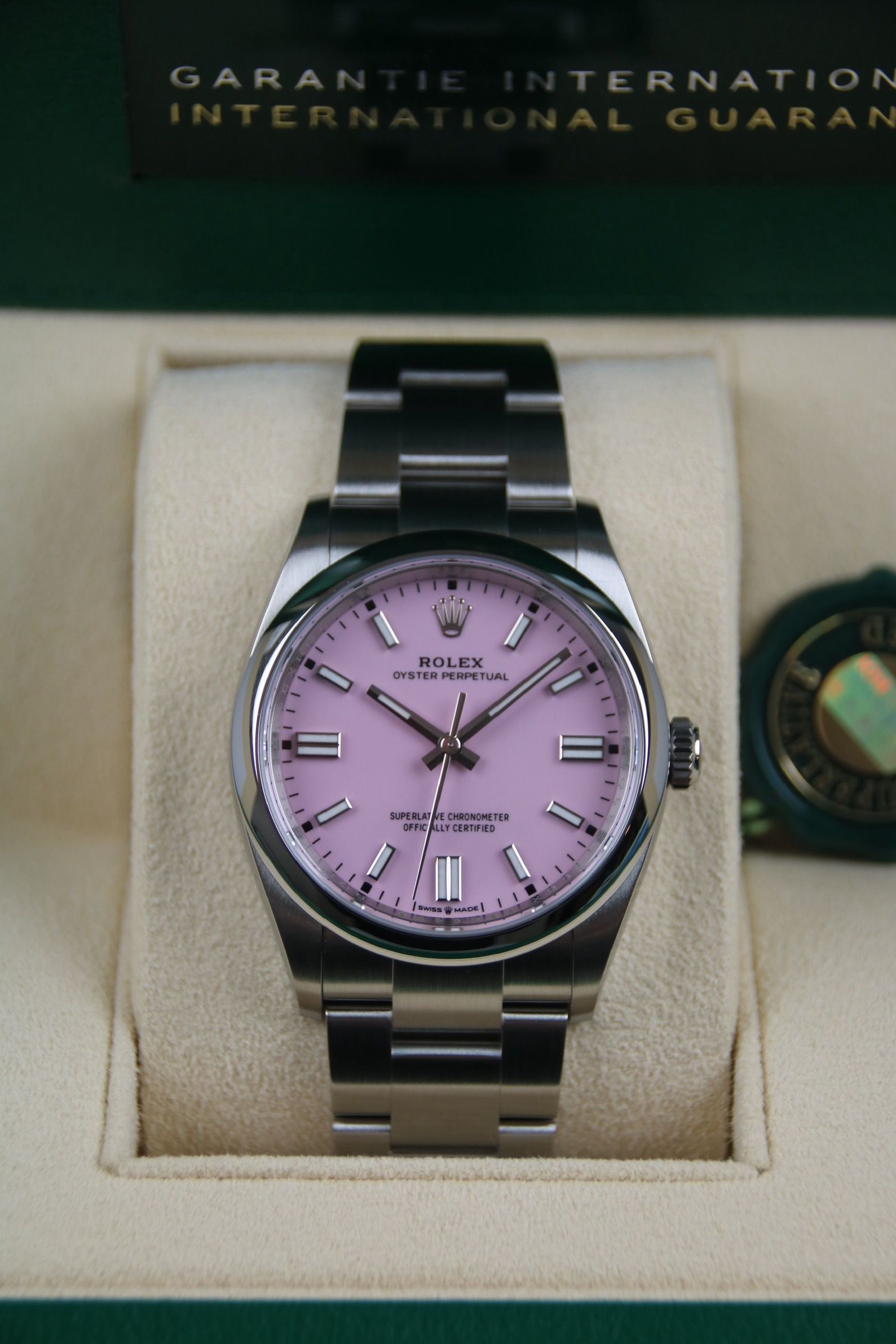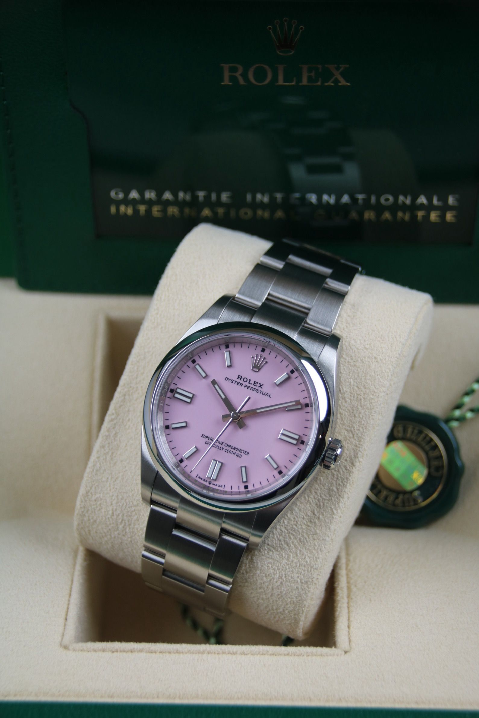 For sale is a brand new and unworn Rolex Oyster Perpetual 36 with original Candy Pink dial. This watch was bought at the authorized retailer in 2025 and comes as a perfect full set including box, papers etc. Rolex warranty till 2030.