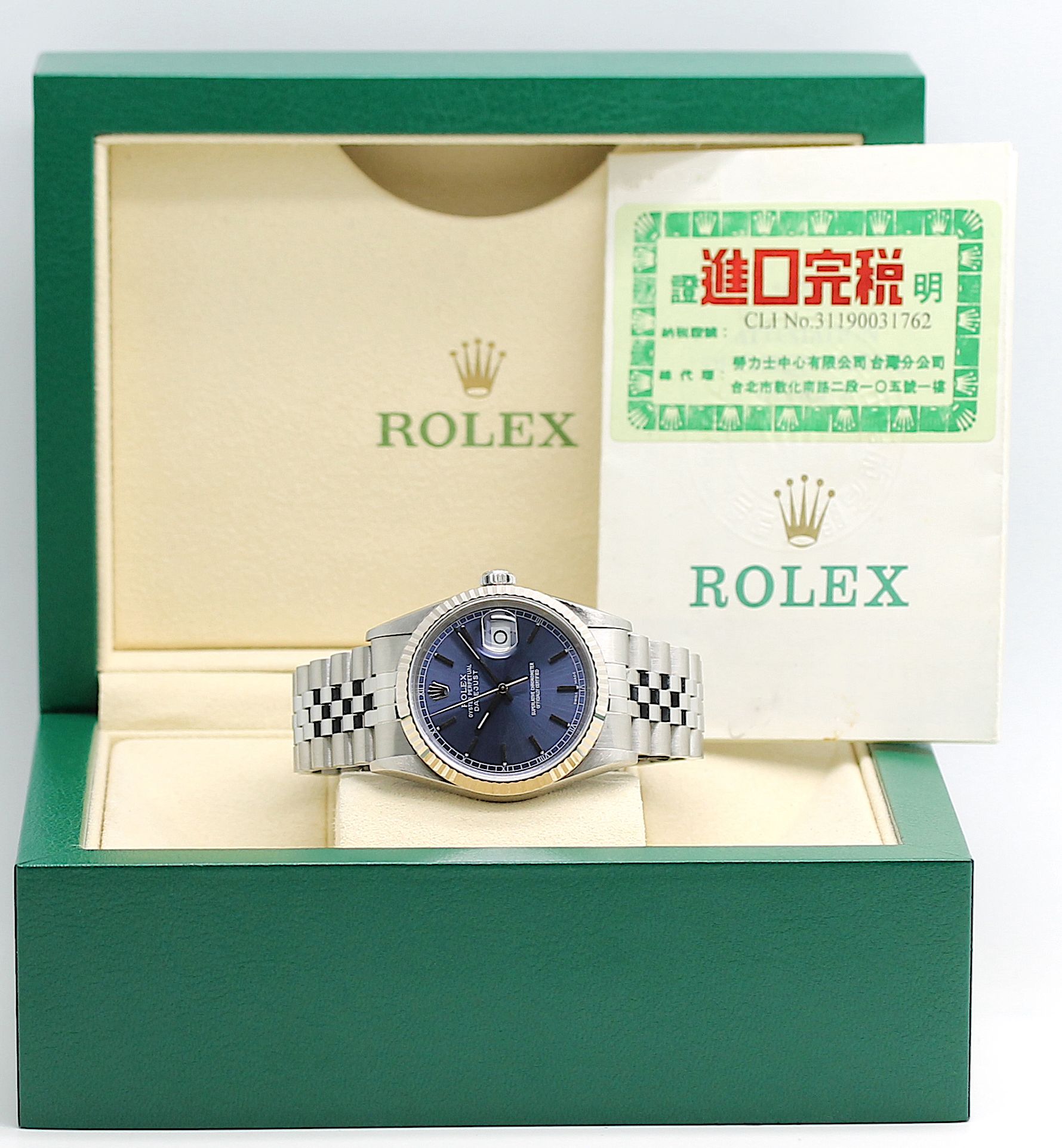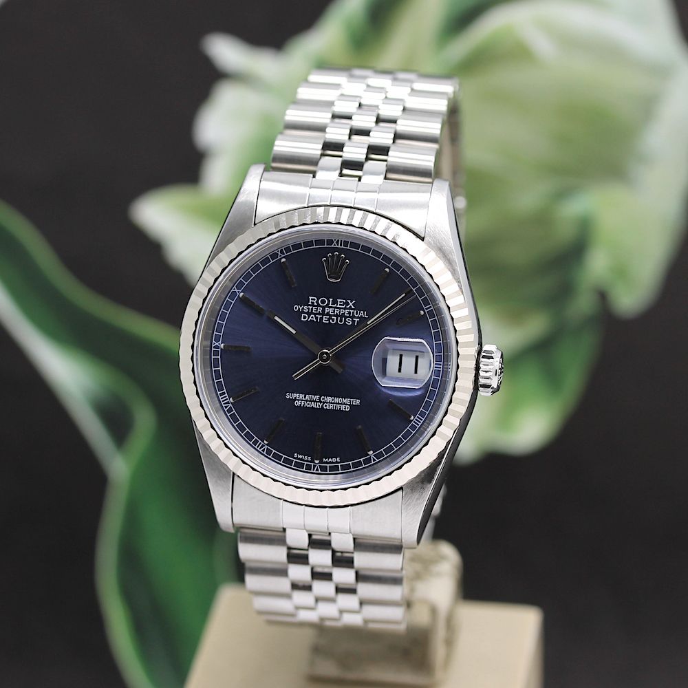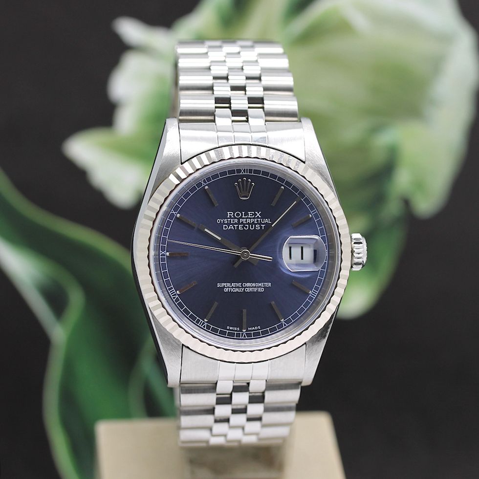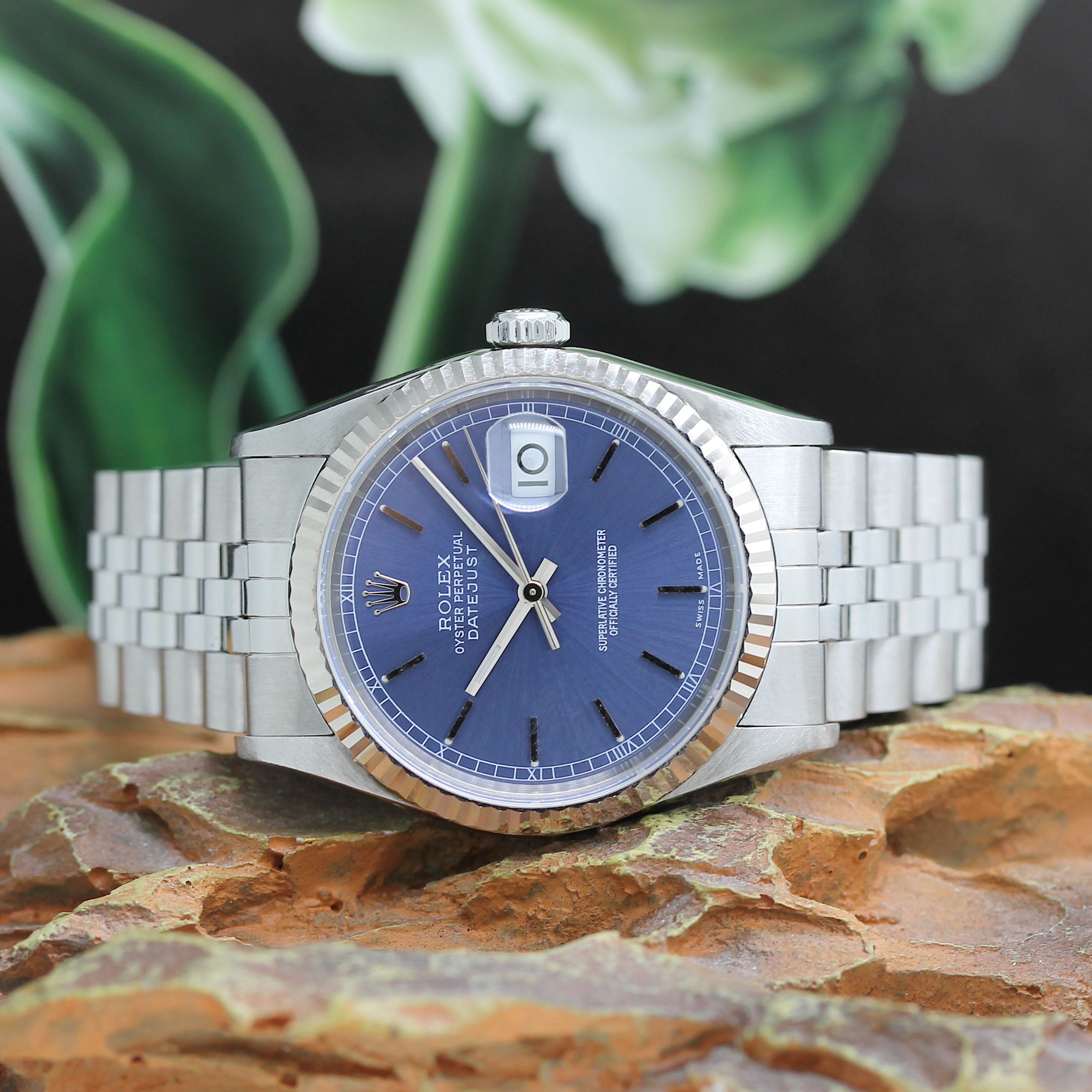 Die Uhr befindet sich in einem dem Alter entsprechend guten Zustand. Sie ist mit einem Automatikwerk ausgestattet. Eine Bereicherung für jeden Uhrensammler und Liebhaber. Alle Funktionen wurden vom Uhrmachermeister überprüft und für einwandfrei befunden. Das Werk wurde im April 2025 geölt und gereinigt. Das Jubileeband ist in Stahl und gebraucht, aber in einem noch sehr guten Zustand ( 16 cm Länge ohne Uhr gemessen ). Sie bieten hier auf eine Wunderschöne und klassische Armbanduhr der Spitzenklasse mit Wiedererkennungswert. Saphirglas . Das Zifferblatt ist blau - farbig. Die Lünette ist aus 18KT Weißgold und geriffelt. Die Datejust Uhr ist ca 25 Jahre alt, und wird in einem gebrauchten Zustand verkauft.